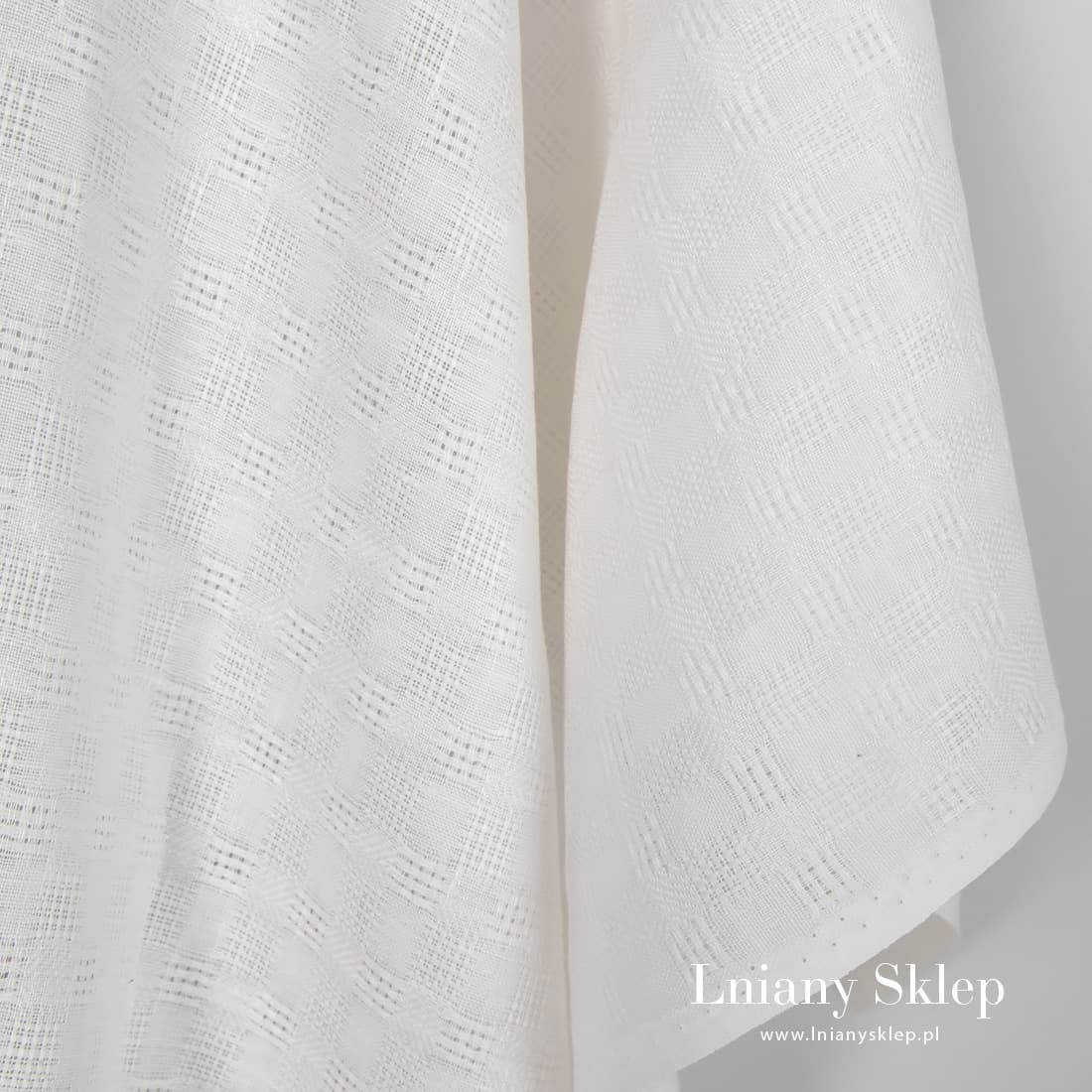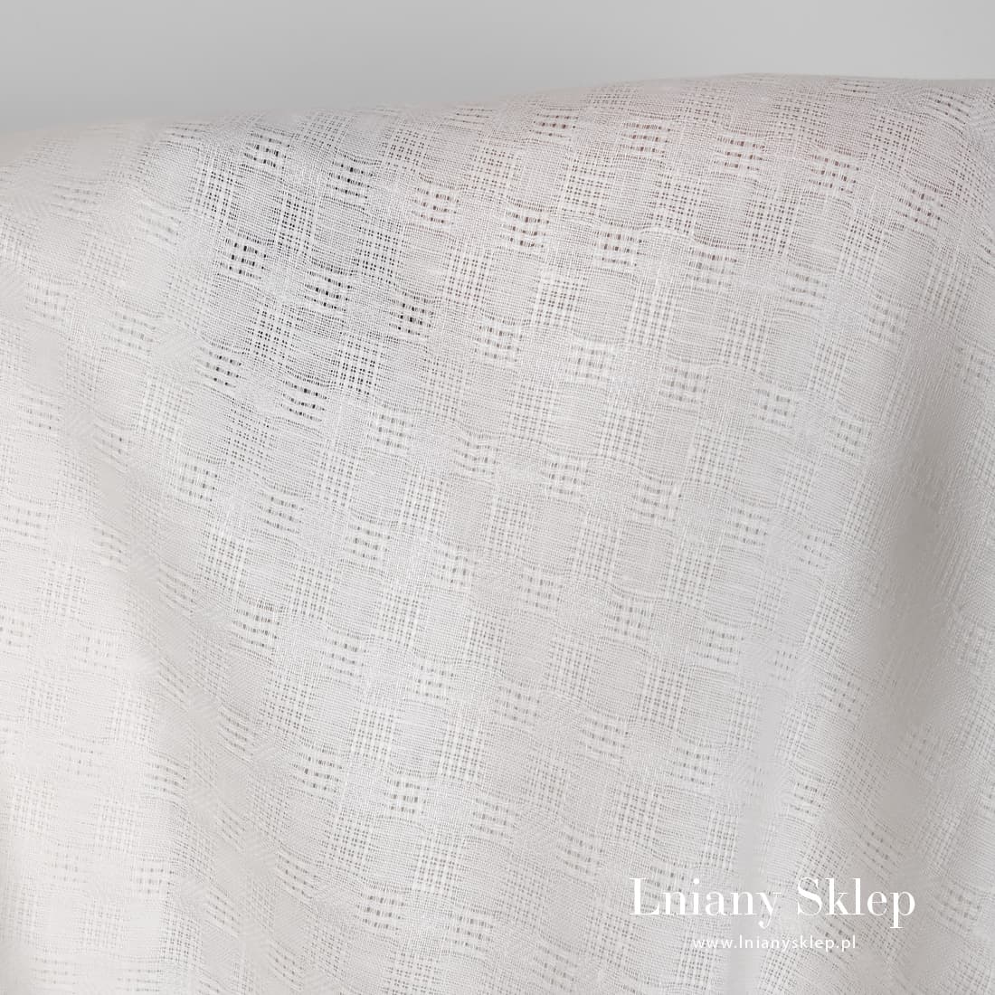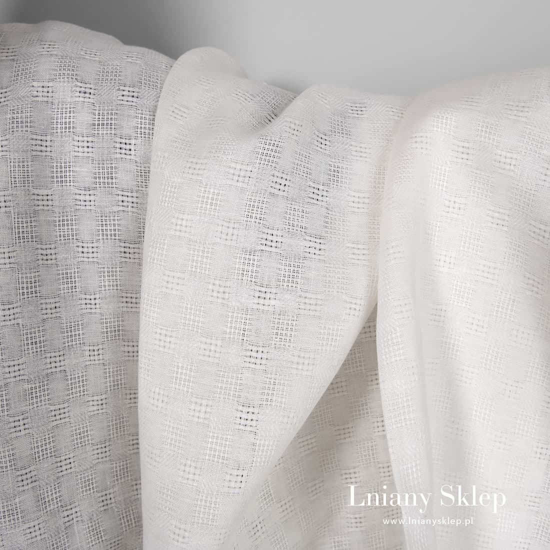 Biała w ażurową kratkę tkanina. Tkanina z mlecznobiałego lnu 100% na szycie obrusów, serwetek, zasłon, pościeli, odzieży i in.