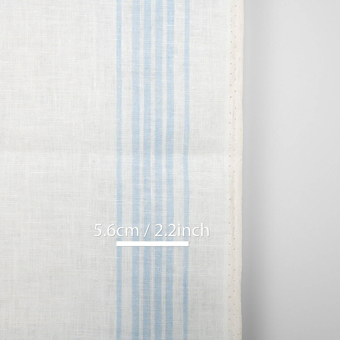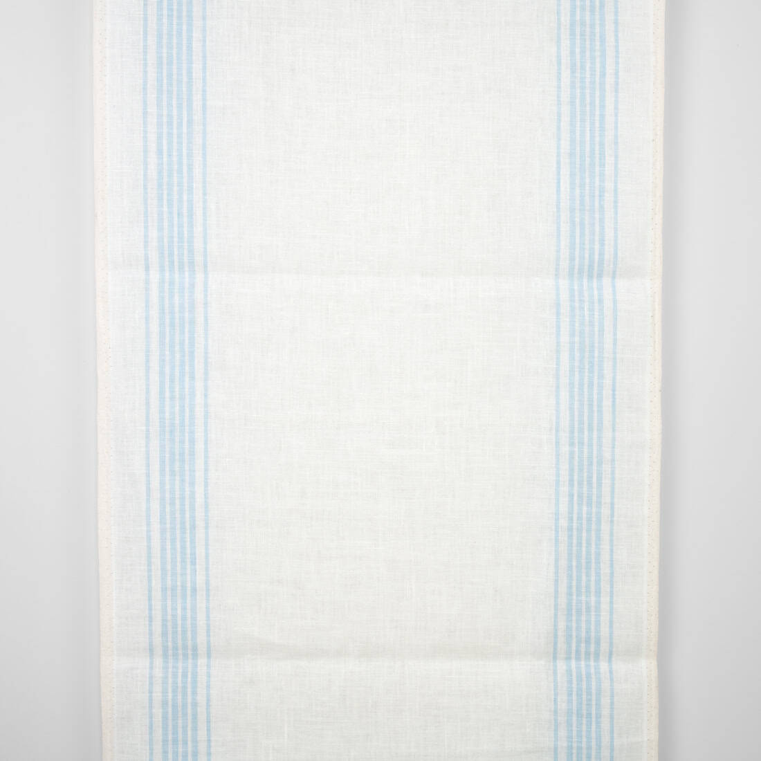 Biały gładki len ścierkowy w pastelowe paski wytkane pionowo. Tkanina z przędzy mlecznobiałej (lekko żółtawej) i delikatnie niebieskiej. Gęsta, mocna tkanina na ścierki kuchenne.