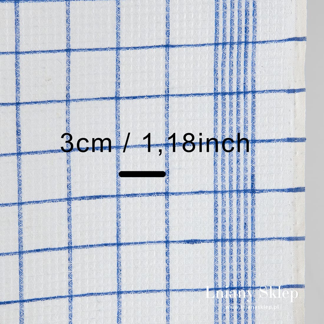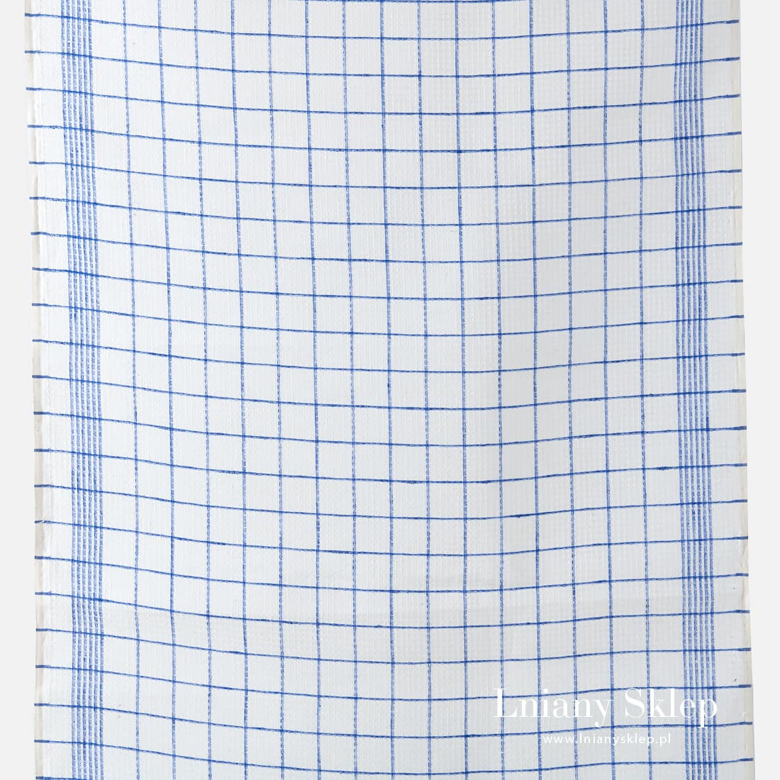 Biały waflowy len ścierkowy w niebieską kratkę. Mlecznobiałe (lekko żółtawe) tło wytkane zostało z przędzy mlecznobiałej w cieniutką niebieską kratkę. Gęsta tkanina świetnie wchłania wodę, pasuje na szycie ścierek kuchennych.