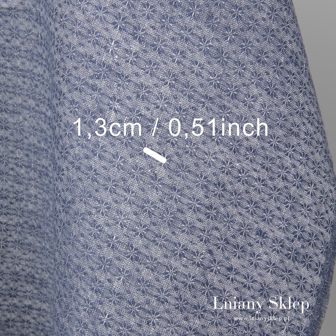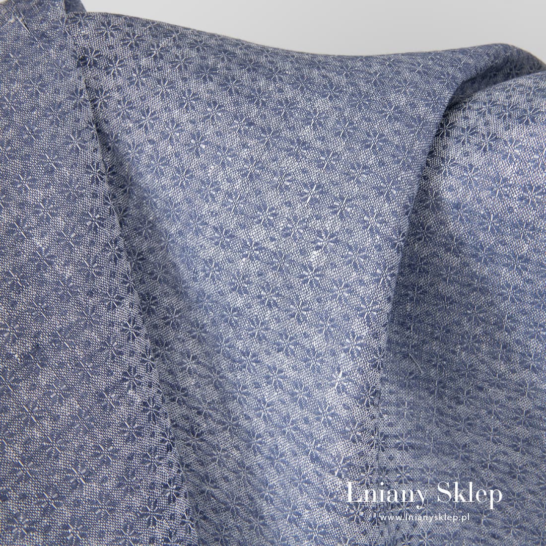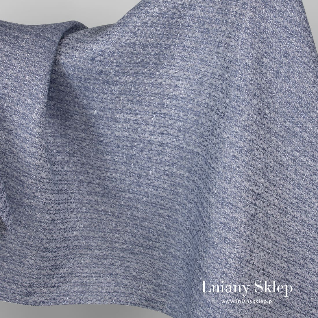 Błękitny len w gwiazdki wytkany z przędzy błękitnej o fioletowym odcieniu i białej. Wytkany wzór geometryczny przypomina gwiazdki albo śnieżynki. Tkanina mocna, gęsta pasuje na szycie odzieży i tekstyliów domowych.