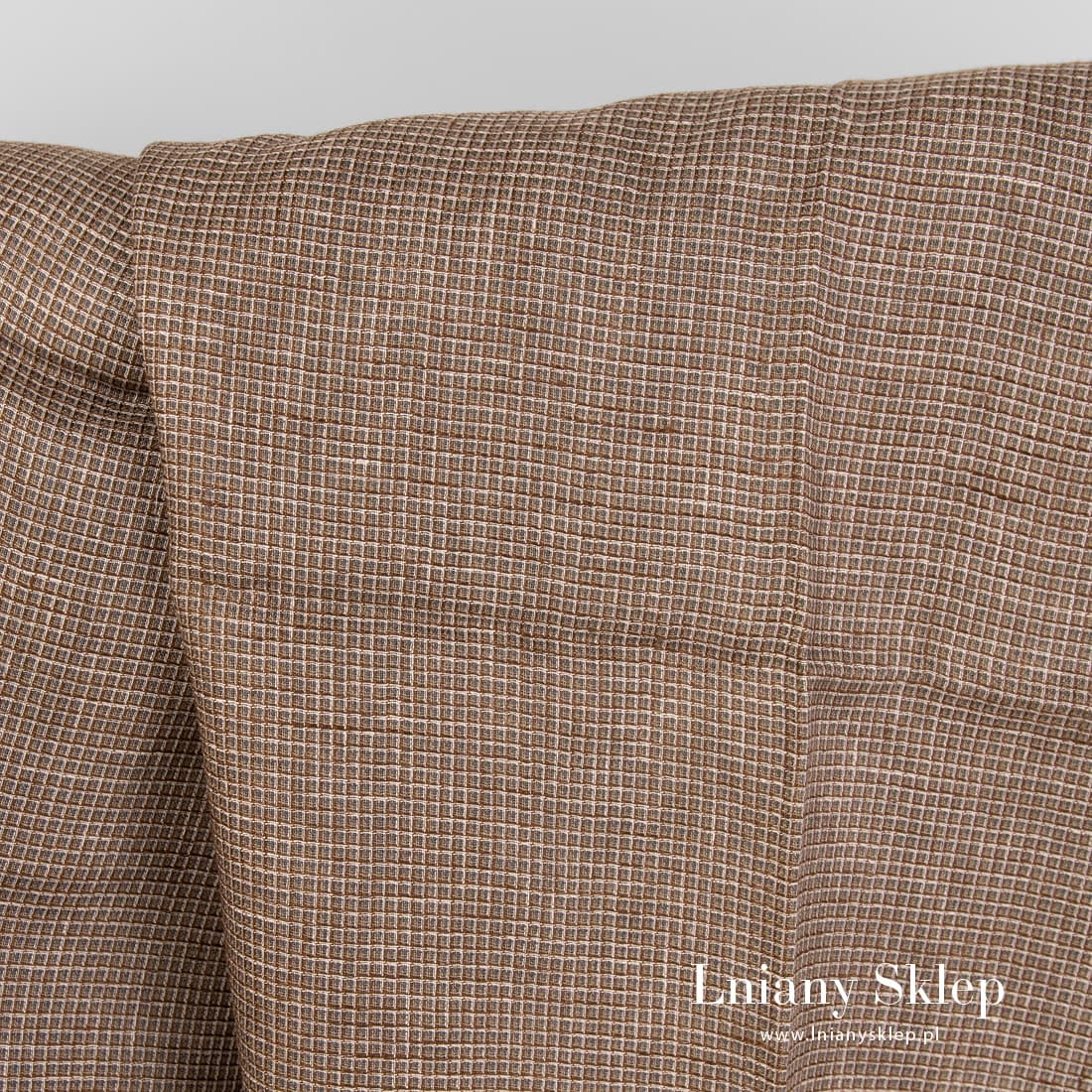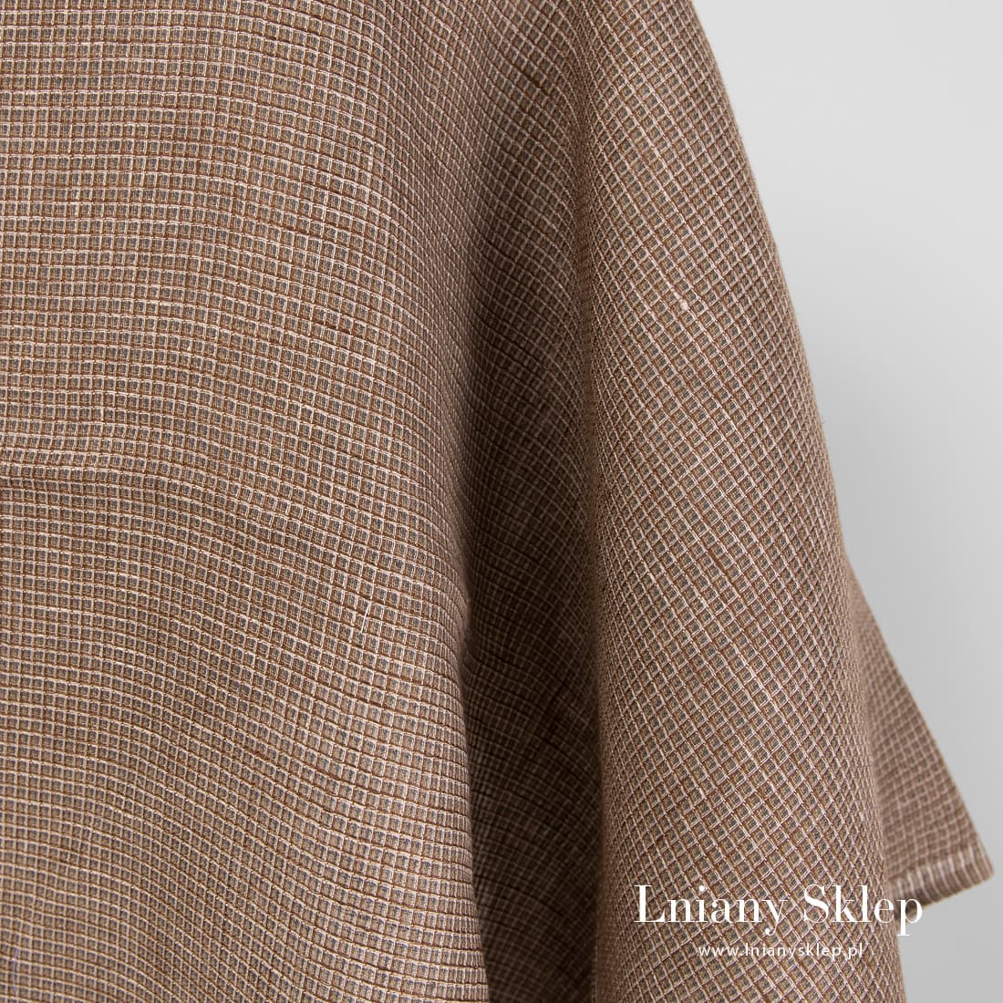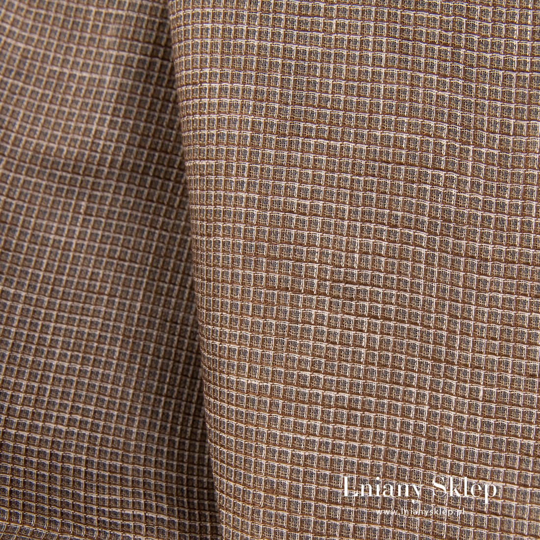 Brązowa tkanina lniana splot waflowy. Do wytkania tkaniny użyliśmy kilku przędz: rudej, piaskowej, szarej o kilku odcieniach. Lekka, gęsta, średnio gruba tkanina lniana. Pasuje na szycie ręczników, szlafroków, ścierek kuchennych i in.