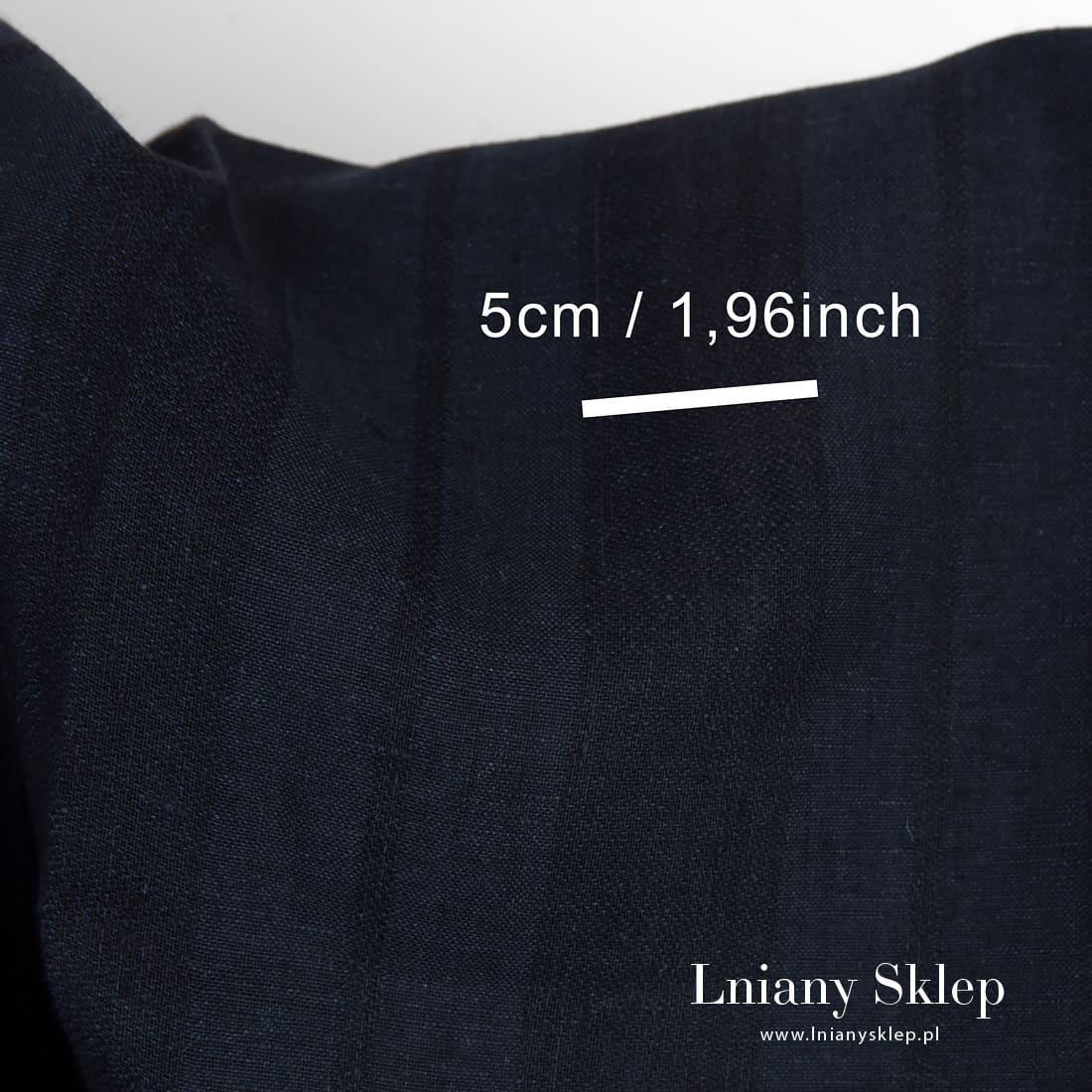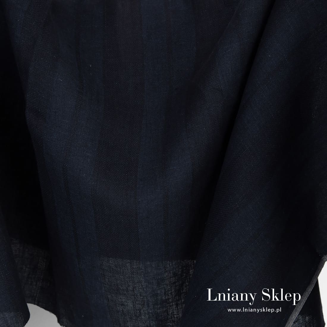 • Ciemna tkanina lniana w pasy granatowe i czarne.