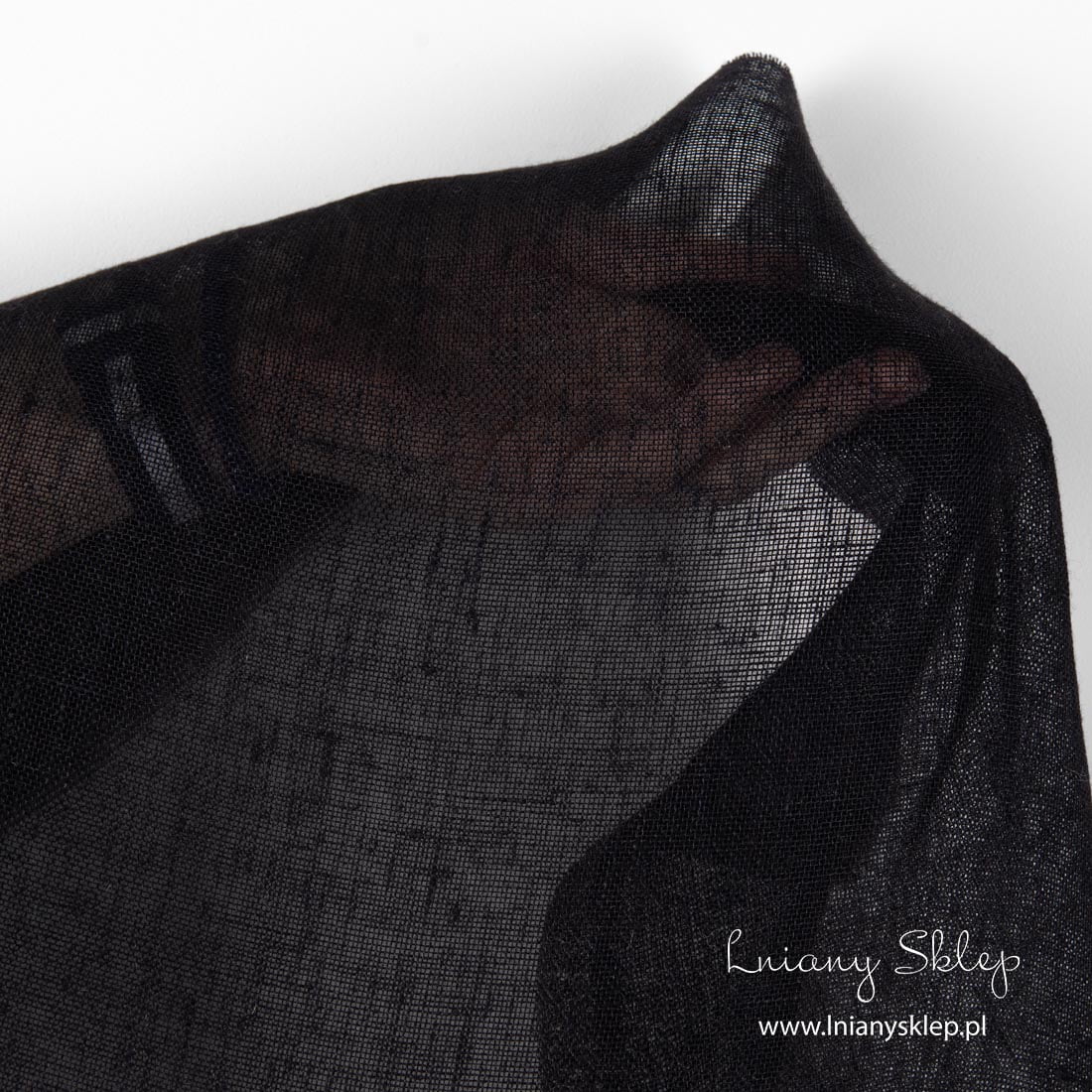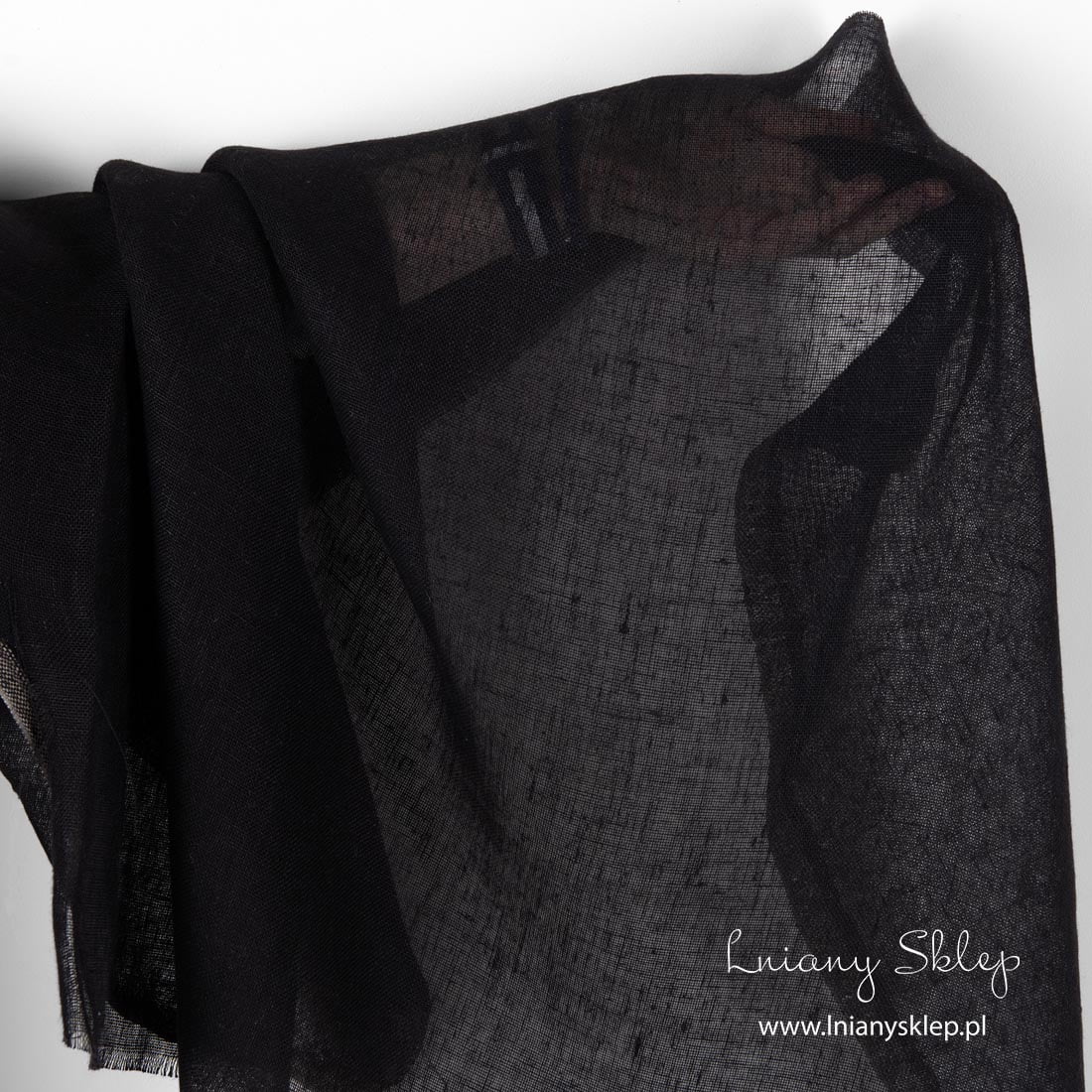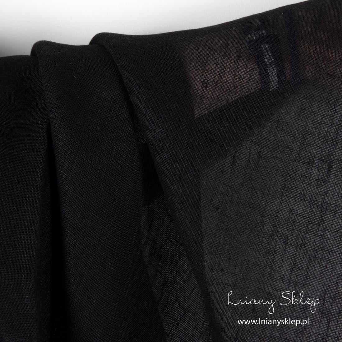 Czarna lniana tkanina prześwitująca. Przeźroczysta, lekka tkanina. Na szycie firanek i szaliczków i in.