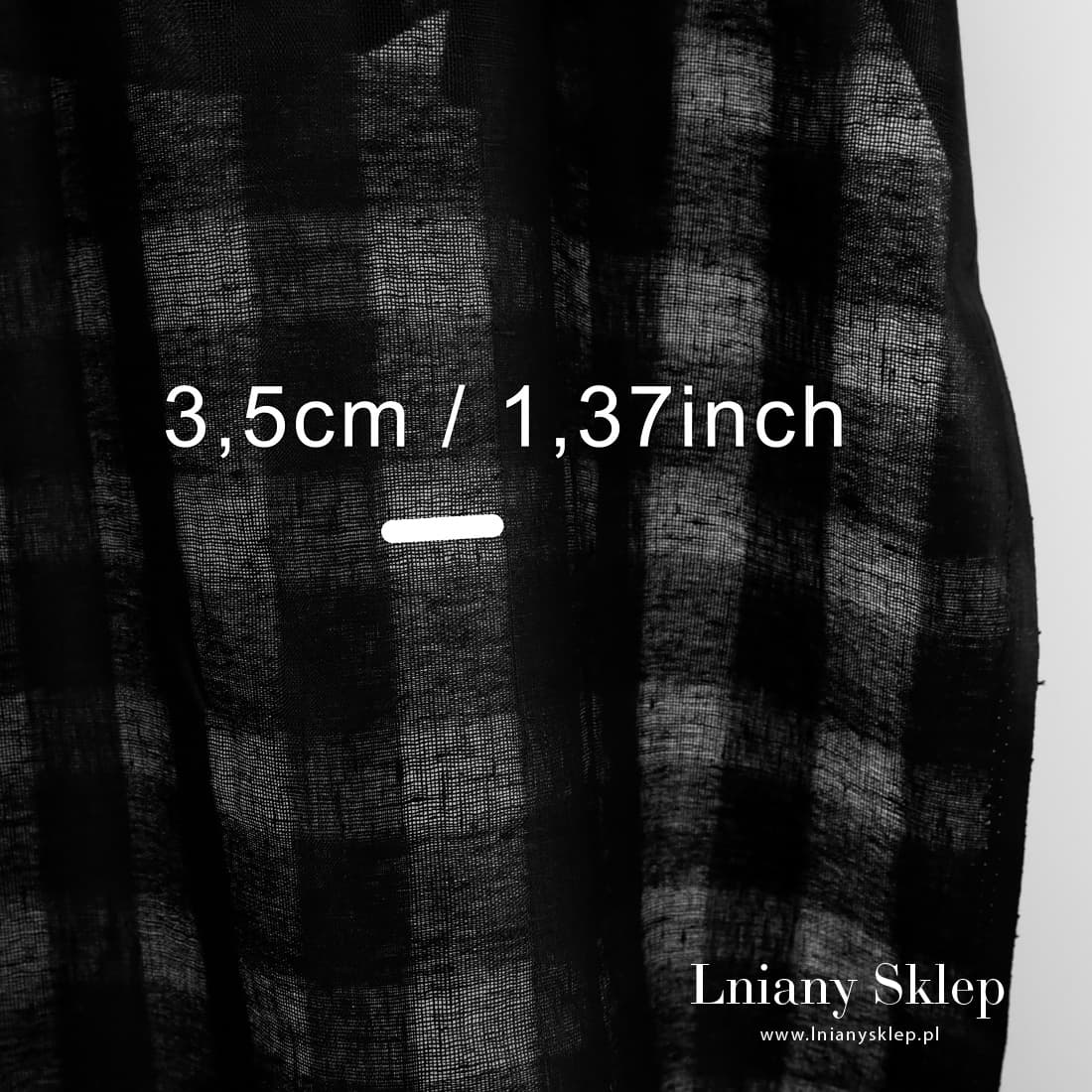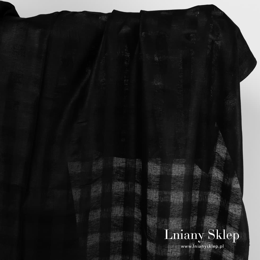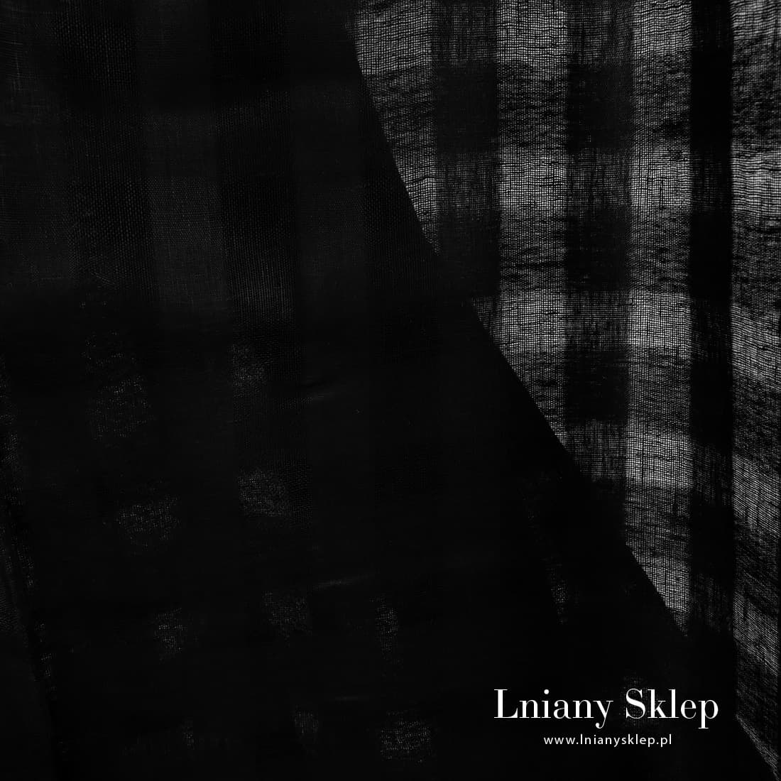 Czarny len w przeźroczystą kratkę. Tkanina wytkana w przecinające się i układające się w kratkę pasy o różnej gęstości. Len 100% na firanki, szaliczki i chusty.