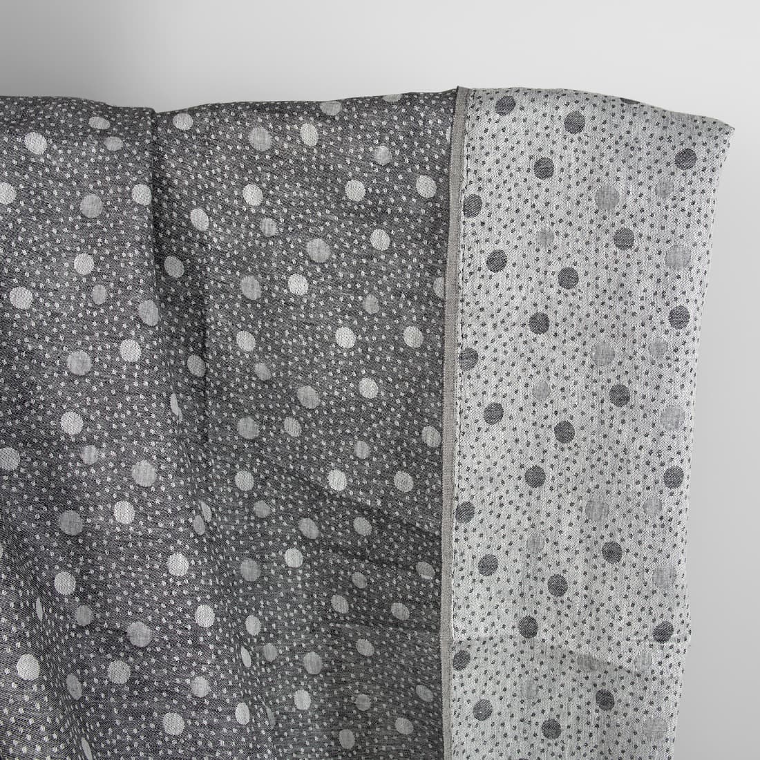 Średnio ciężki, wytrzymały, czarny len wytkany w żakardowy wesoły rzucik w ciapki. Do wytkania tej tkaniny użyto dwóch przędz: białej i czarnej. Obie strony tkaniny są piękne: jedna - czarna wytkana w białe ciapki, inna - biała wytkana w czarne ciapki.