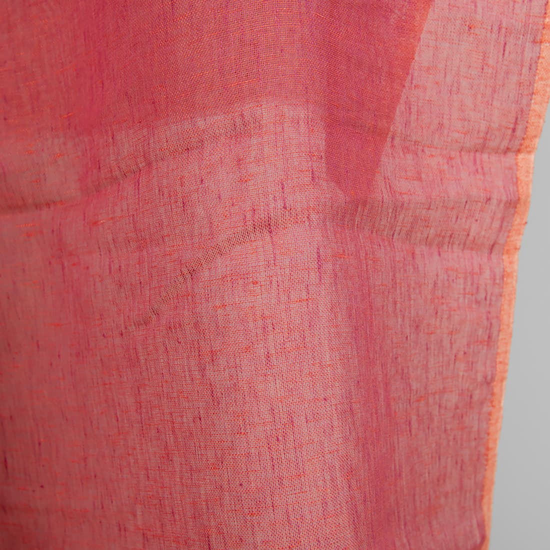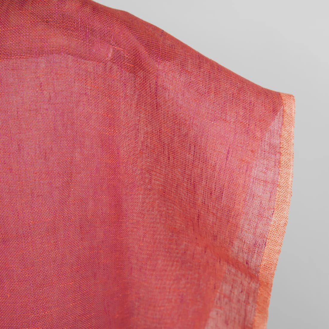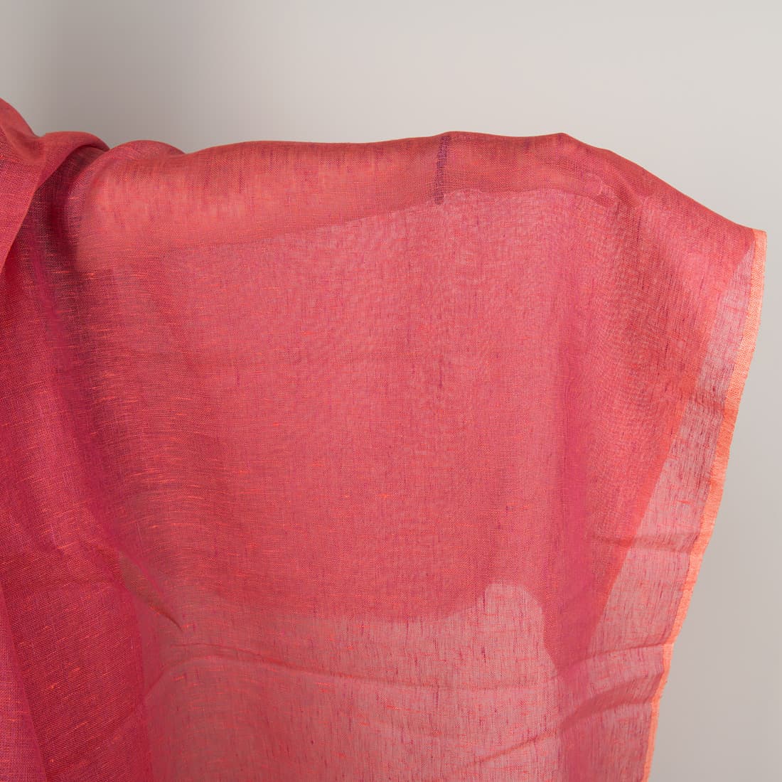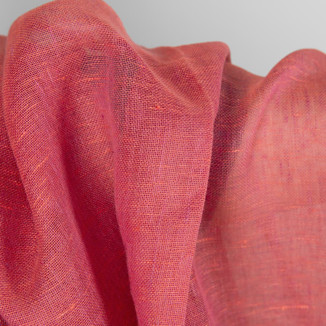 Tkanina lniana o barwie świeżej maliny wytkana w gładki splot płócienny z przędzy o barwie purpurowej i koralowej. Lekka, rzadko tkana, przeźroczysta tkanina lniana świetnie się sprawdzi jako tkanina na szycie firanek, szaliczków i różnych akcesoriów.