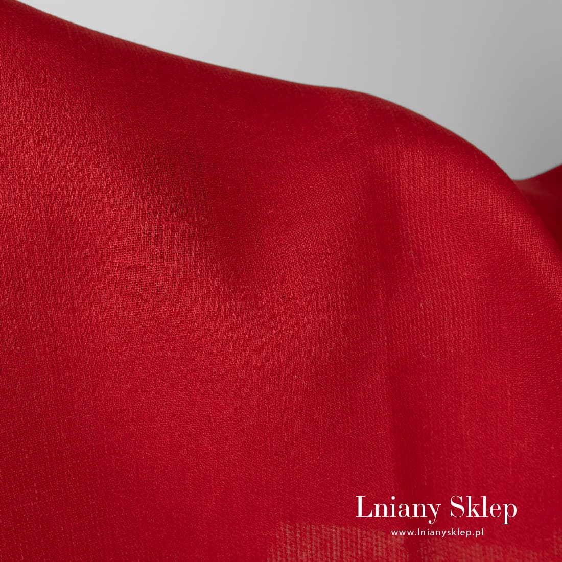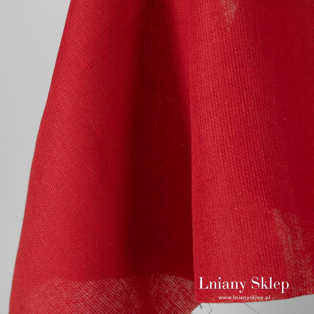 Czerwony len w drobniutki wzorek biegnący pionowo. Mocny, gęsty, dość lekki len 100% na szycie ubrań i tekstyliów domowych.
