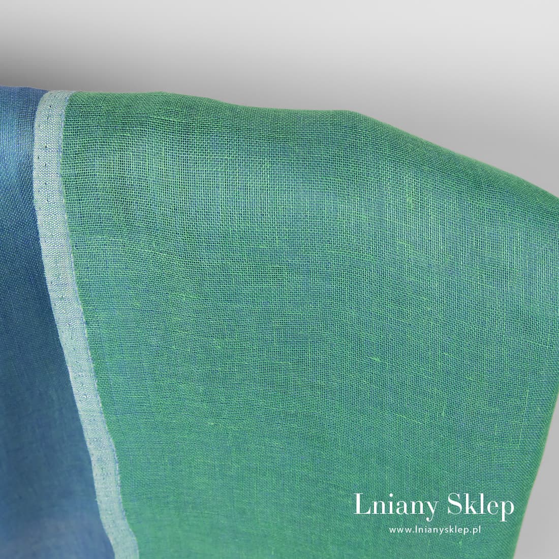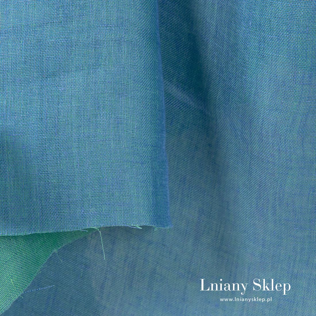 Dwustronna niebiesko - zielona tkanina lniana wytkana z niebieskiej i zielonej przędzy. Wykorzystaj projektując produkt obydwie strony tkaniny. Mocna, gęsta, średnio gruba tkanina wytkana dwuwarstwowo.