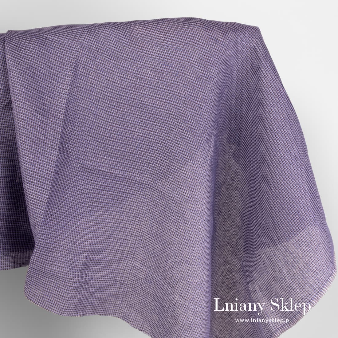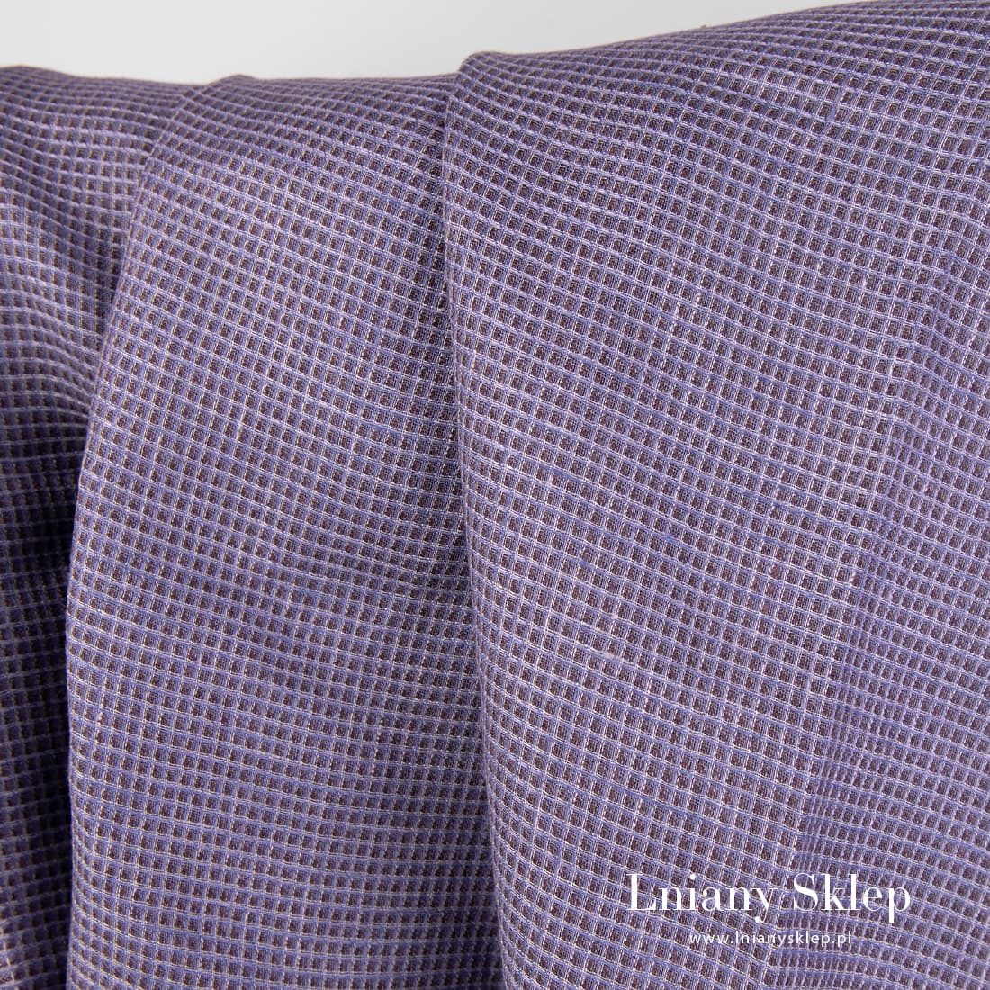 Fioletowa tkanina lniana splot waflowy. Do wytkania tkaniny użyliśmy kilku przędz o różnych odcieniach fioletu. Pasuje na szycie ręczników, szlafroków, ścierek kuchennych i in.
