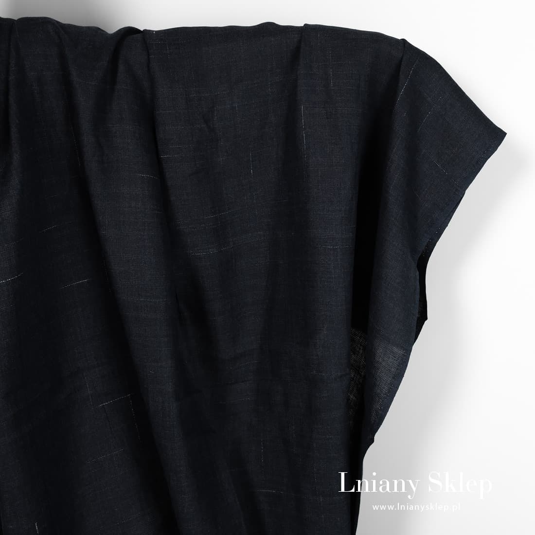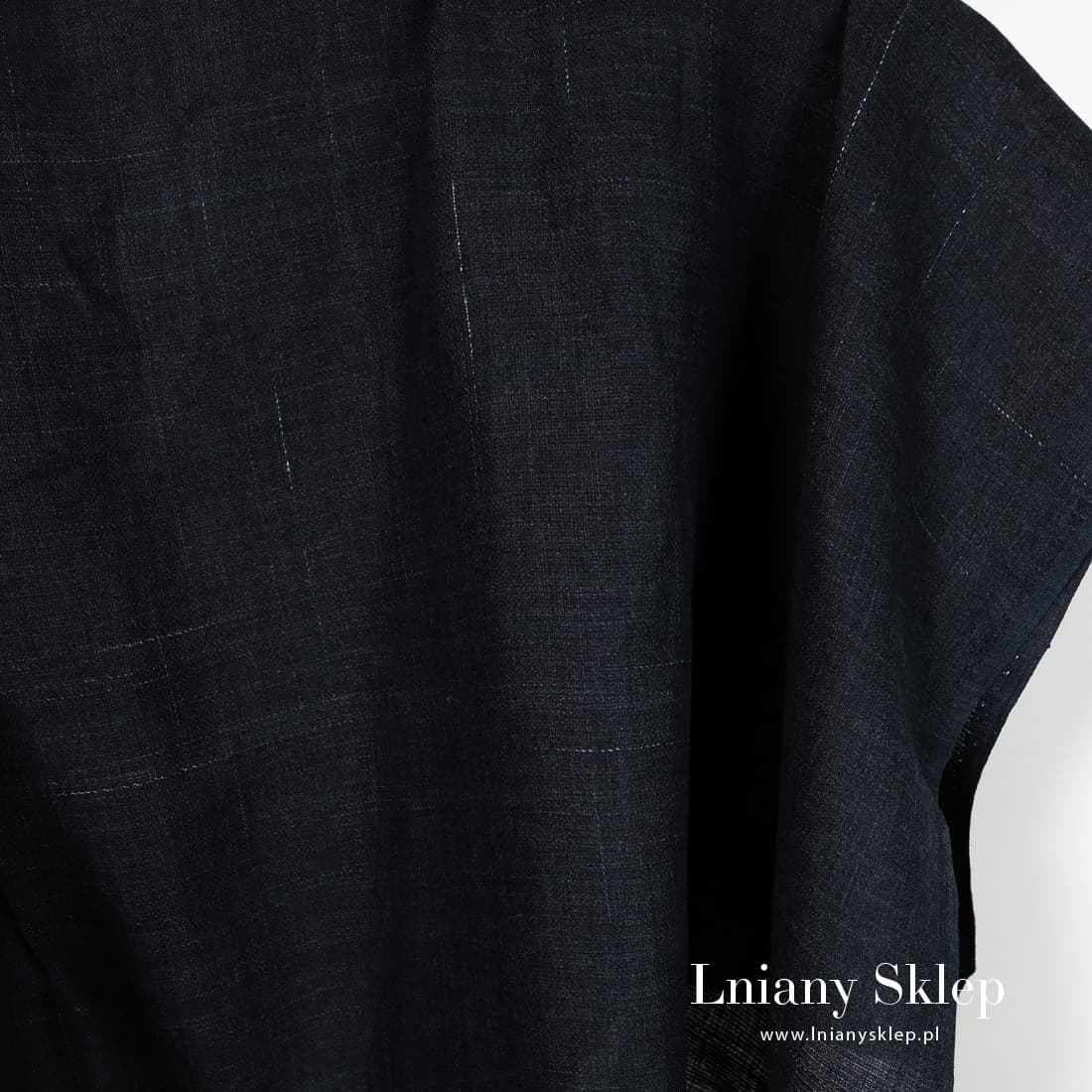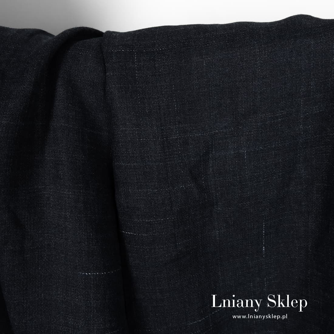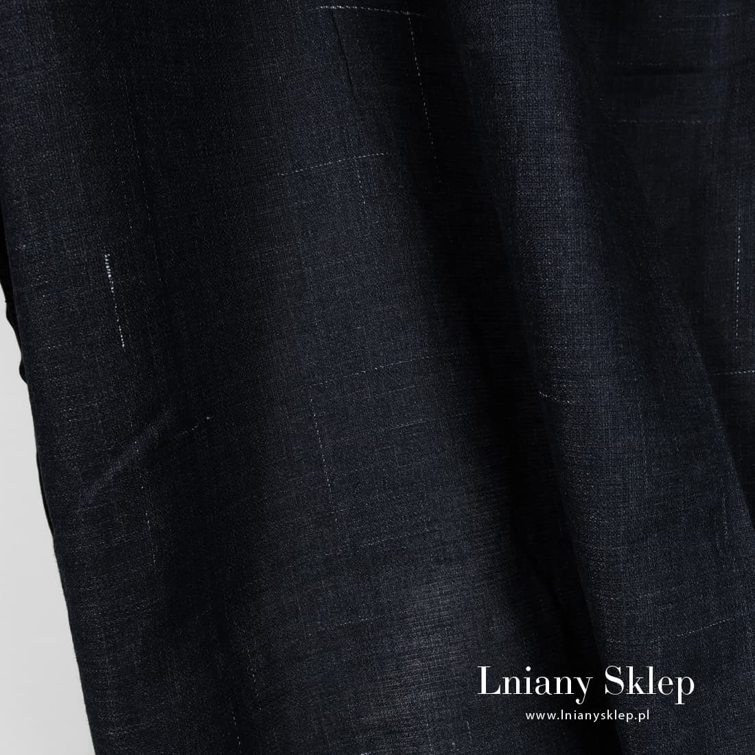 Granatowa lniana w białe prążki tkanina. Tkanina została wytkana z granatowej przędzy i ozdobiona prążkami z poliestru ułożonymi w przypadkowym porządku. Pasuje na szycie obrusów, serwetek, zasłon, pościeli, odzieży i in.