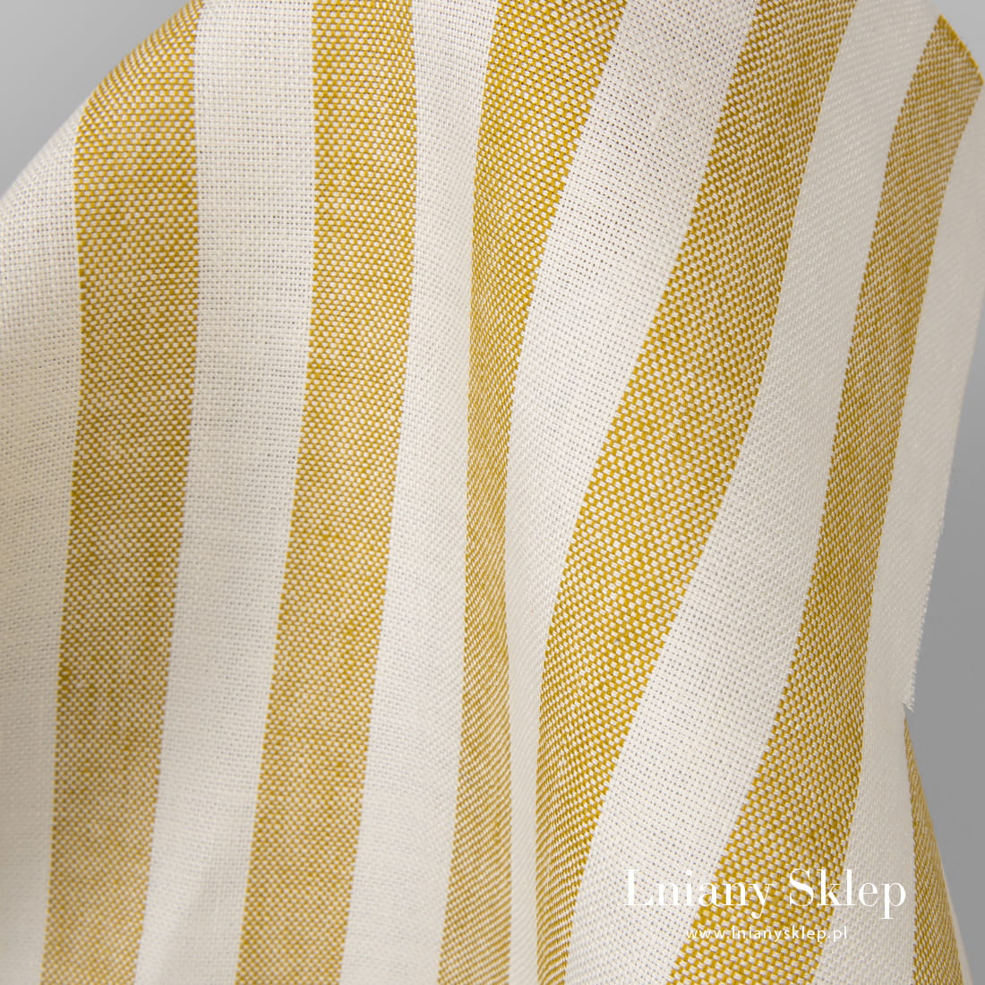 Gruby len w żółte pionowe pasy. Użyliśmy mlecznobiałą (lekko żółtawą) i żółtą przędze. Len 100% wytkany splotem „panama”: gruby, mocny, ciężki.