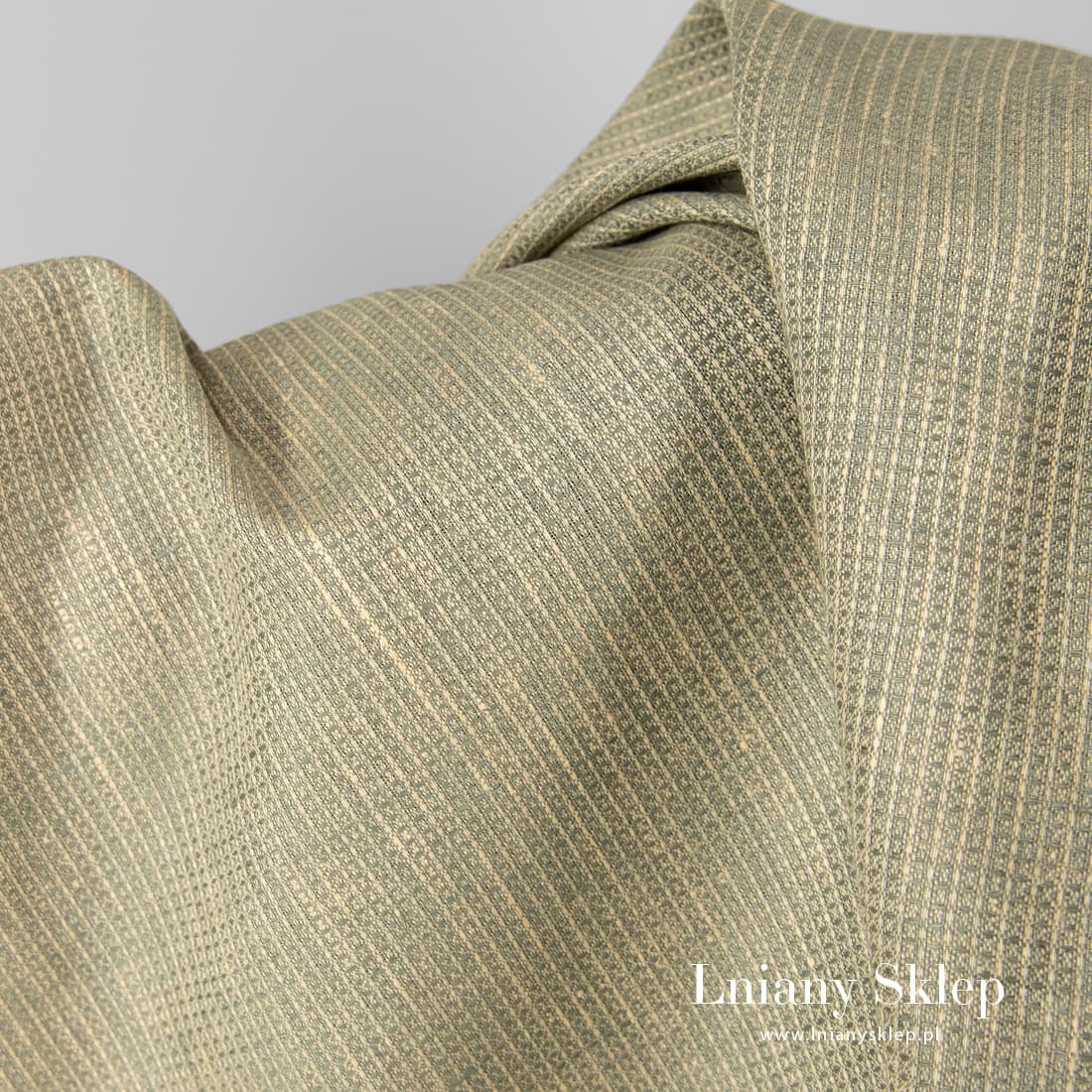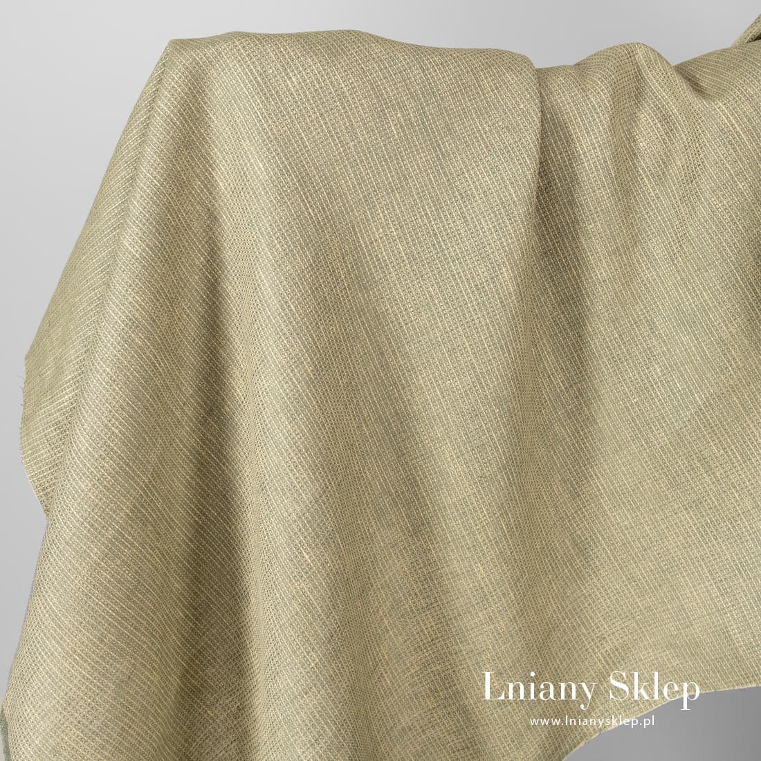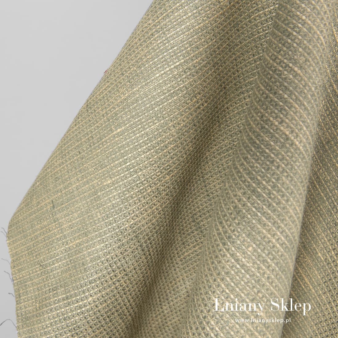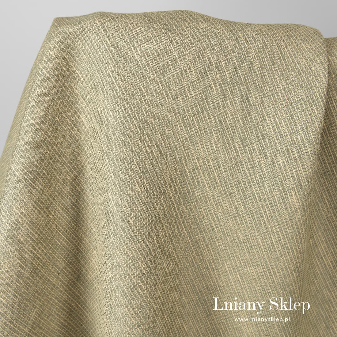 Jasna żółtawa tkanina lniana splot waflowy wytkana z przędzy żółtej i zielonej o szarym odcieniu. Splot waflowy stanie się wypukły dopiero po praniu. Len 100% na szycie szlafroków oraz kąpielowych i kuchennych ręczników.