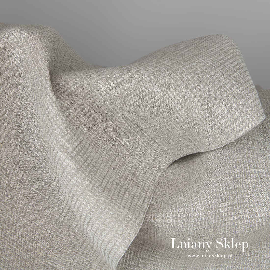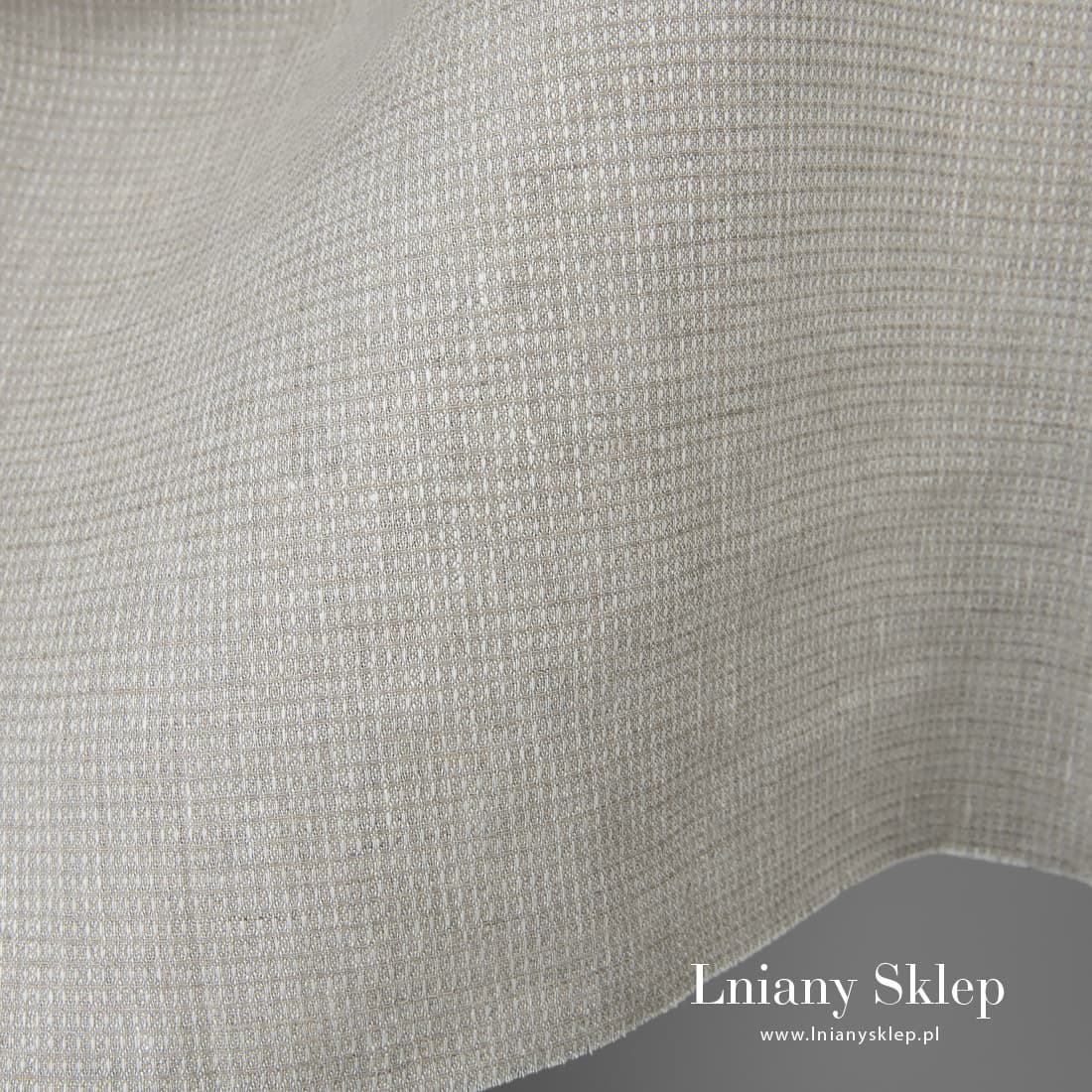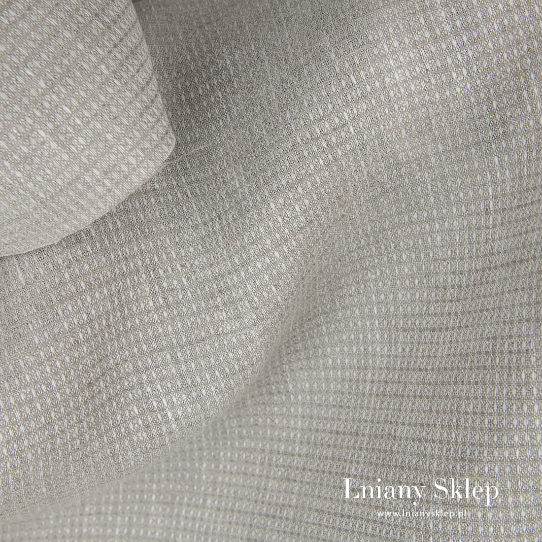 Jasnoszara, 100% lniana tkanina wytkana w małe wypukłe okienka - wzór waflowy. Do wytkania tej tkaniny użyto przędzy białej i lekko szarej (kolor naturalnego lnu). Po praniu tkanina jeszcze lepiej będzie wchłaniała wodę, ponieważ stanie się bardziej miękka i puszysta, a wzór waflowy - bardziej wypukły.