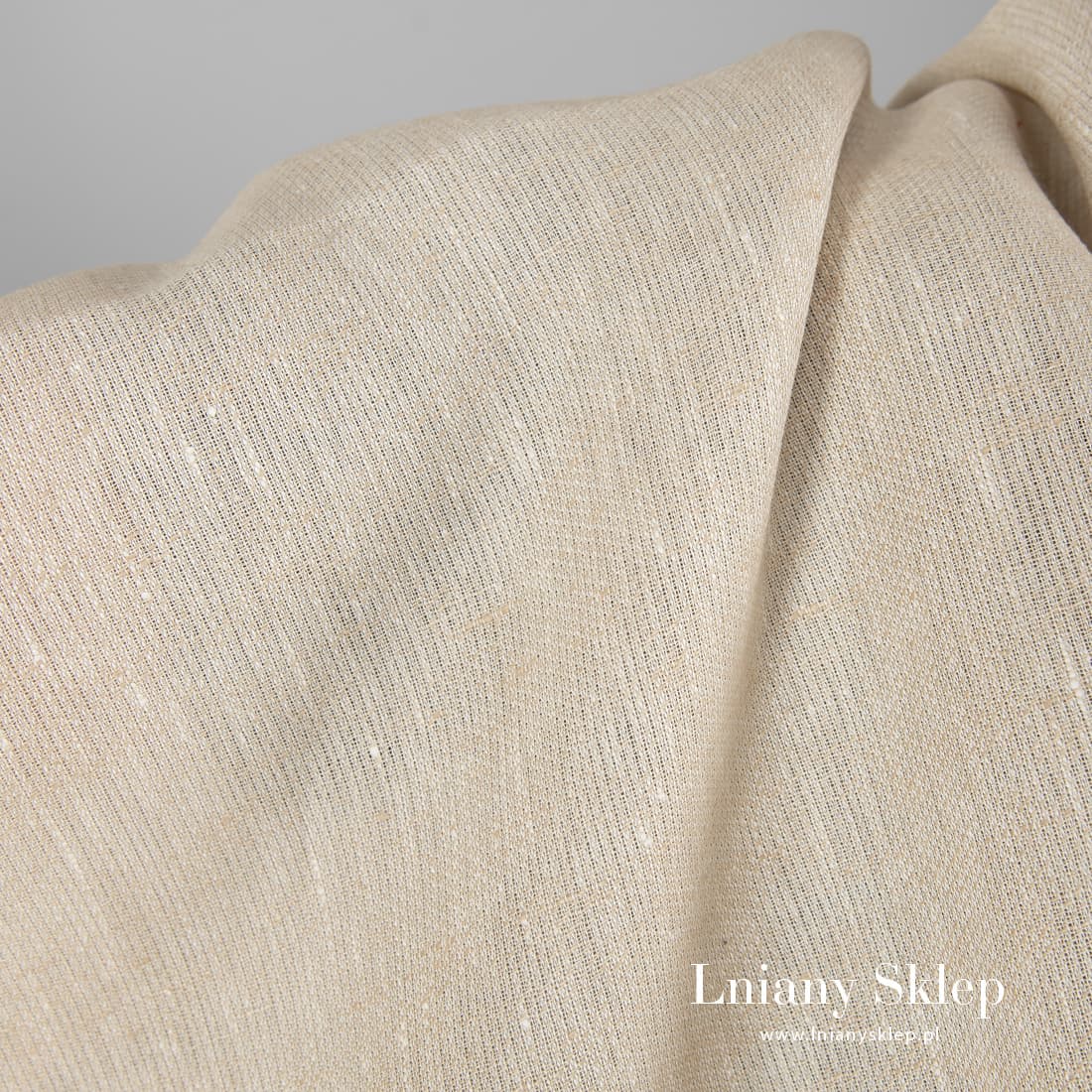 Jasny piaskowy len wytkany w pionowo biegnący drobniutki wzorek z przędzy białej i piaskowej. Mocny, gęsty, dość lekki len na szycie ubrań i tekstyliów domowych.