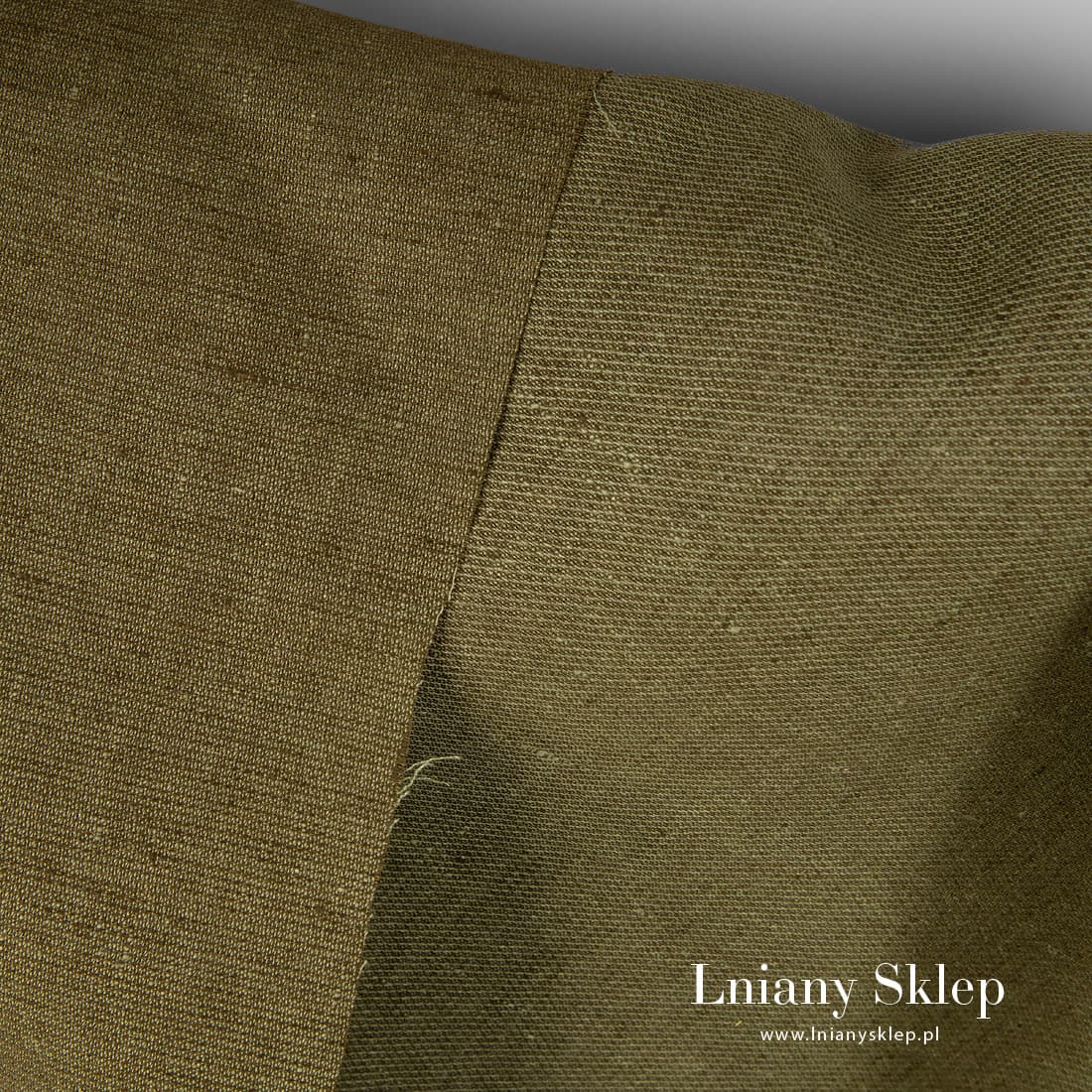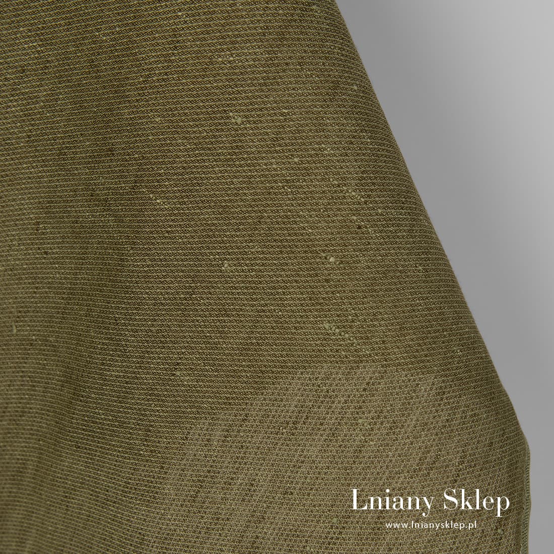 Khaki tkanina lniana w drobny wzorek z przędzy khaki (kolor mchu) i zielonej o szarym odcieniu. Mocna, gęsta, średnio gruba tkanina na szycie odzieży, produktów konfekcji domowej i in.