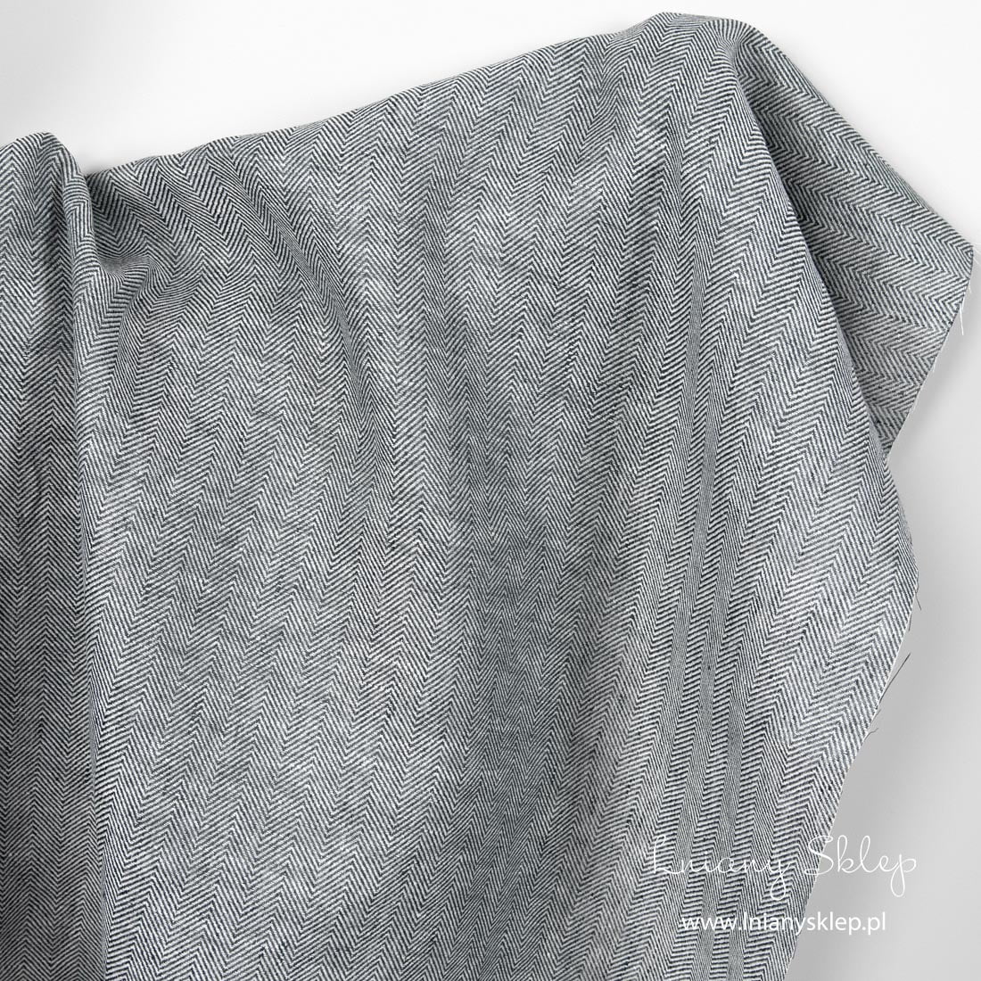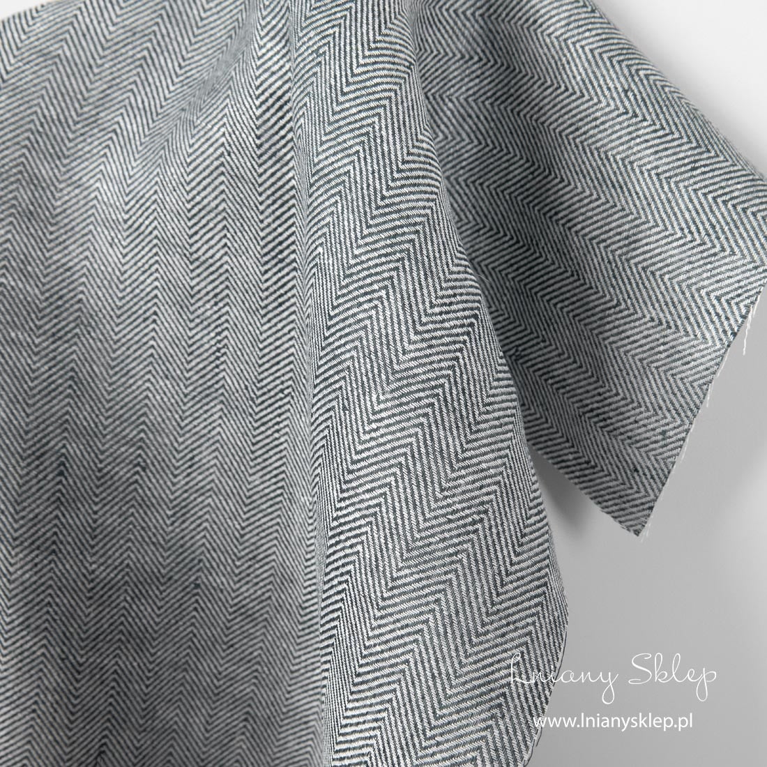 Len granatowa i biała jodełka. Gęsto wytkana, wytrzymała tkanina na szycie odzieży, zasłon, narzut na łóżka, poszewek dekoracyjnych na poduszki, fartuchów i in. produktów.
