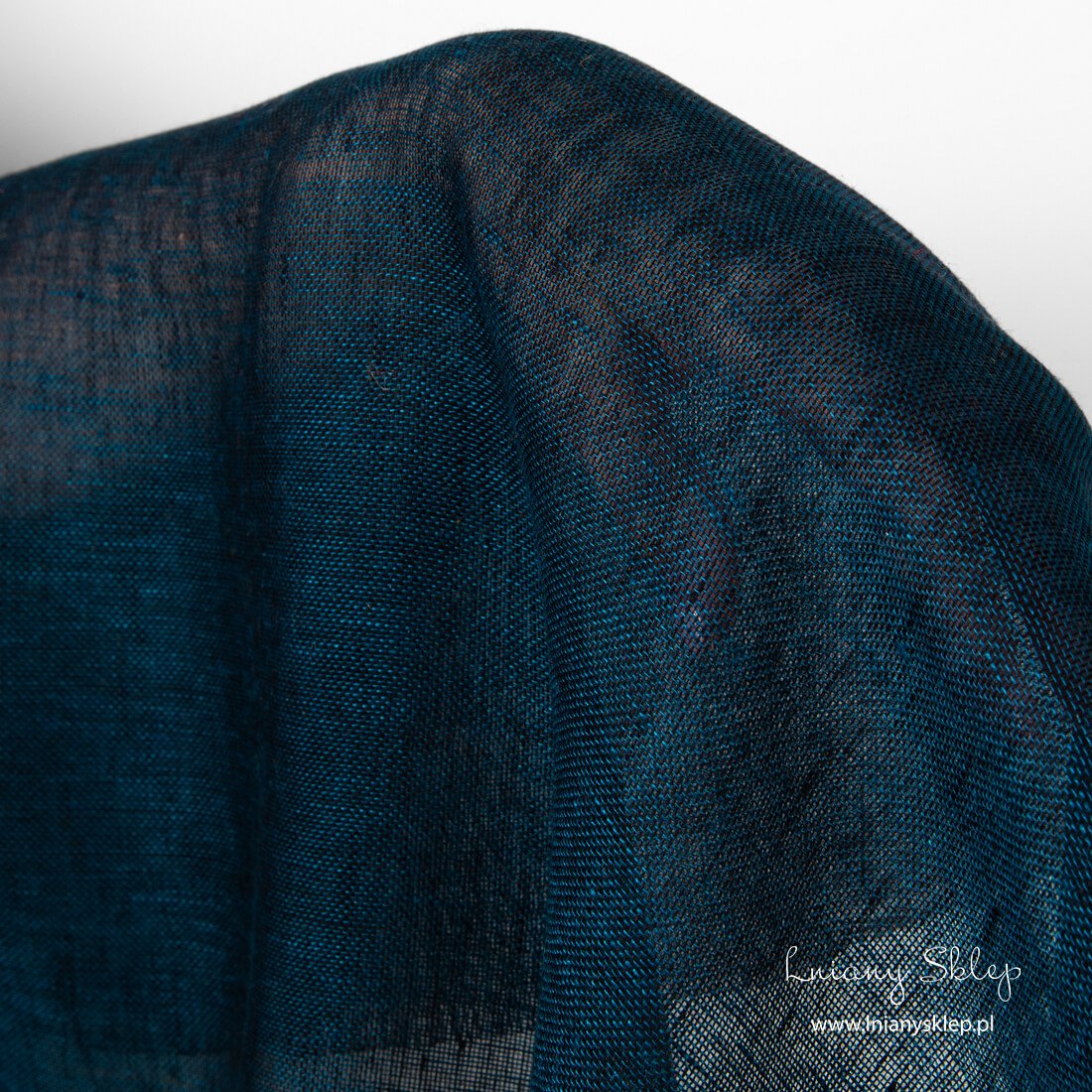 Len przeźroczysty czarny i turkusowy. Tkanina wytkana z przędzy czarnej i turkusowej. Rzadko tkana, przeźroczysta tkanina na firanki i prześwitujące akcesoria.