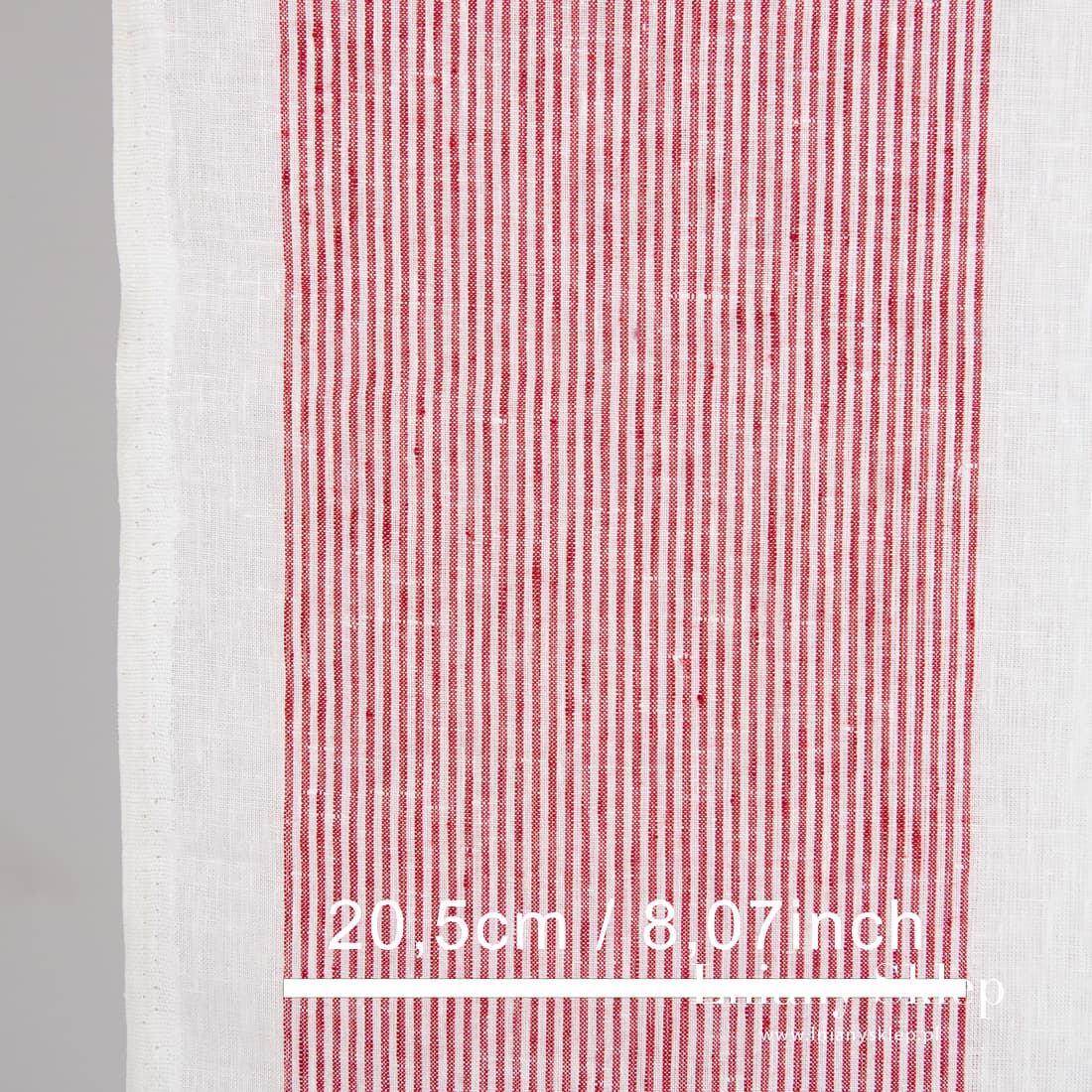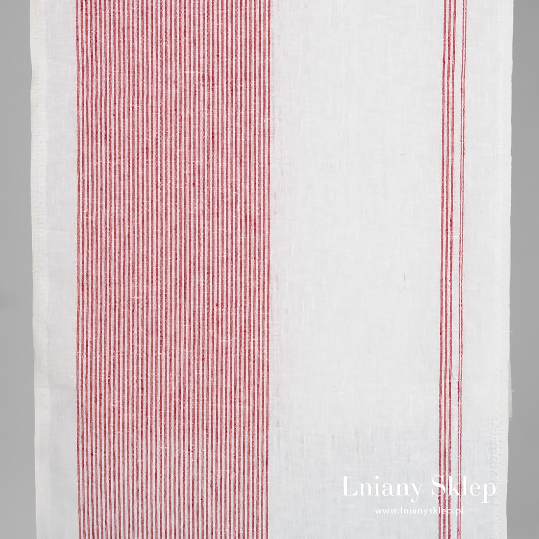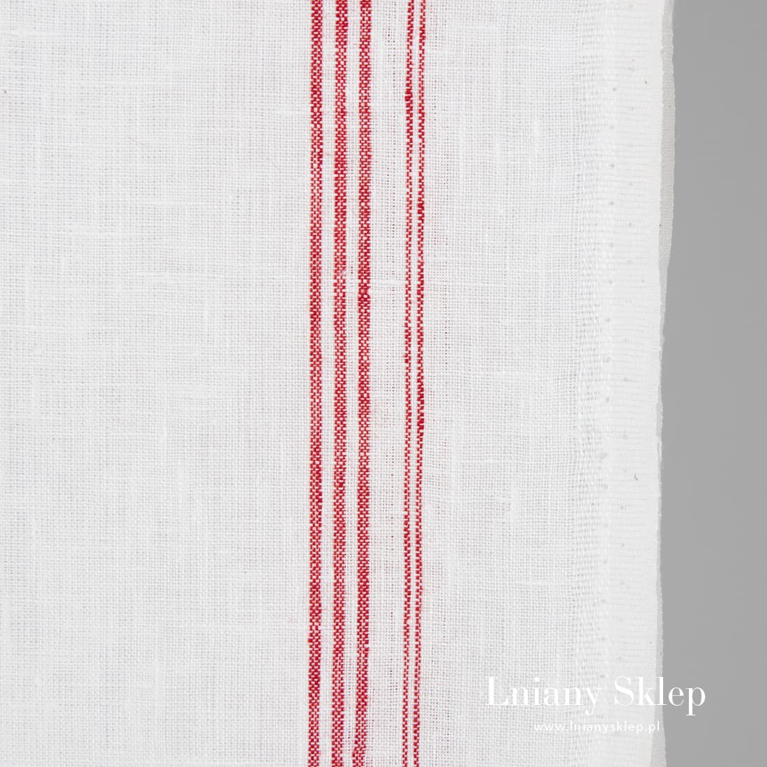 Len ścierkowy w czerwone paski wytkane pionowo na mlecznobiałym (lekko żółtawym) tle. Mocna, gęsto wytkana tkanina szeroka 50cm – idealna na ścierki kuchenne.