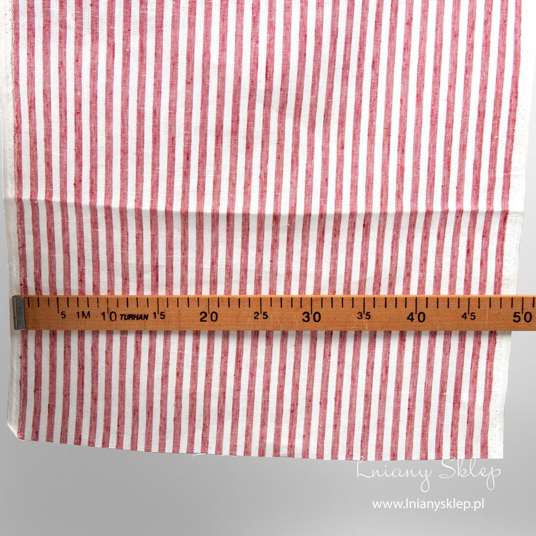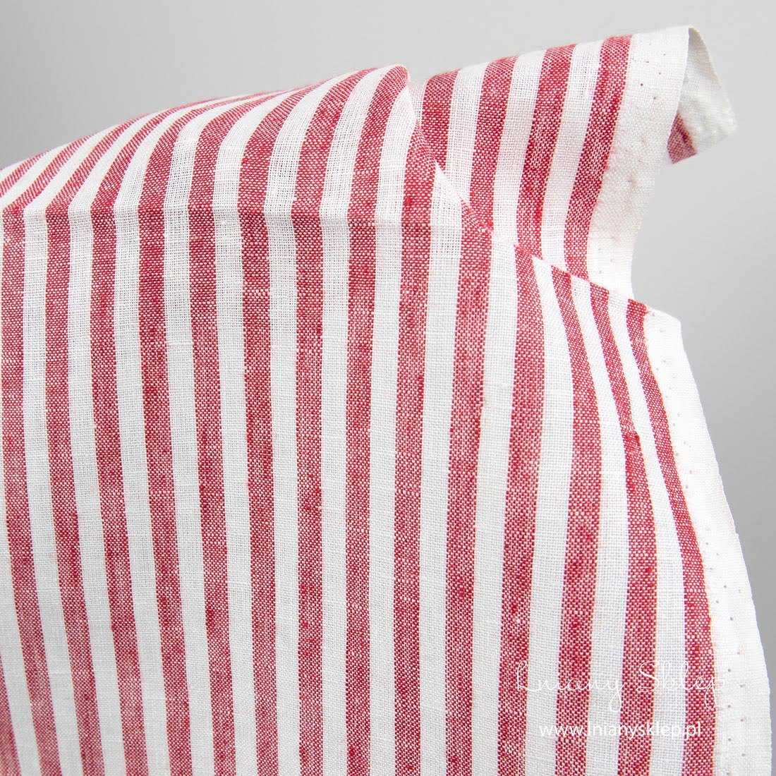Len ścierkowy w czerwone pasy wytkany został z przędzy mlecznobiałej (żółtawej) i czerwonej. Szerokość pasków – 7 mm. Mocna, gęsto wytkana tkanina na szycie ścierek kuchennych.