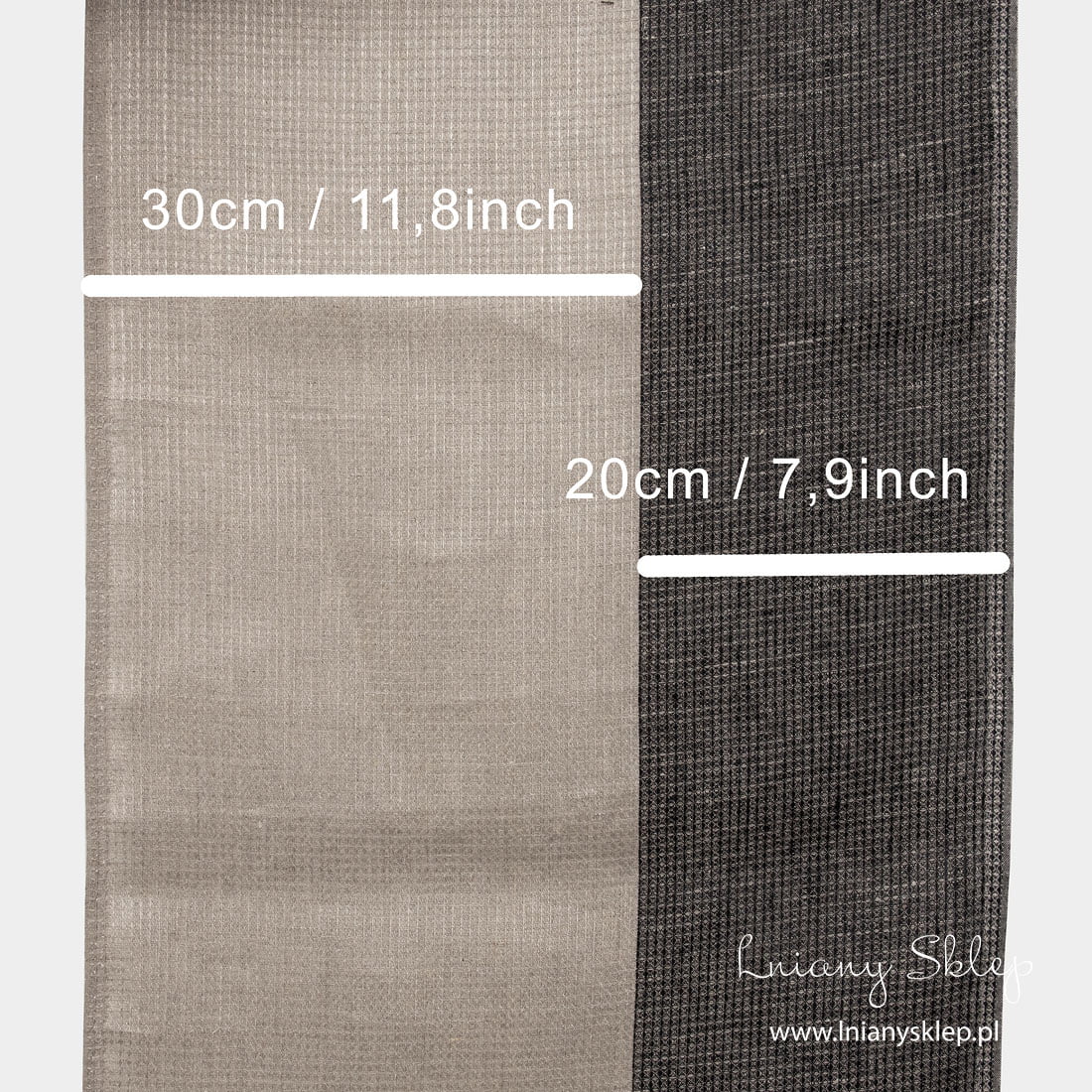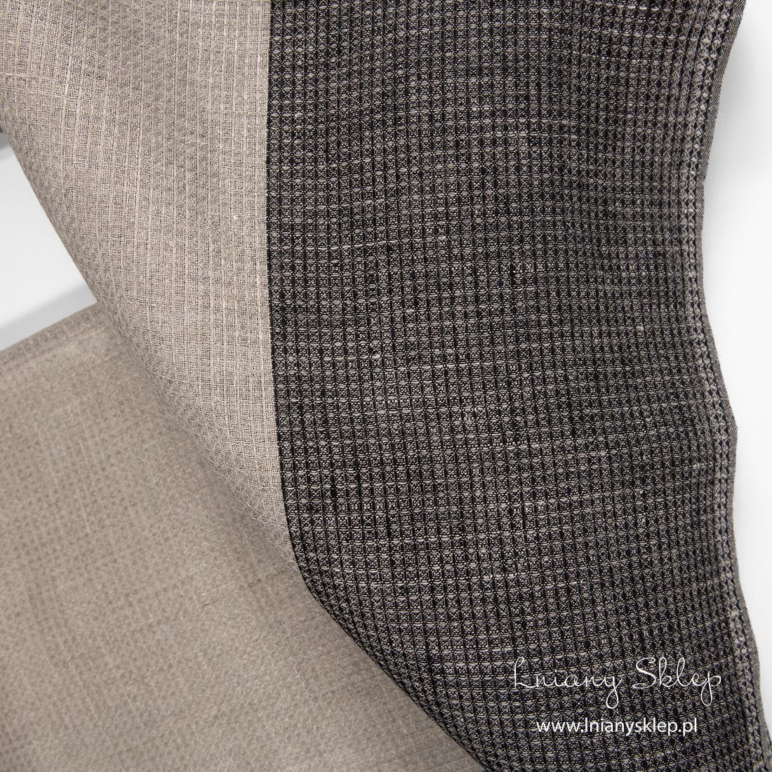 Len ścierkowy w pasy czarne i szare. Tkanina wytkana splotem waflowym z przędzy czarnej i niebarwionej (szarej o piaskowym odcieniu). Splot waflowy po pierwszym praniu stanie się wypukły, a sama tkanina nieco się ściągnie. Tkanina na szycie ścierek kuchennych. Szerokość 50 cm.