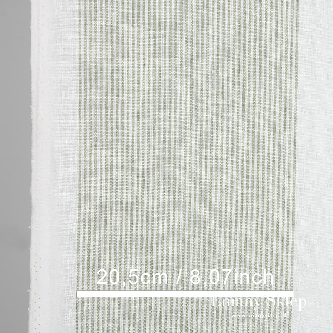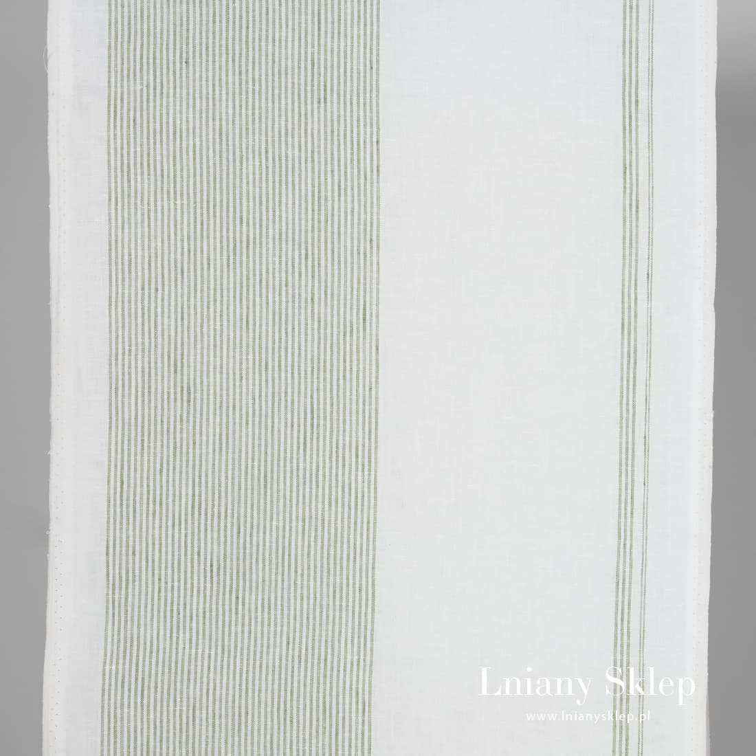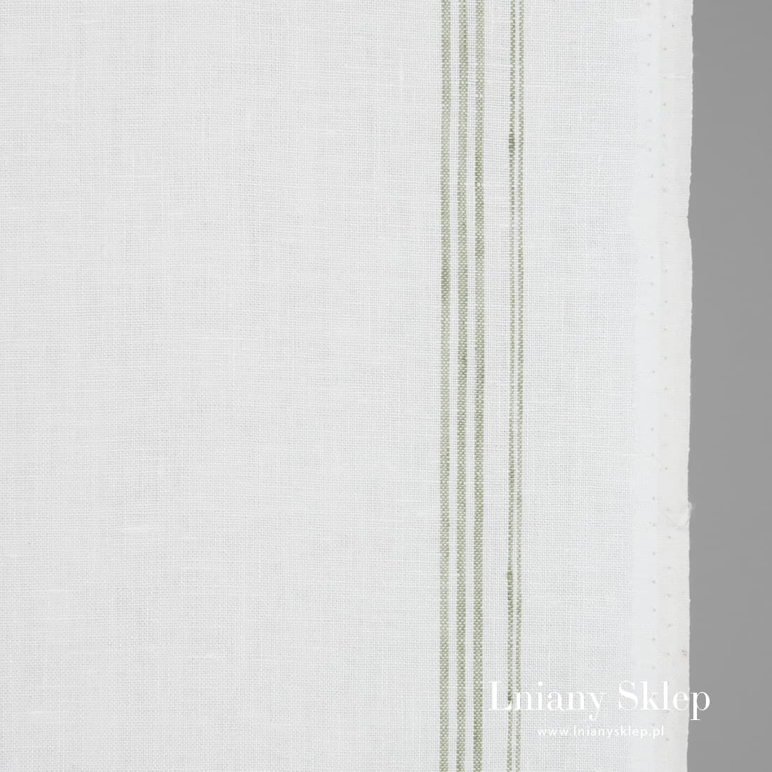 Len ścierkowy w zielone paski wytkane pionowo na mlecznobiałym (lekko żółtawym) tle. Mocna, gęsto wytkana tkanina szeroka 50cm – idealna na ścierki kuchenne.
