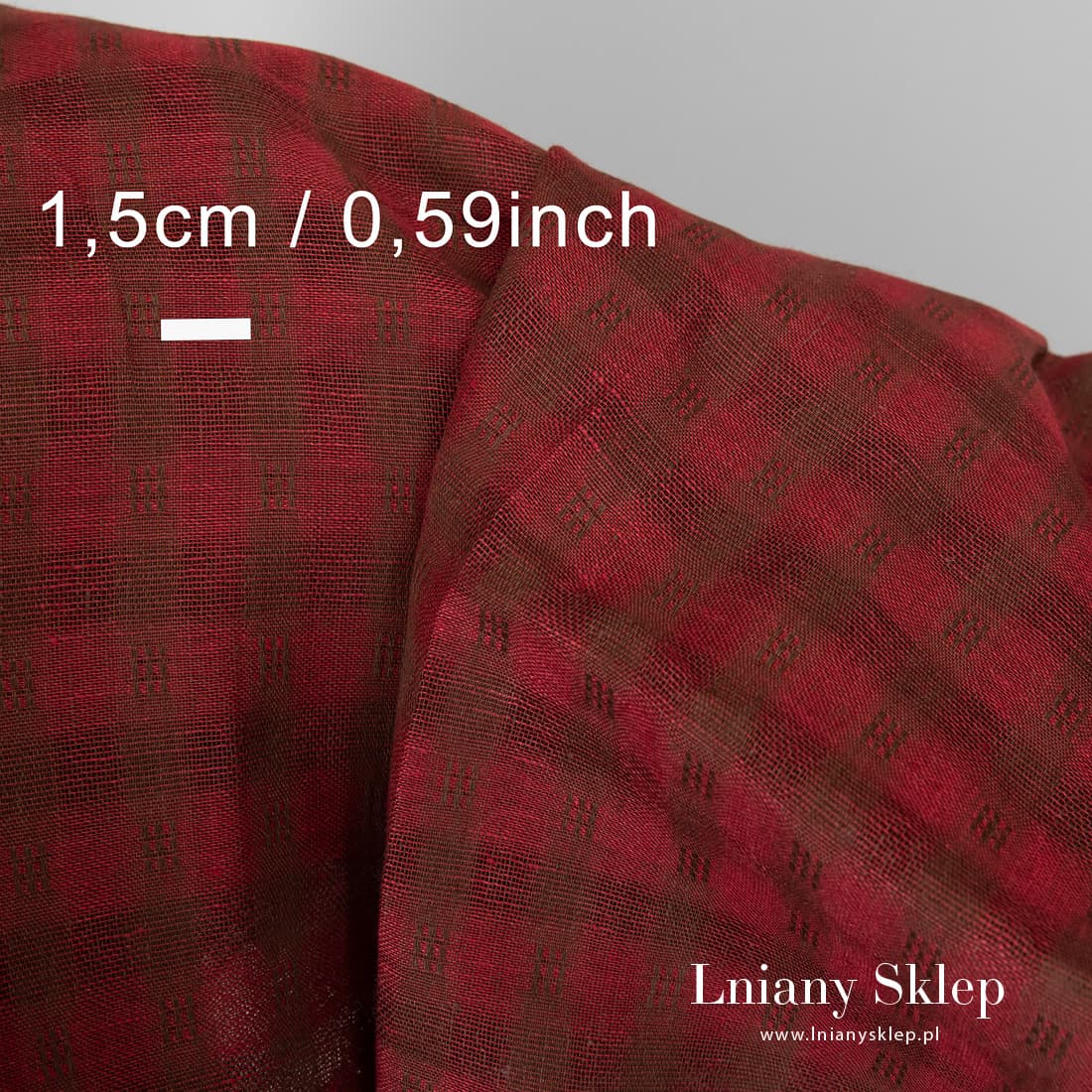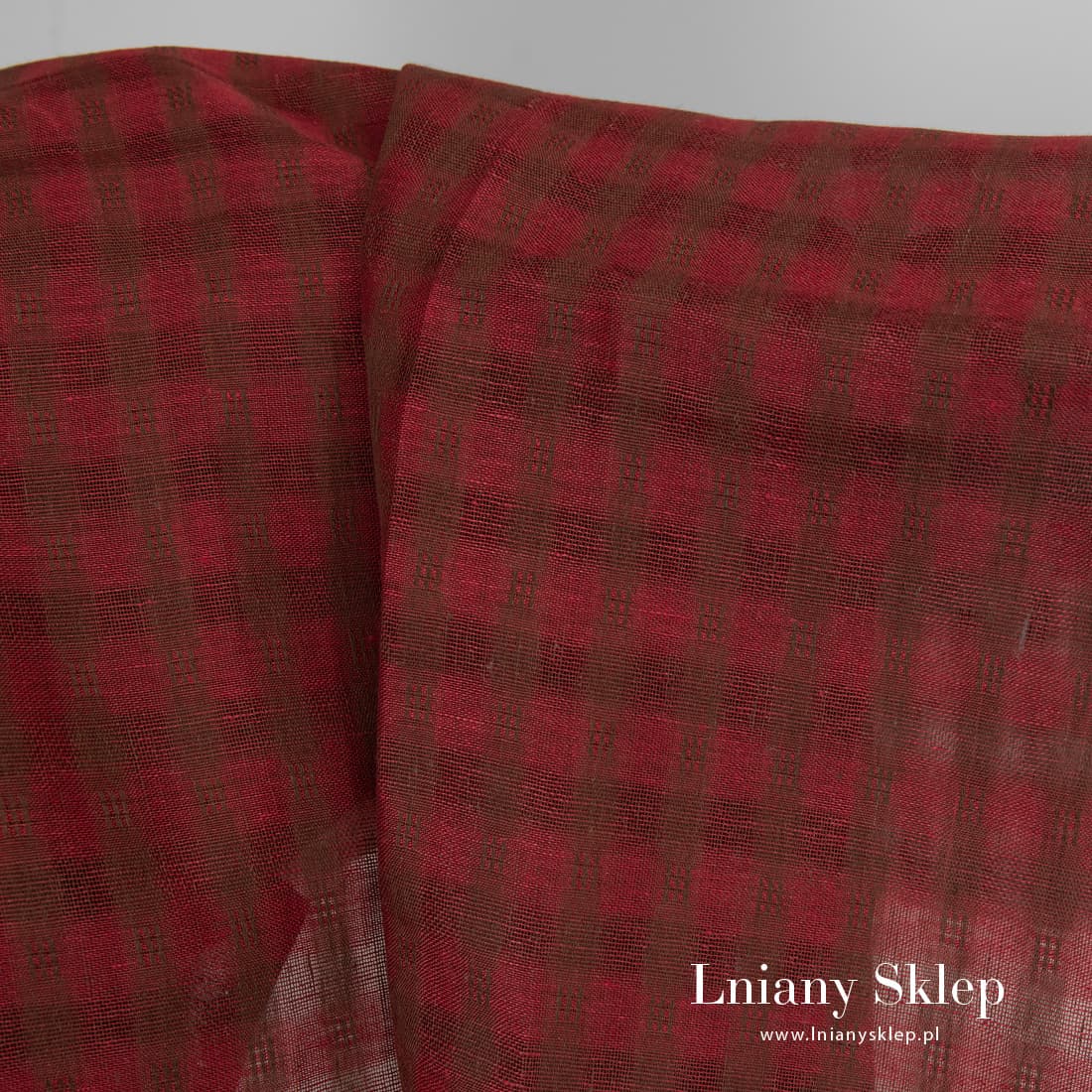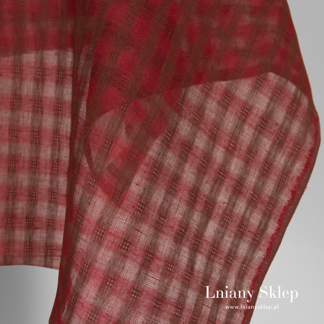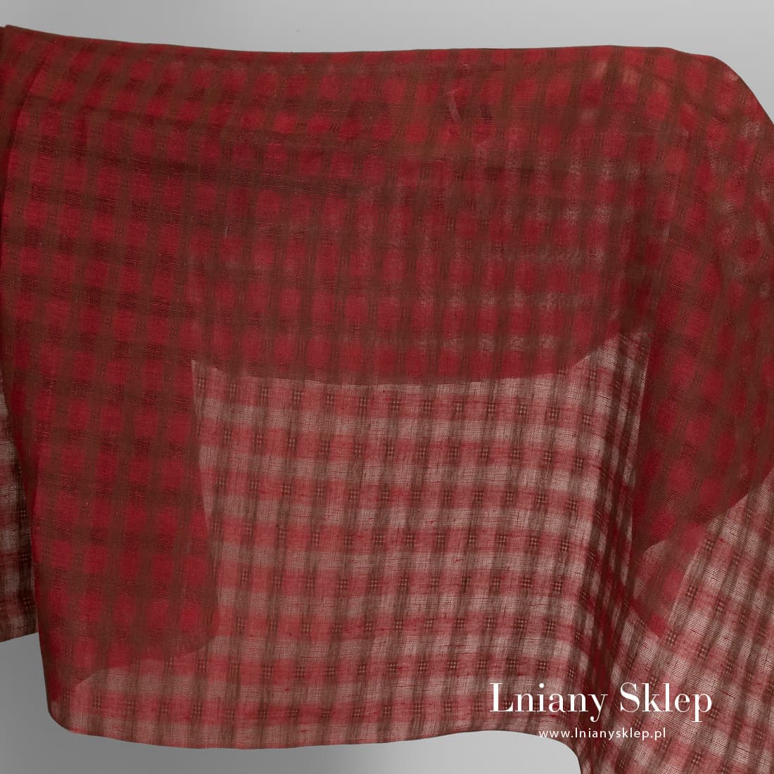 Len w czerwoną i brązową przeźroczystą kratkę. Mocno prześwitująca tkanina 100% lniana na szycie szaliczków, firanek i innych lekkich produktów.