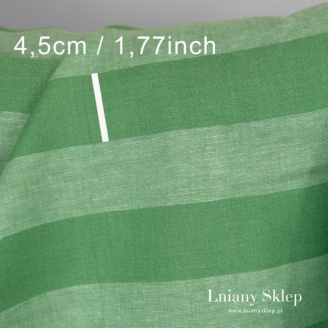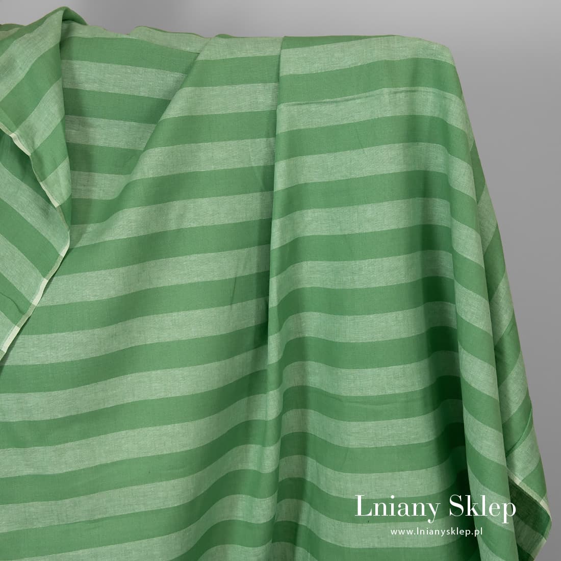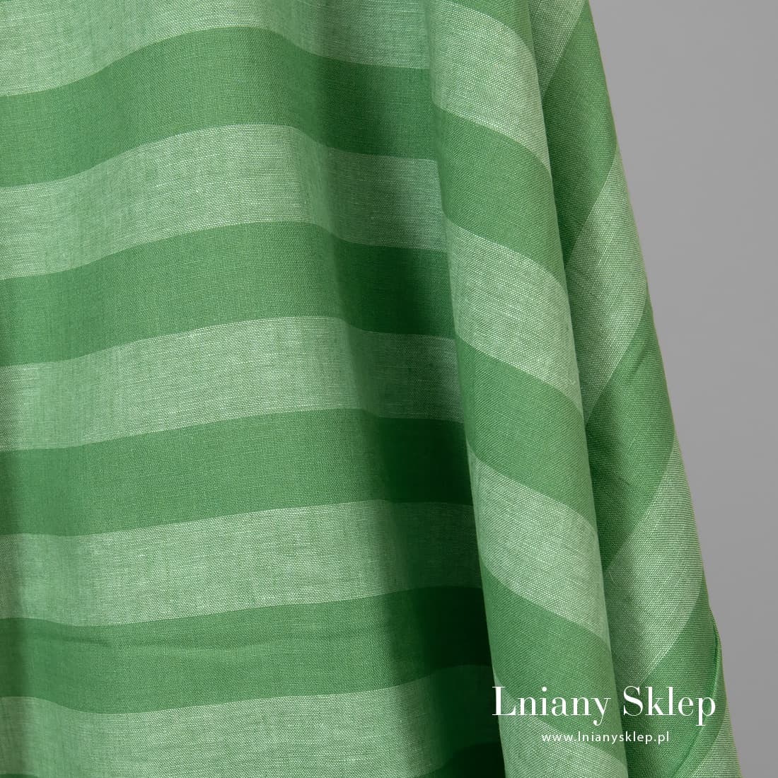 Len w szerokie pasy zielone i jasnozielone (kolor mięty). Pasy biegną poziomo. Mocna, gęsta, średnio ciężka tkanina.
