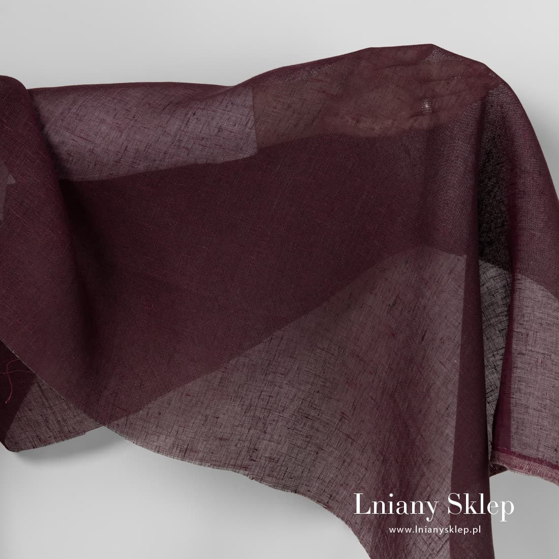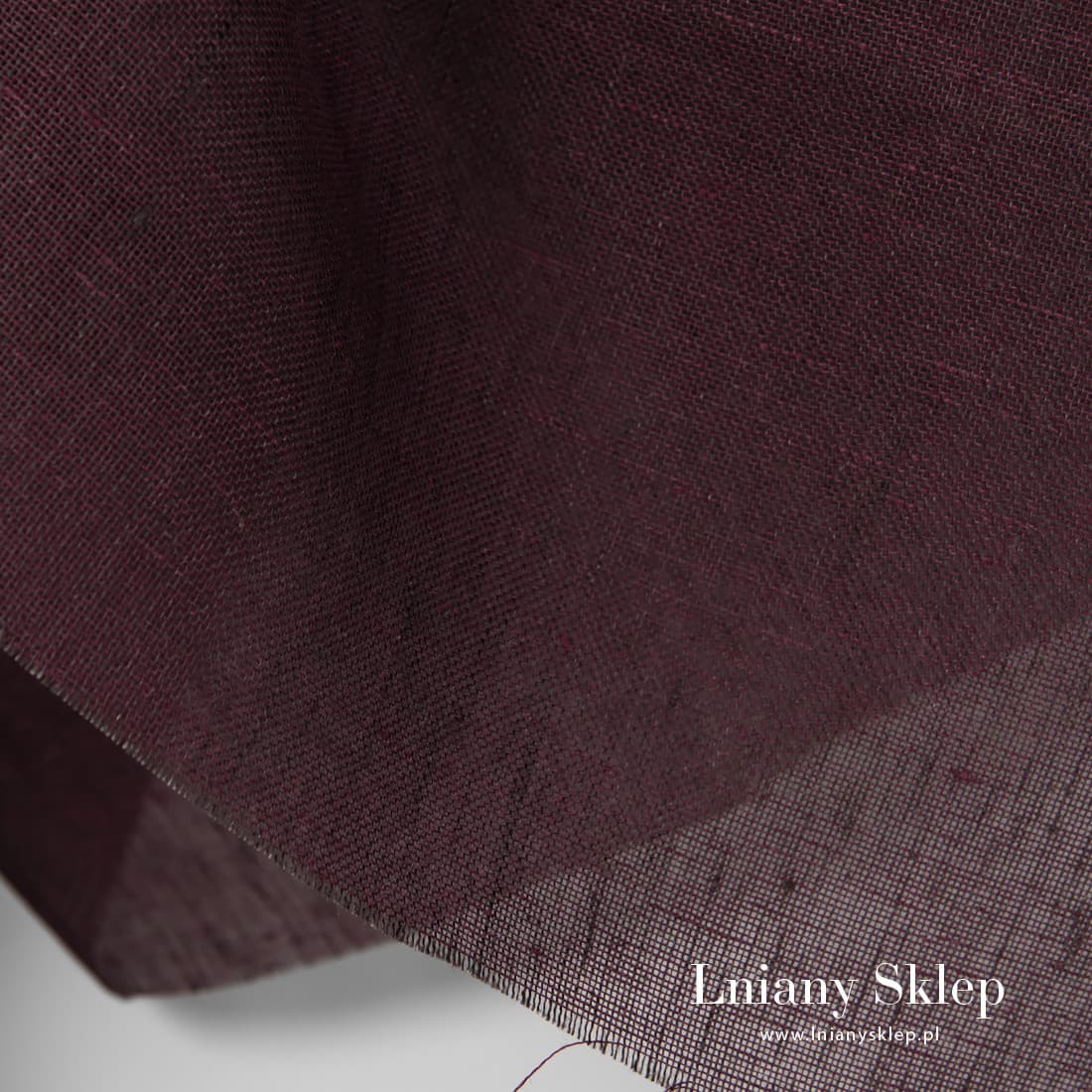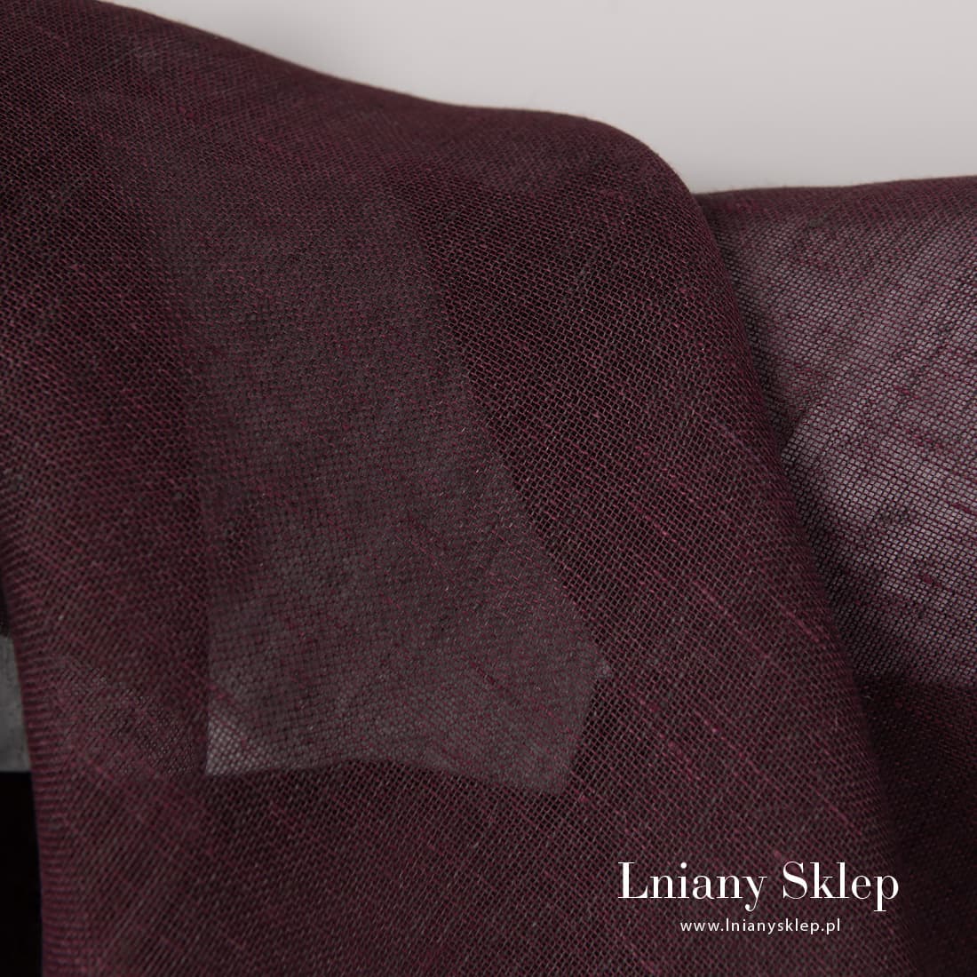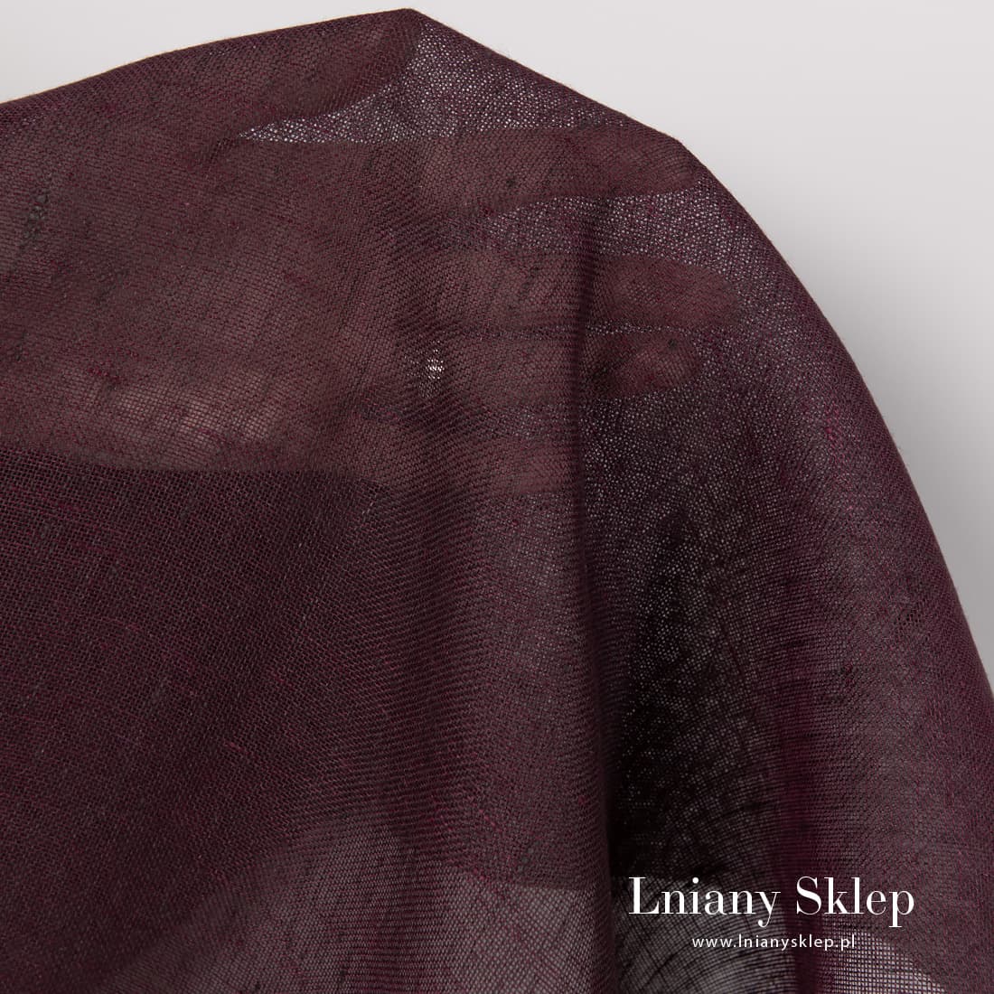 Lniana ciemna wiśniowa przeźroczysta tkanina. Tkanina wytkana z przędzy ciemnobrązowej i ciemnoczerwonej (wiśniowej). Lekka tkanina pasuje na szycie firanek, szaliczków i in.