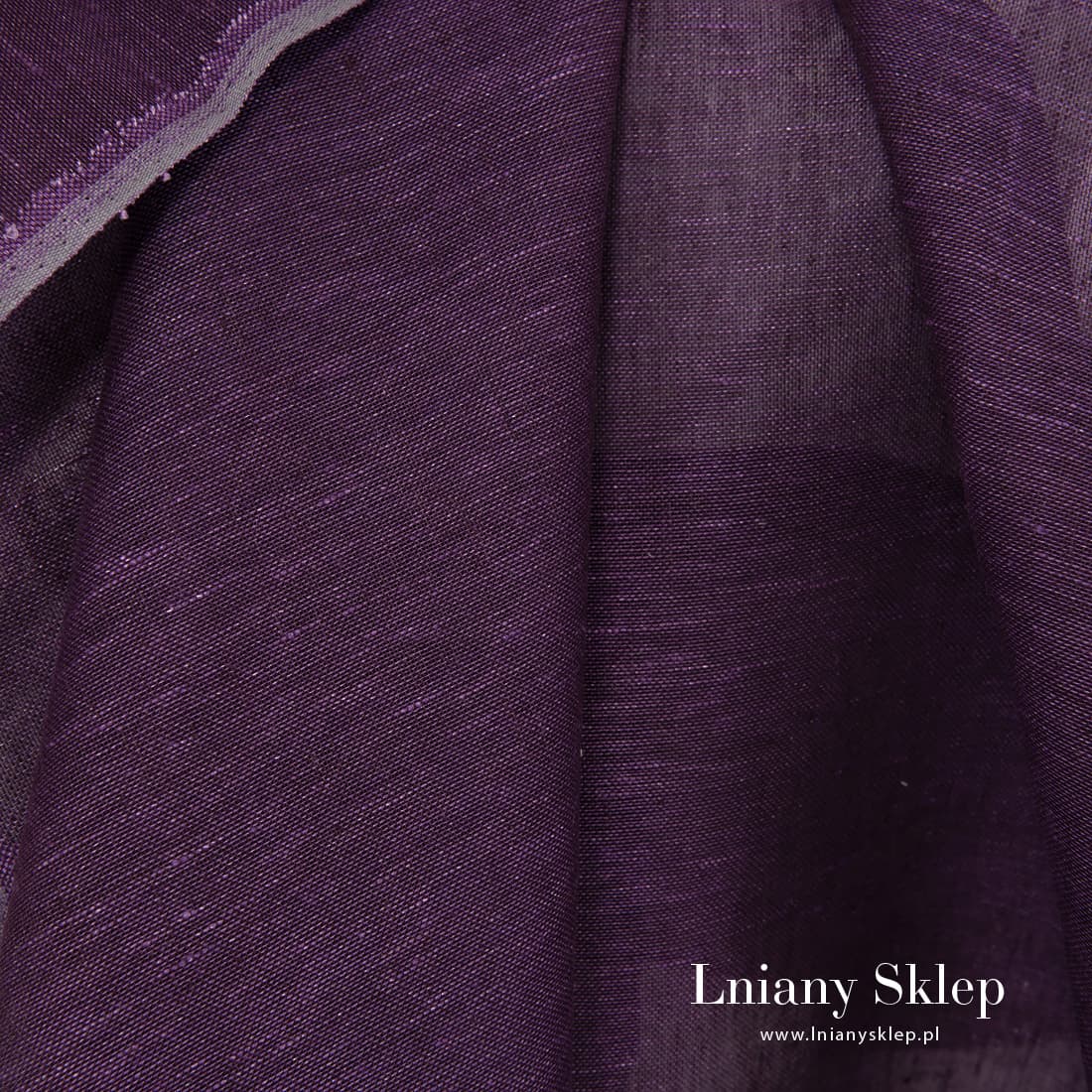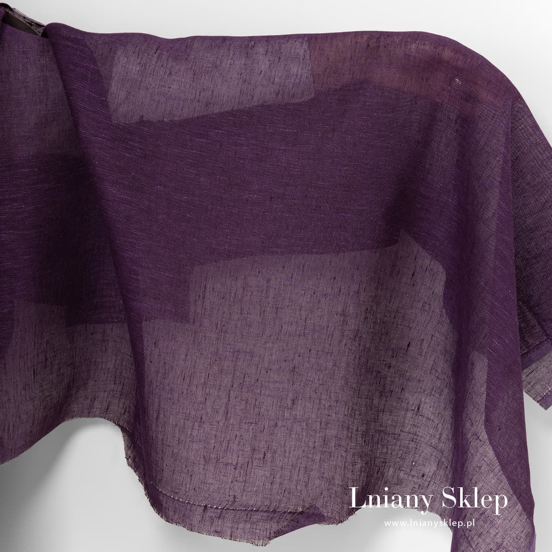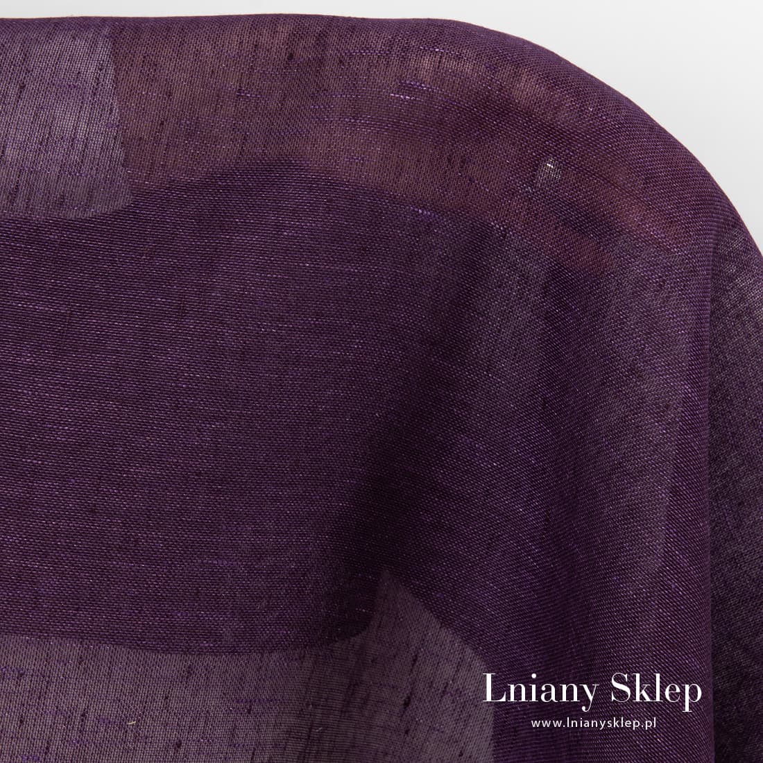 Lniana fioletowa przeźroczysta tkanina. Tkanina wytkana z przędzy jaskrawej fioletowej i w kolorze bakłażana. Lekka tkanina pasuje na szycie firanek, szaliczków i in.