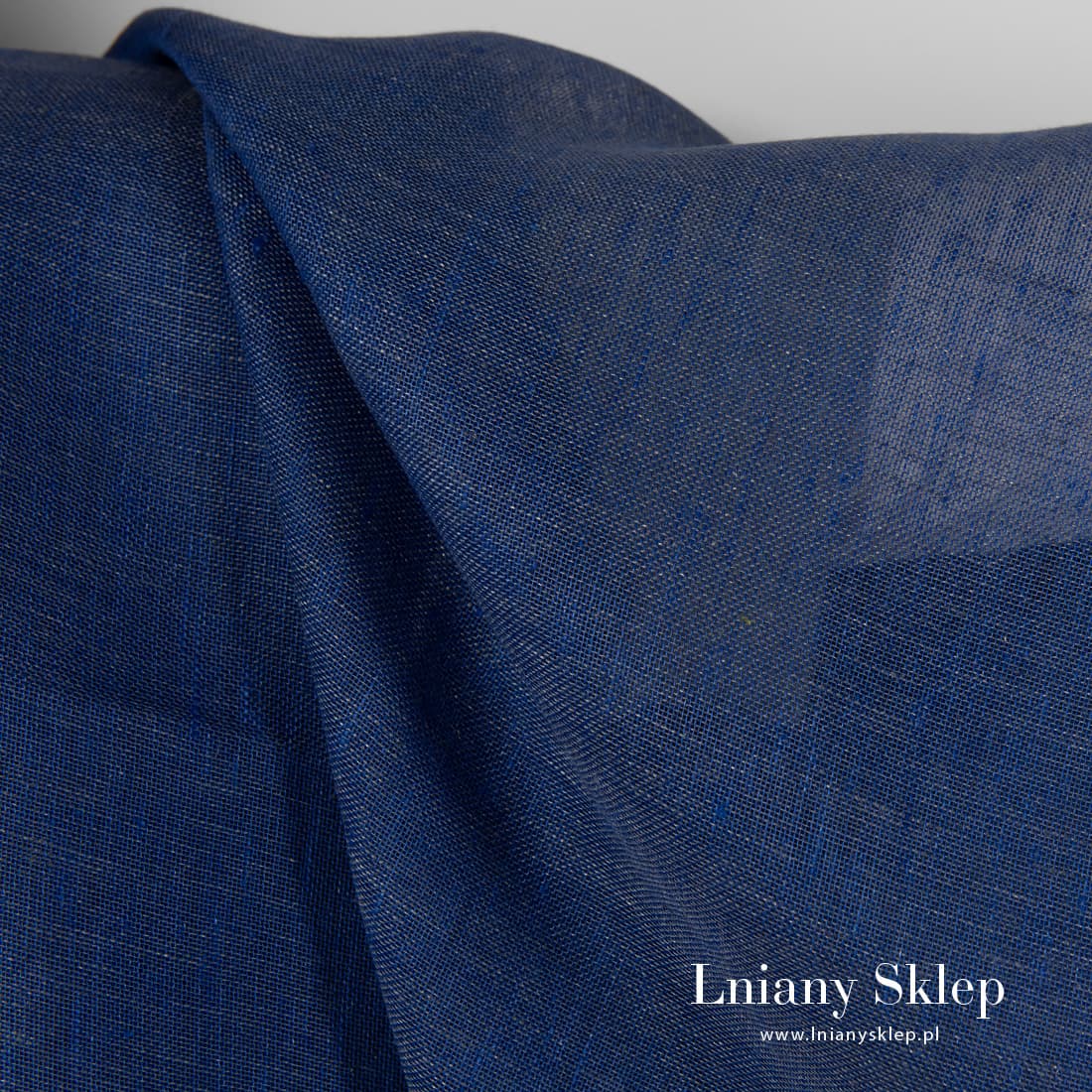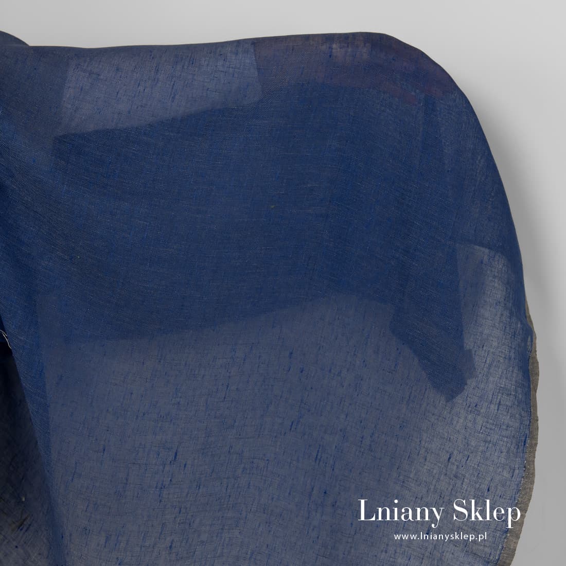 Lniana granatowa przeźroczysta tkanina. Tkanina wytkana z przędzy jasnej granatowej i niebieskiej o szarym odcieniu. Lekka tkanina pasuje na szycie firanek, szaliczków i in.