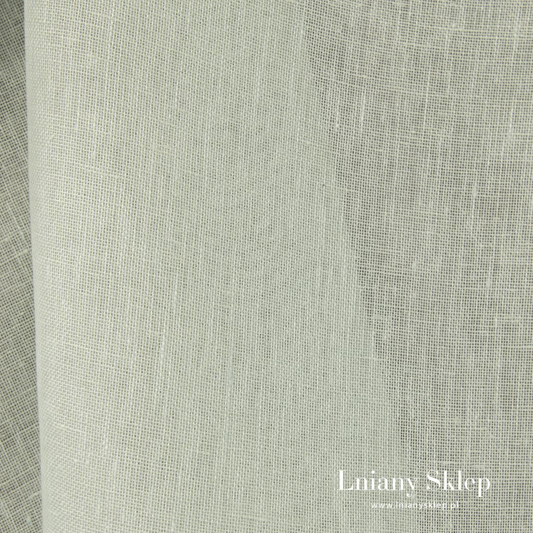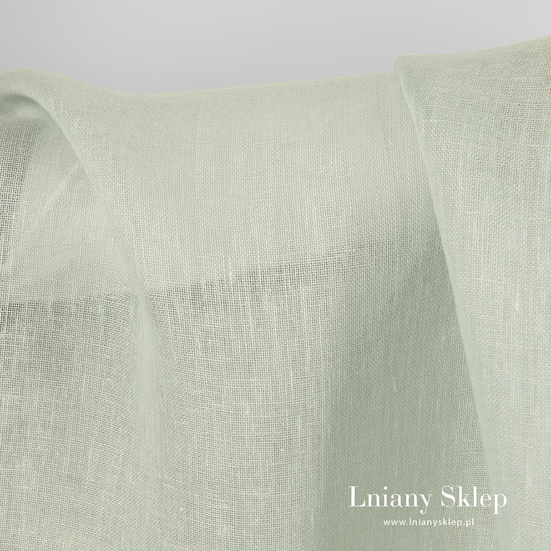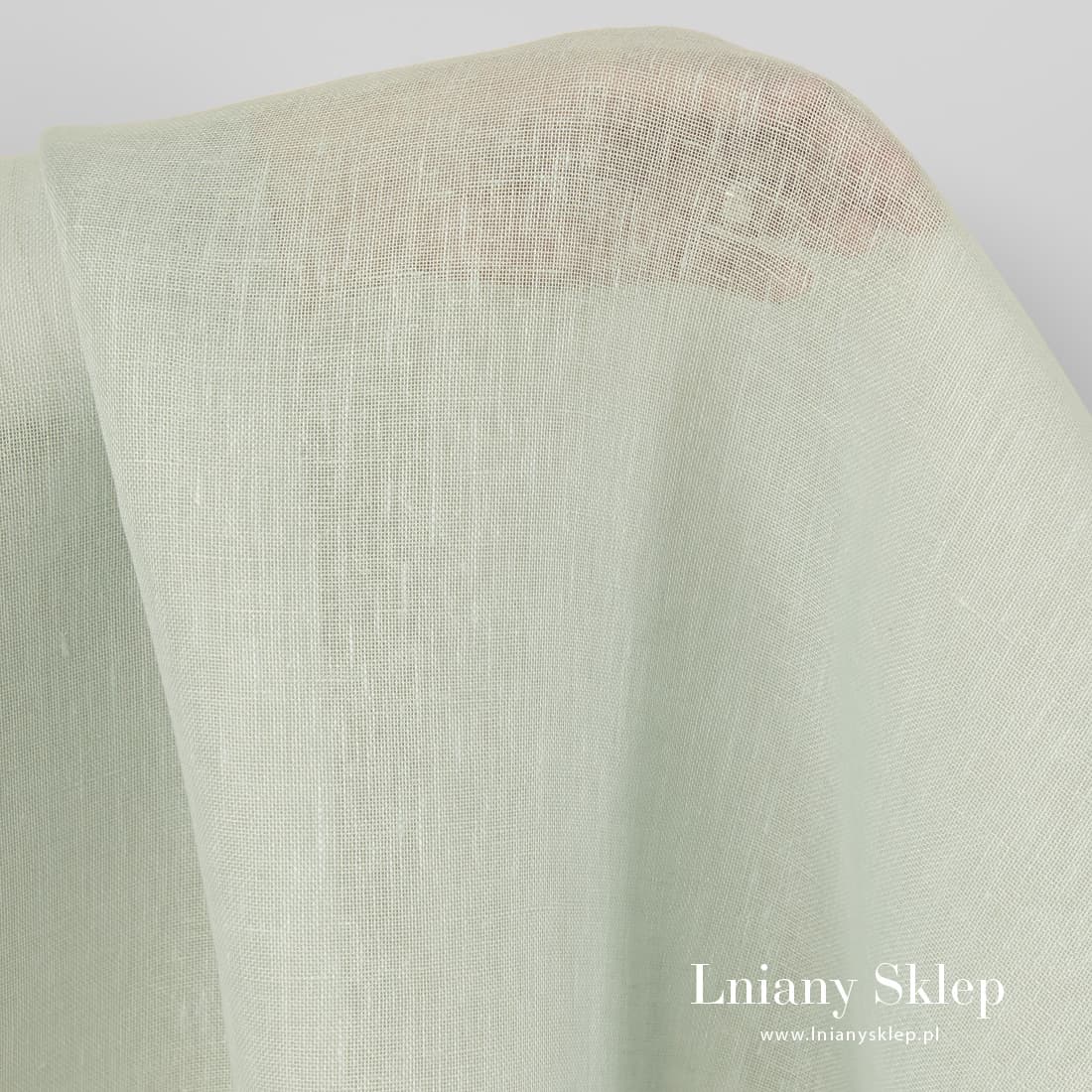 Lniana jasna pistacjowa przeźroczysta tkanina. Tkanina wytkana z przędz o dwóch różnych dcieniach jasnej zieleni. Lekka tkanina pasuje na szycie firanek, szaliczków i in.