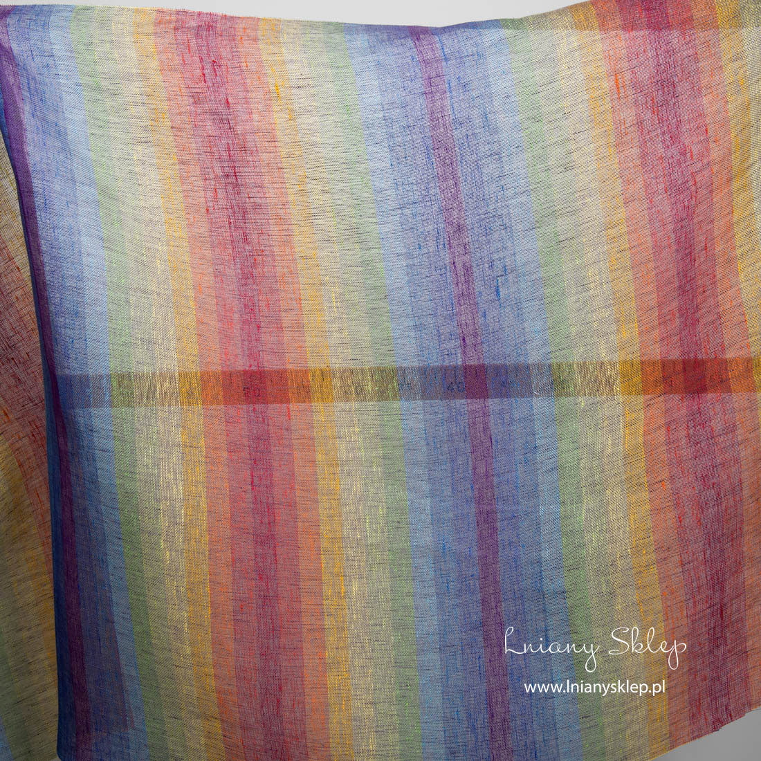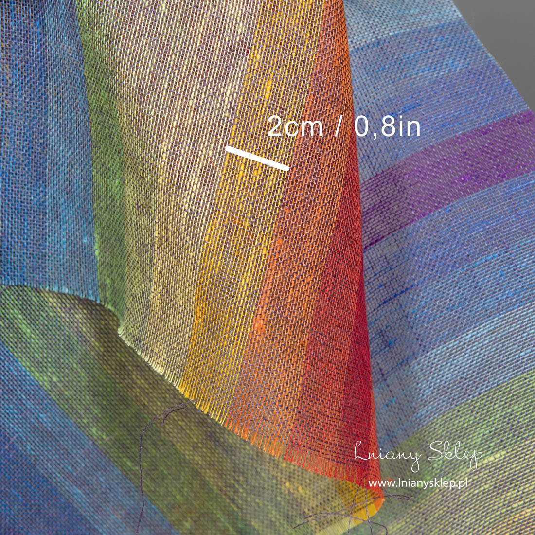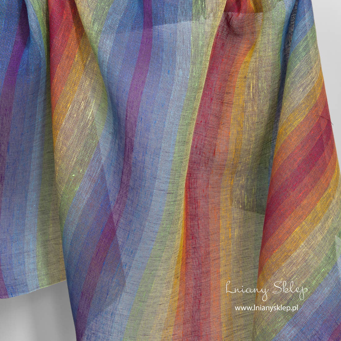 Lniana przeźroczysta tęczowa tkanina jest cieniutka i rzadko wytkana w kolorowe, pionowo biegnące pasy. Tkanina na zasłony, szaliki i inne lekkie produkty.