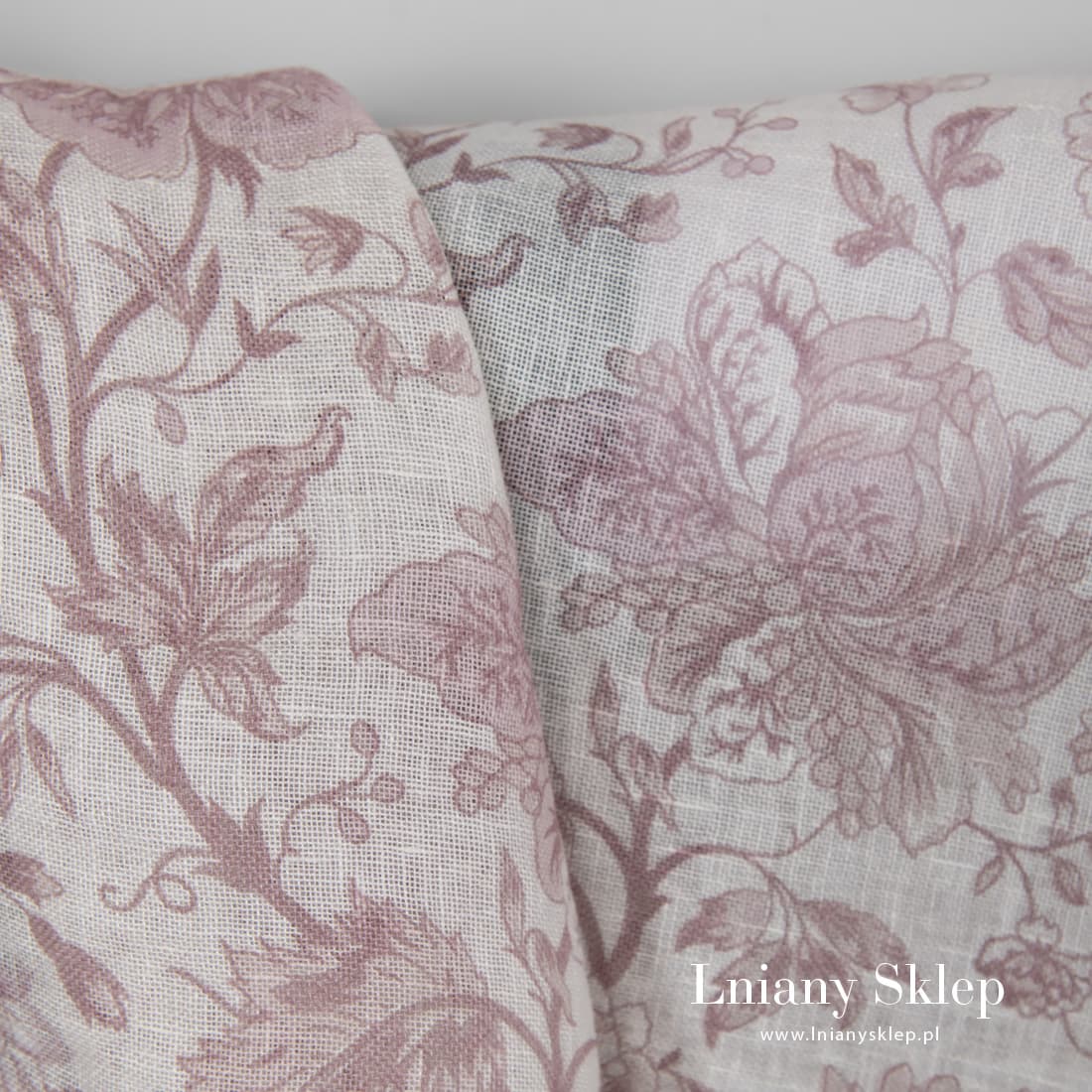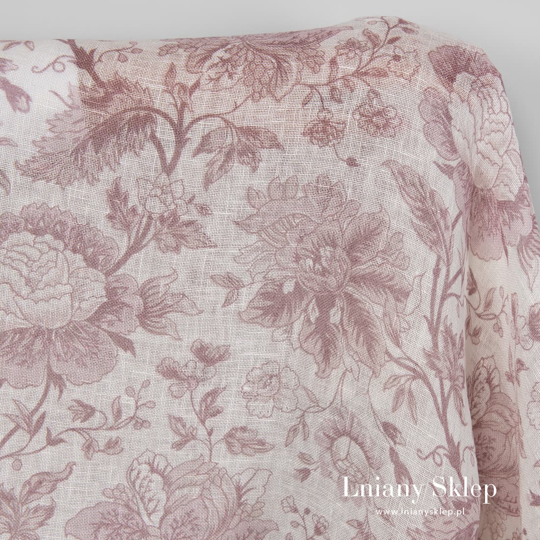 Lniana przeźroczysta tkanina w różowe kwiaty. Białe tło tkaniny zostało ozdobione nadrukiem barokowych kwiatów. Lekka tkanina pasuje na szycie firanek, szaliczków, chust i in.