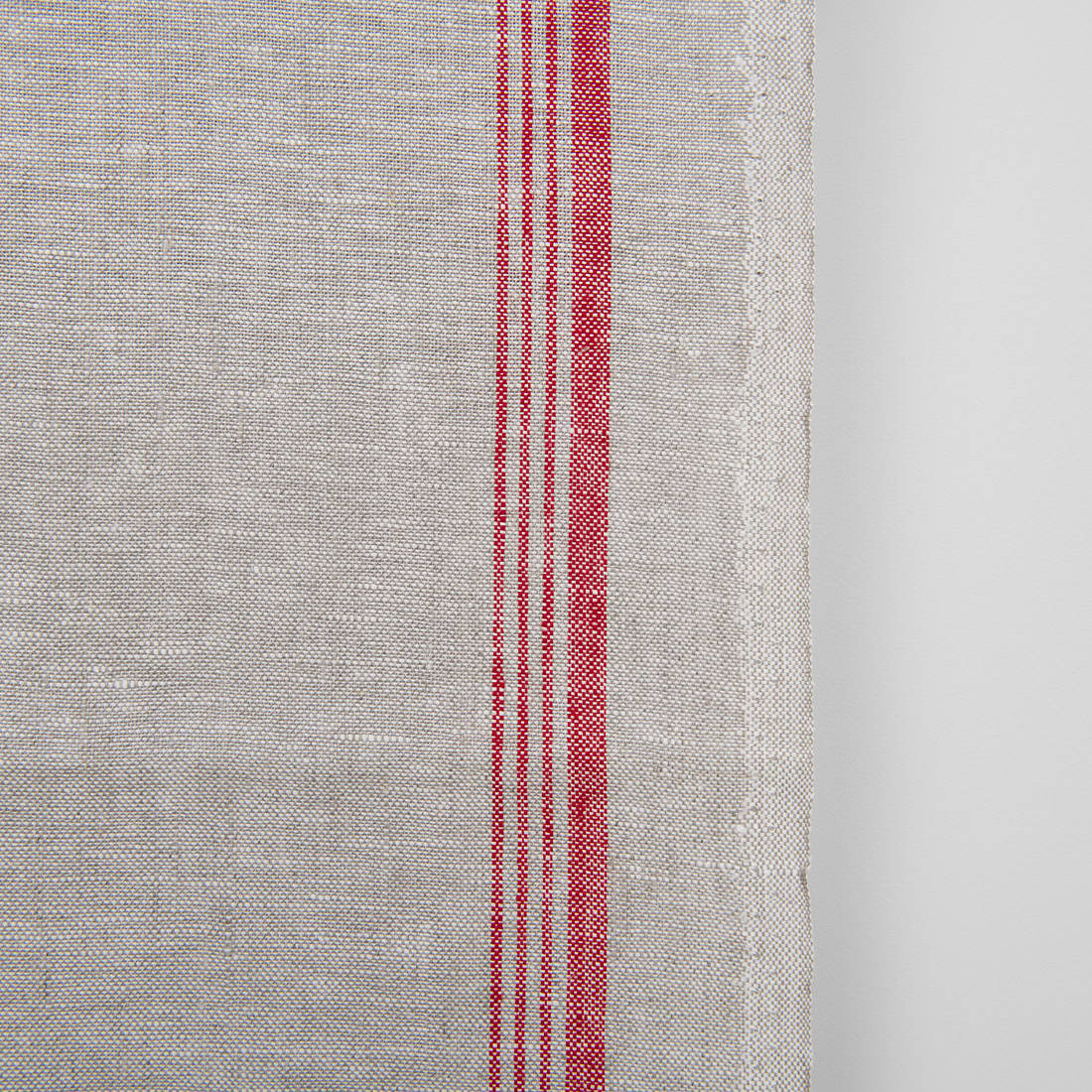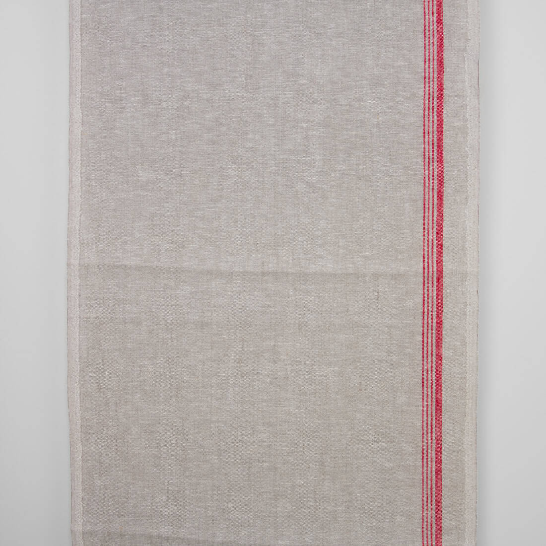 Jakościowa jasnoszara lniana tkanina przeznaczona na szycie ręczniczków kuchennych. Jeden z brzegów tkaniny zdobią wytkane czerwone paski.