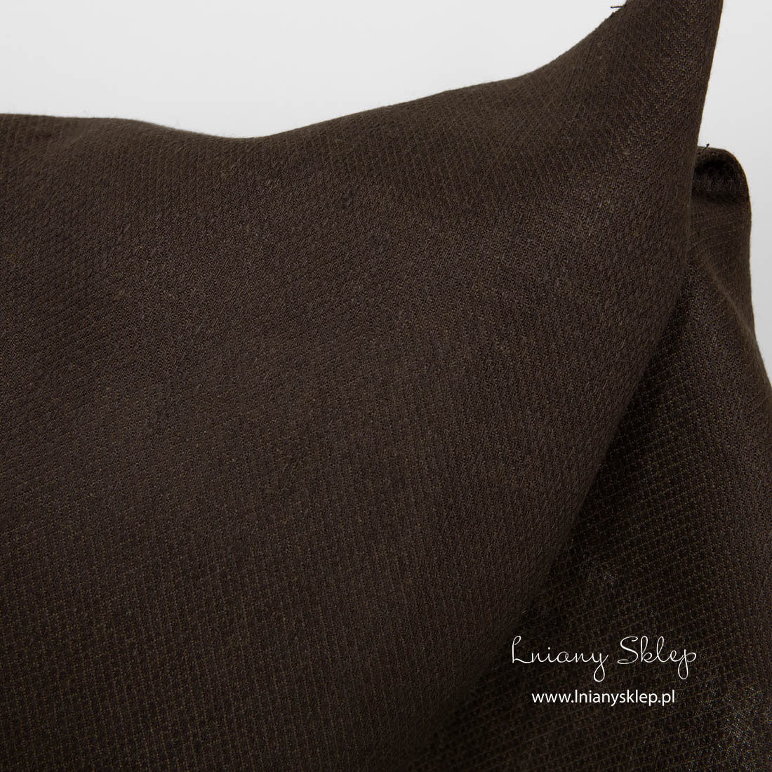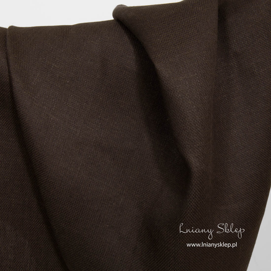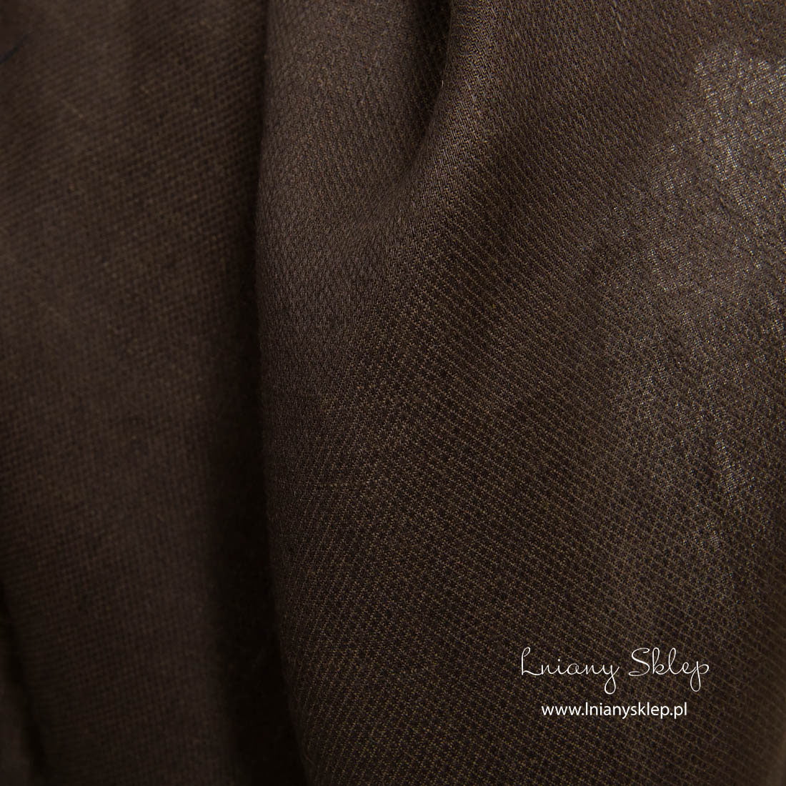 Lniana tkanina ciemny brąz w drobne romby jest średnio ciężką i gęsto wytkaną tkaniną w drobny rzucik. Pasuje na szycie wielu produktów.