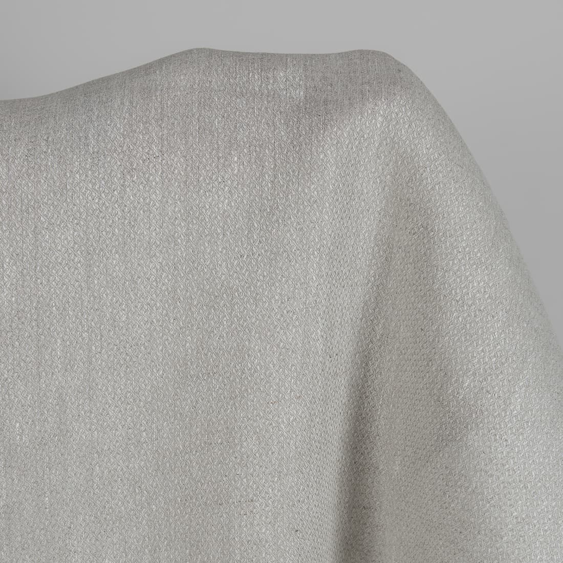 Tkanina 100% lniana wytkana z przędzy białej i szarej w rysunek drobnych rombów. Średnio gruba, wytrzymała, gęsto tkana tkanina odpowiednia na szycie najróżniejszych tekstyliów domowych i ubrań.
