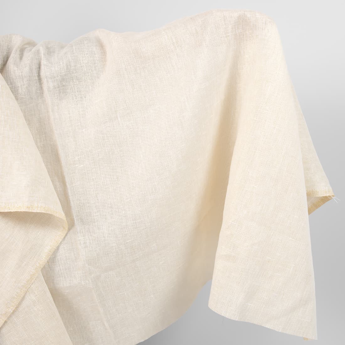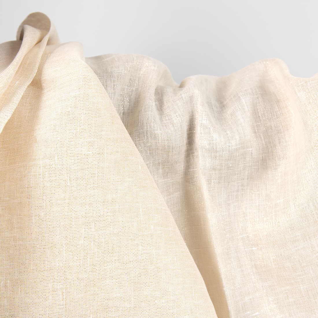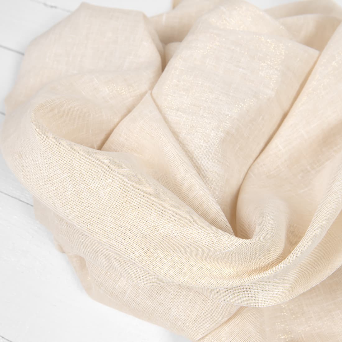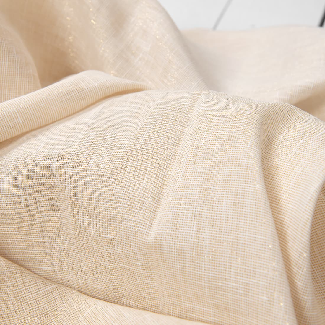 Lekka, pastelowo żółta tkanina wytkana z przędzy naturalnej lnianej oraz syntetycznej - lśniącej złotem - lureksowej. Produkty szyte z tej szlachetnie połyskującej tkaniny będą prezentowały się szczególnie odświętnie. Mogą to być obrusy, serwetki stołowe, zasłony, ubrania.