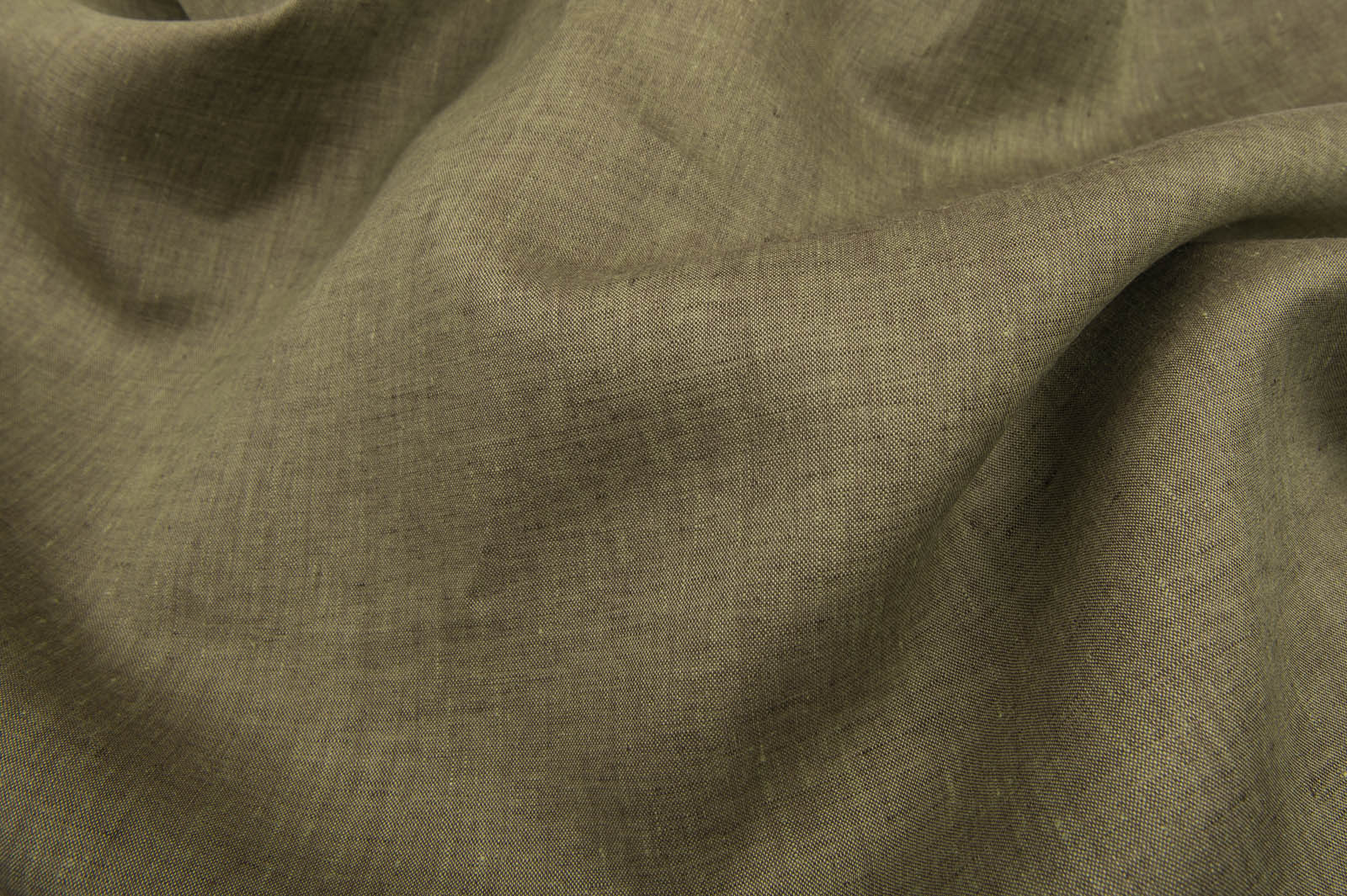 Melanżowa zielona (odcień zbliżony do khaki) tkanina lniana została wytkana z ciemnoszarej o zielonym odcieniu i ciemnobrązowej przędzy. Mocna, gęsta, dość lekka tkanina na szycie ubrań, zasłon, obrusów i bielizny pościelowej.