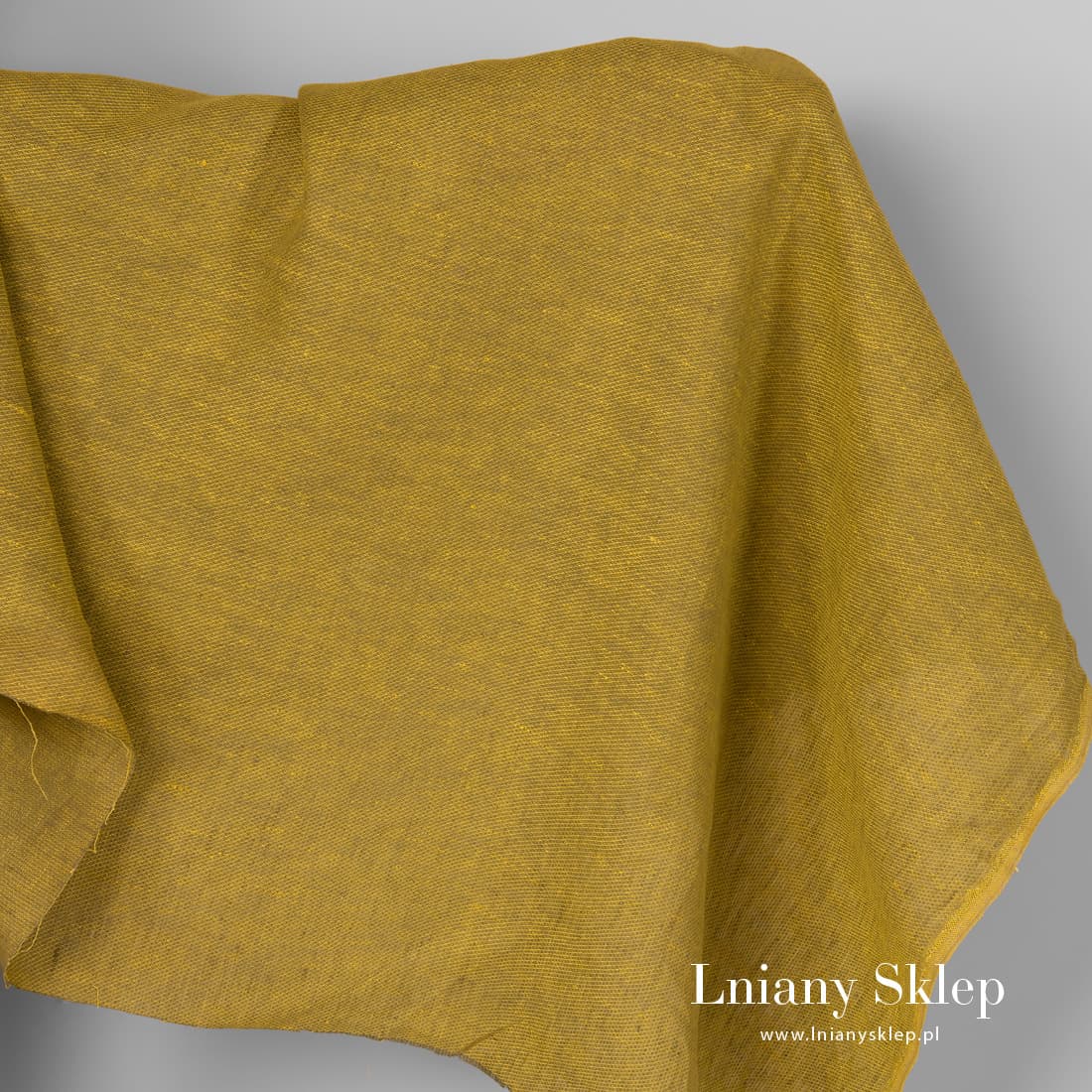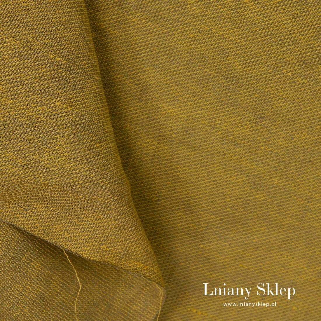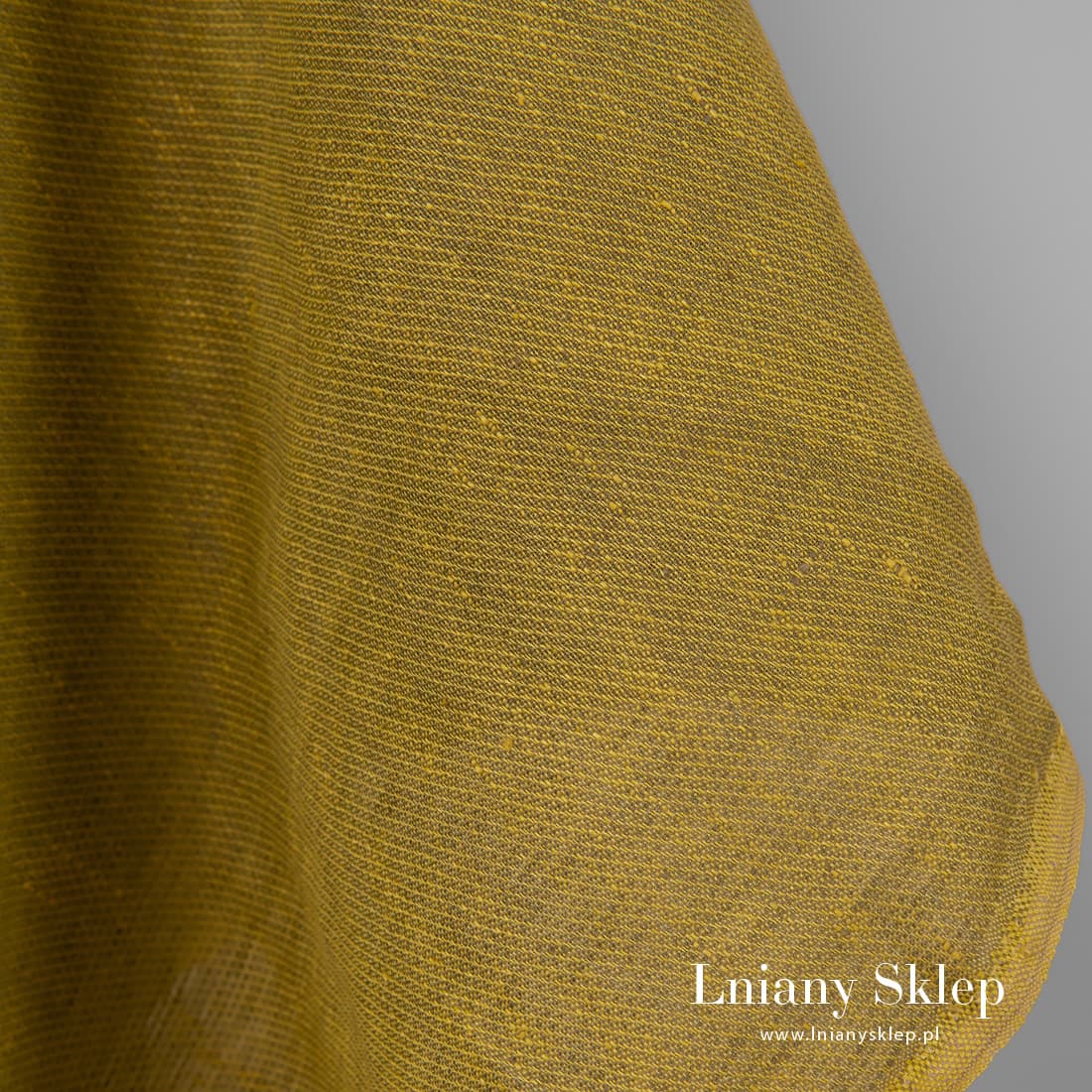 Musztardowa tkanina lniana w drobny wzorek z przędzy z przędzy żółtej i zielonej. Mocna, gęsta, średnio gruba tkanina na szycie odzieży, produktów konfekcji domowej i in.