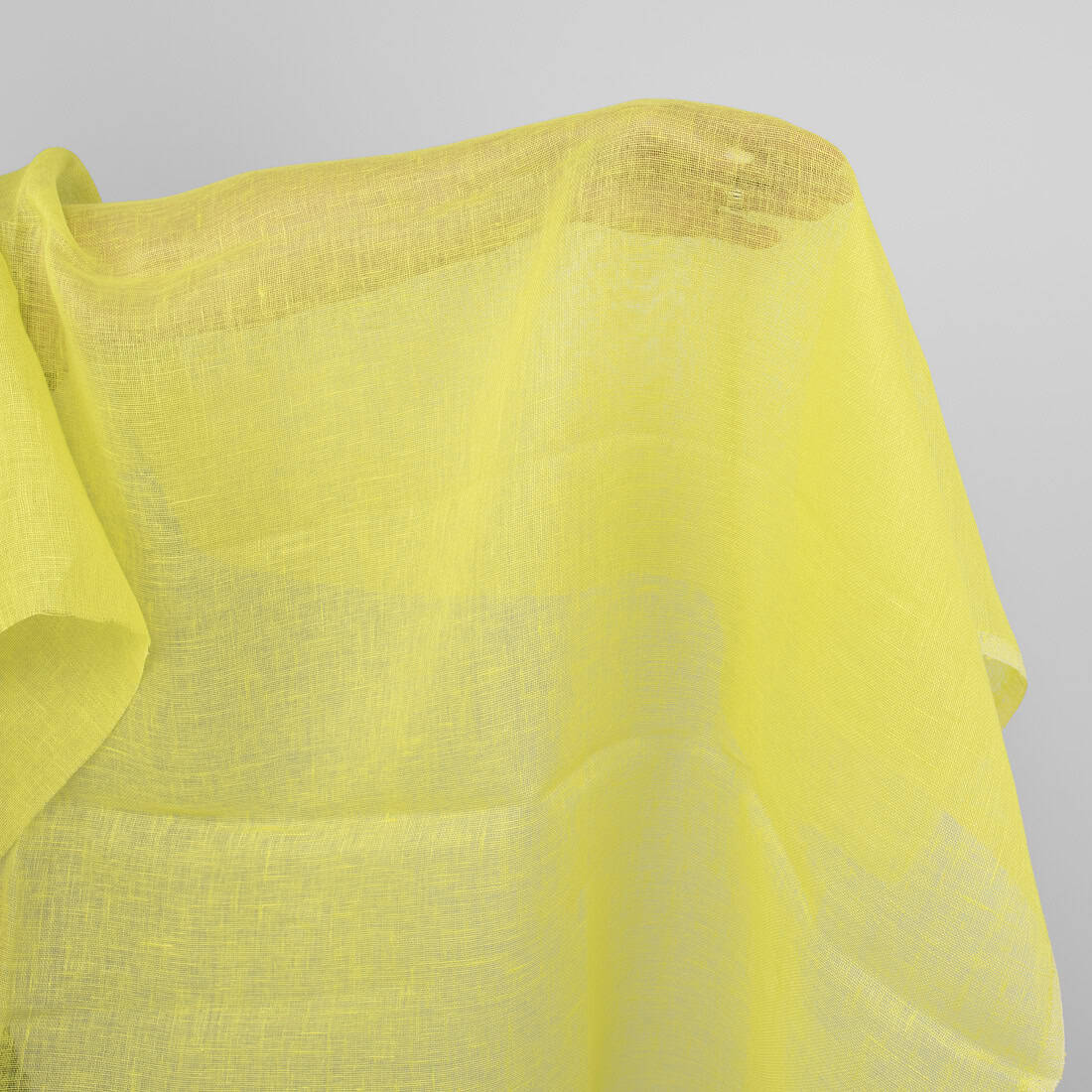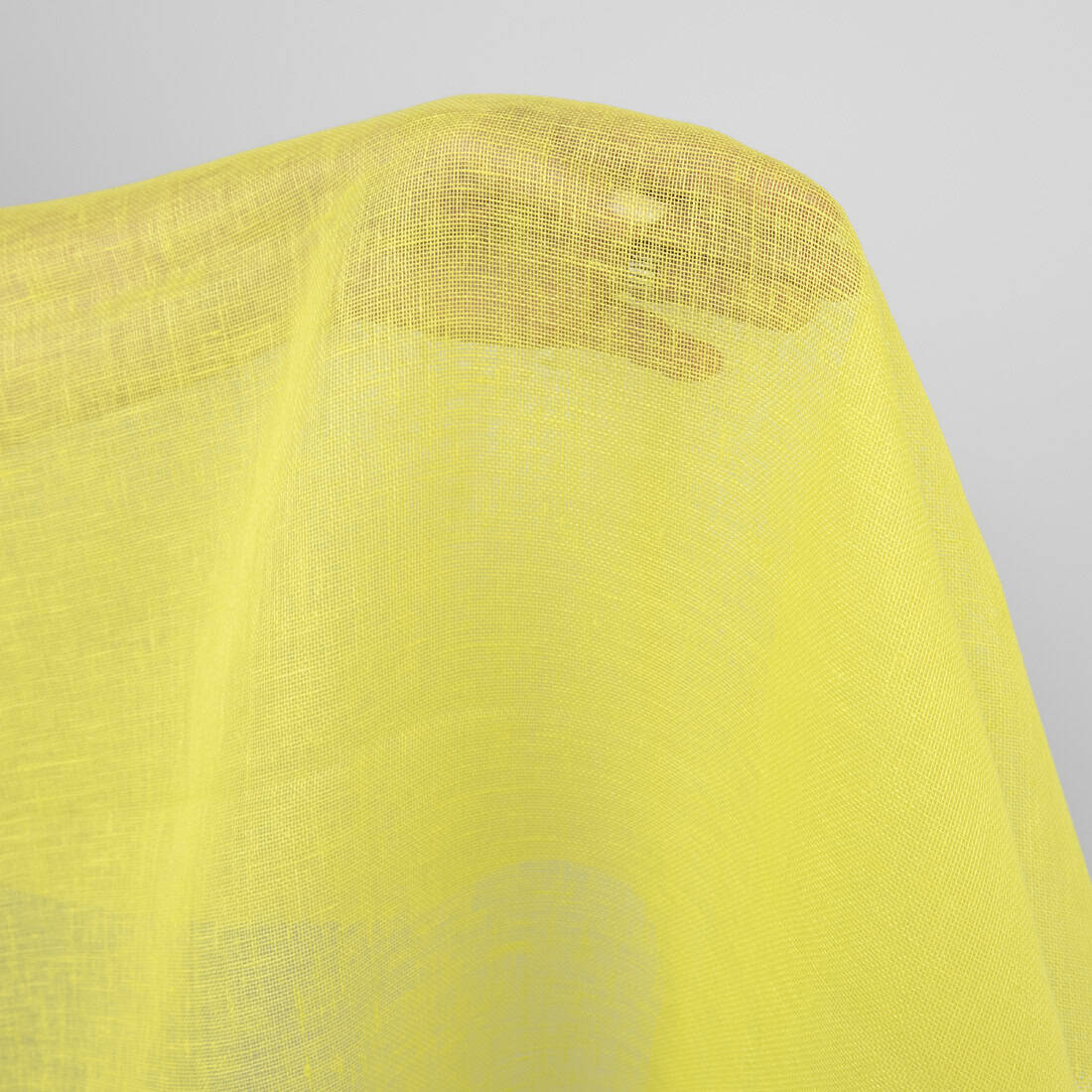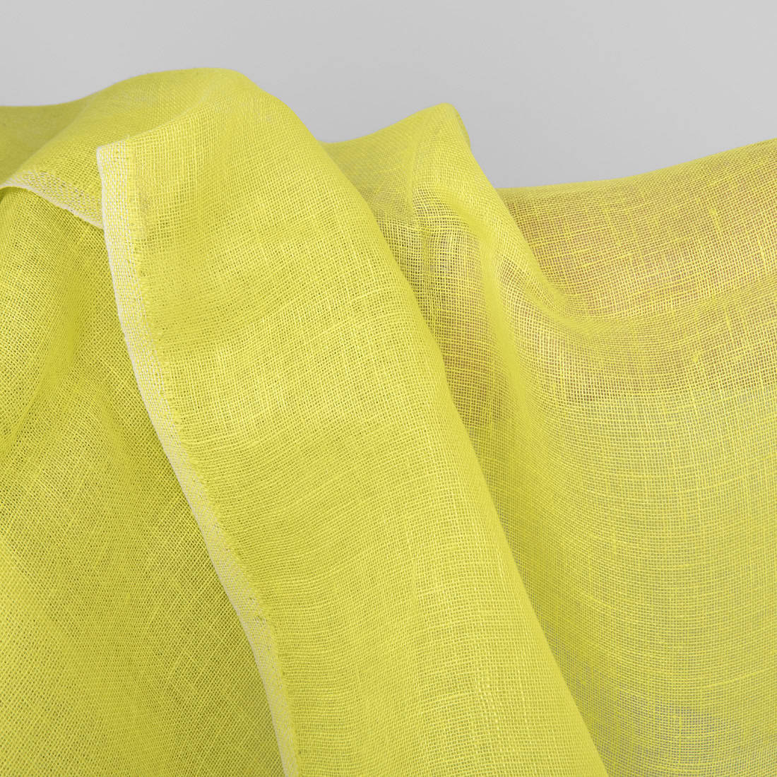 Neonowo jaskrawa, zielonkawo żółta tkanina 100% lniana wytkana gładko i bardzo rzadko. Lekka, rzadka i przeźroczysta tkanina lniana świetnie pasuje na szycie firanek, szaliczków i różnych akcesoriów.