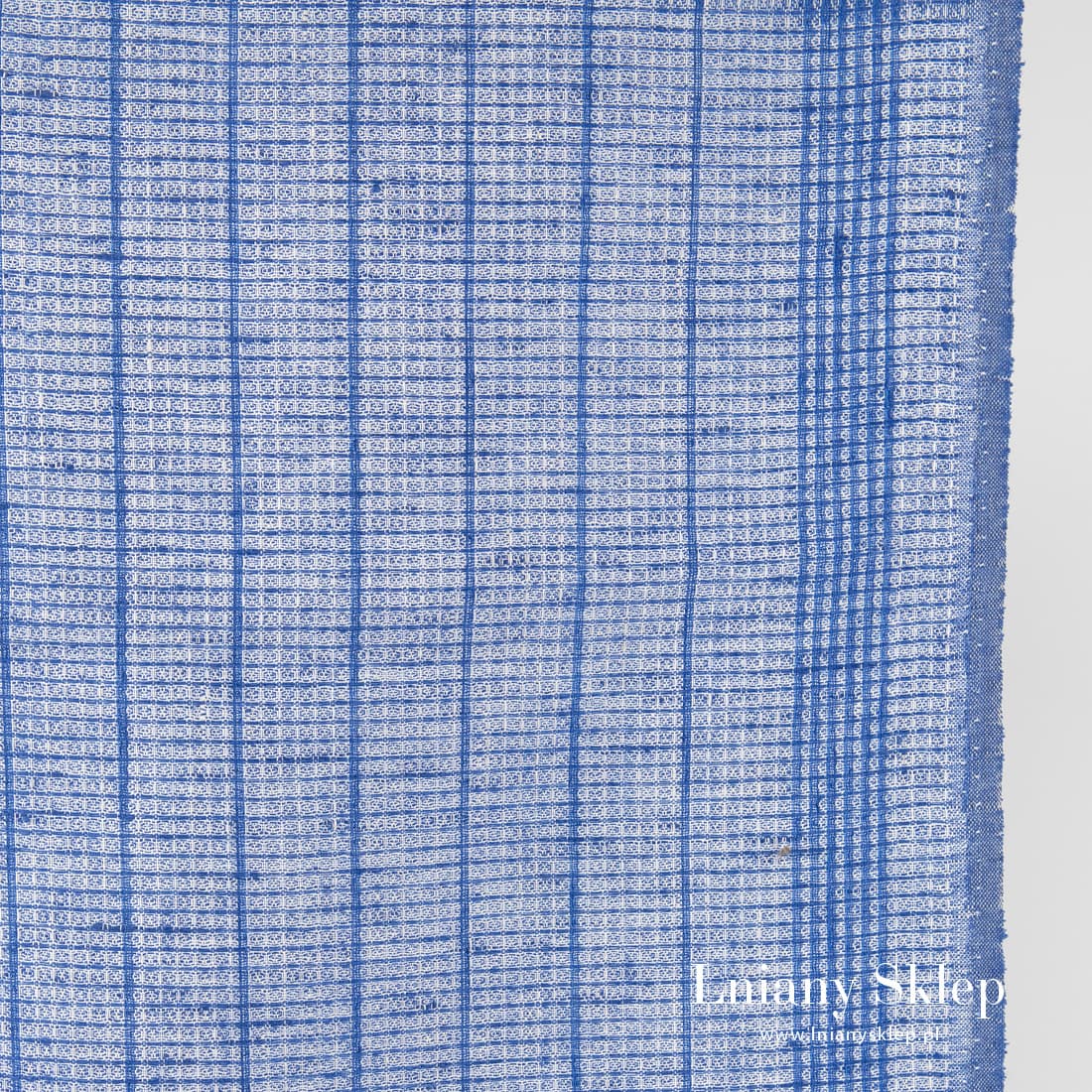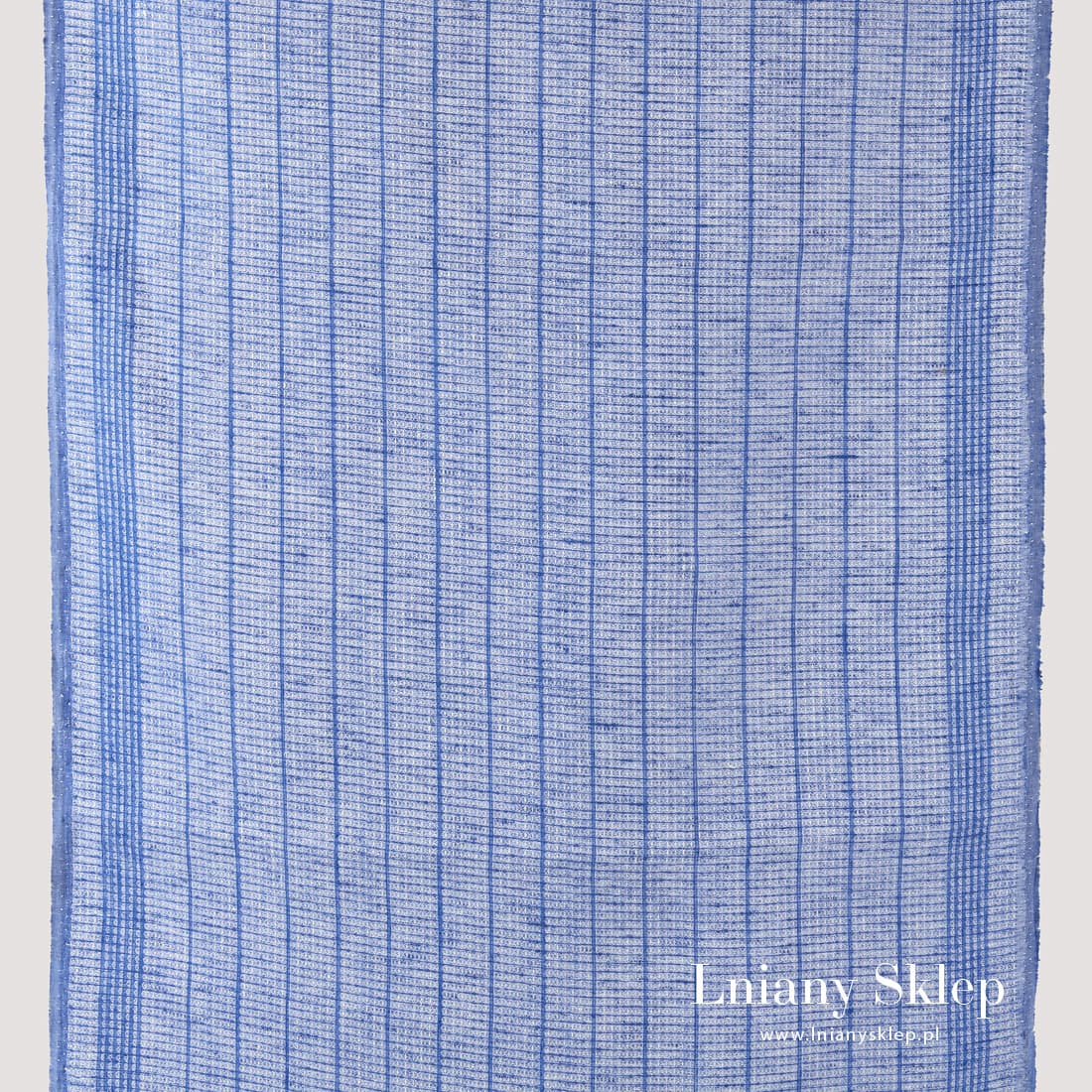 Niebieski waflowy len ścierkowy w paski. Melanżowe tło wytkane zostało z przędzy białej i niebieskiej. Tkaninę zdobią biegnące pionowo ciemniejsze niebieskie paski. Świetnie wchłania wodę, dlatego idealna na ścierki kuchenne.