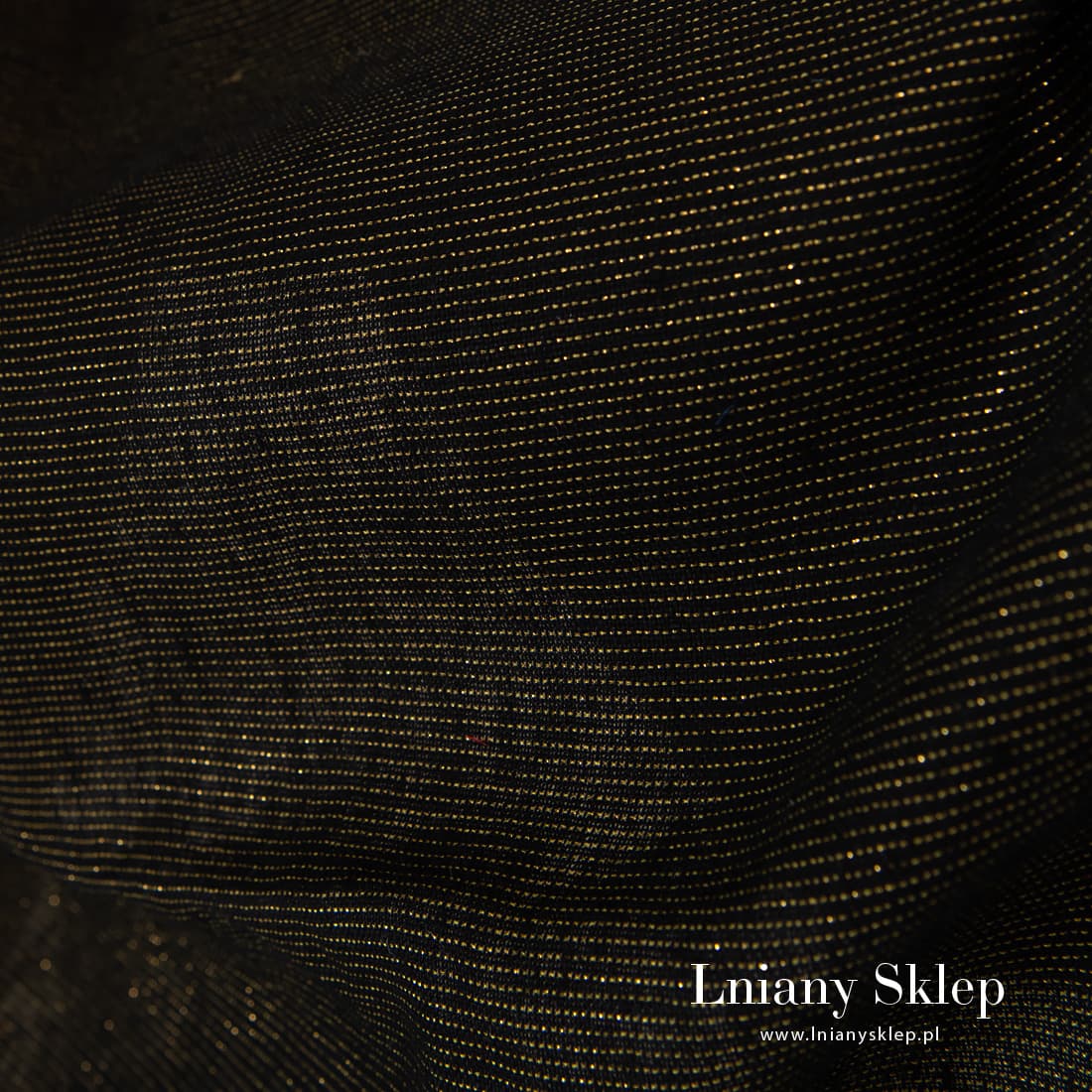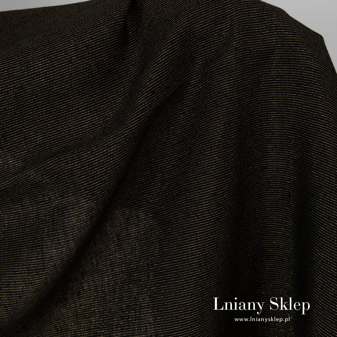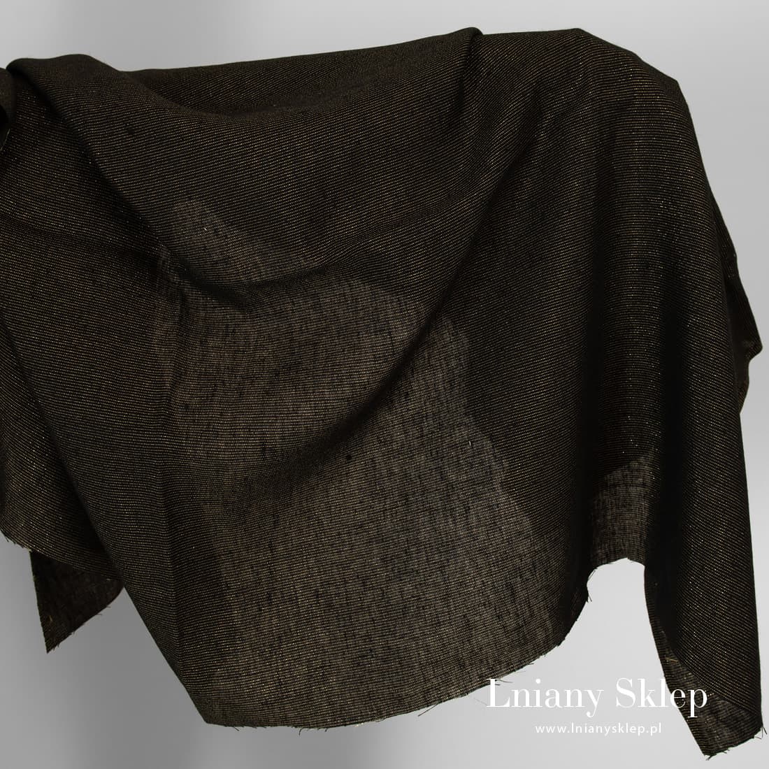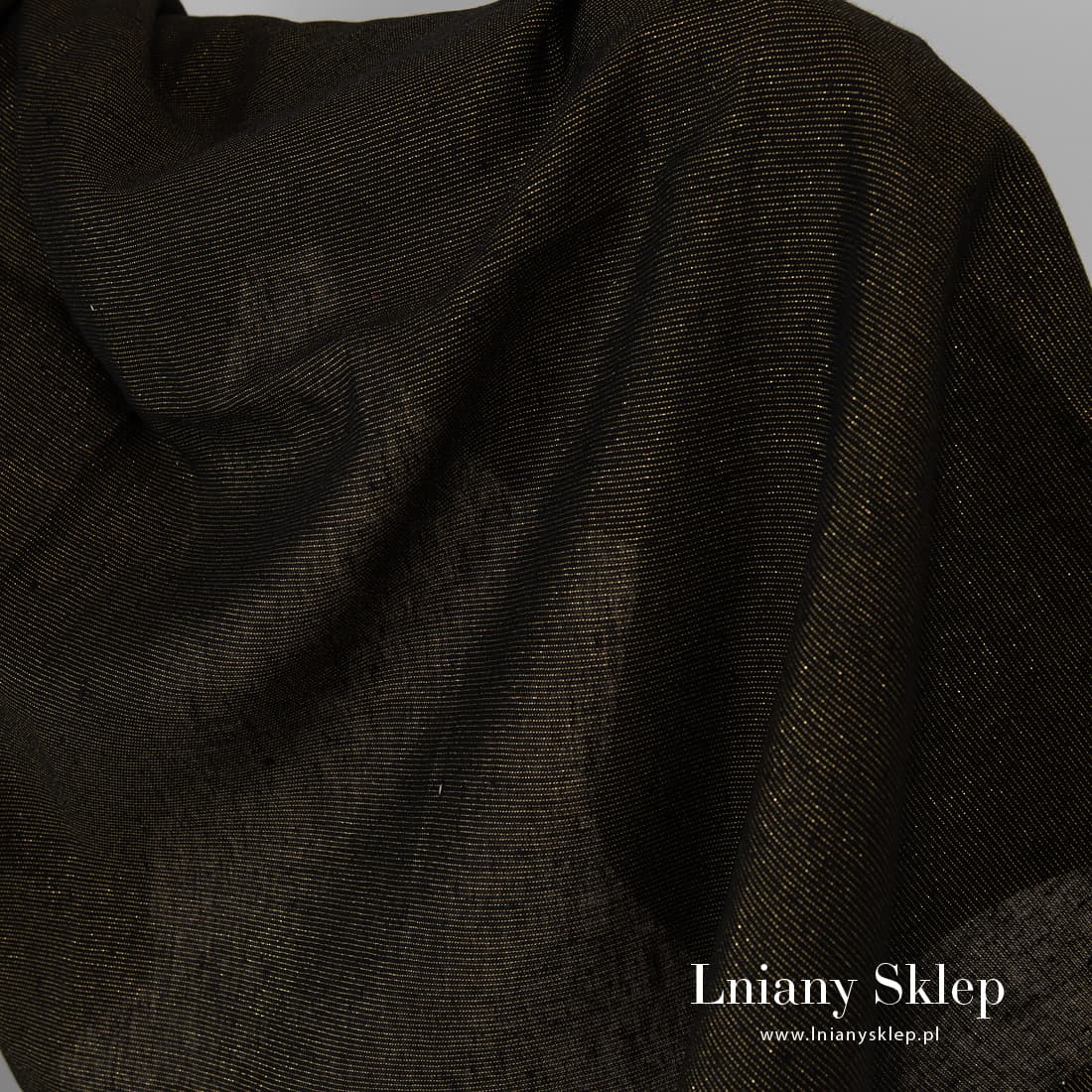 Połyskujący złotem czarny len. Mocna, gęsta, dość lekka tkanina na szycie odświętnej odzieży i tekstyliów domowych (obrusów, zasłon) in.