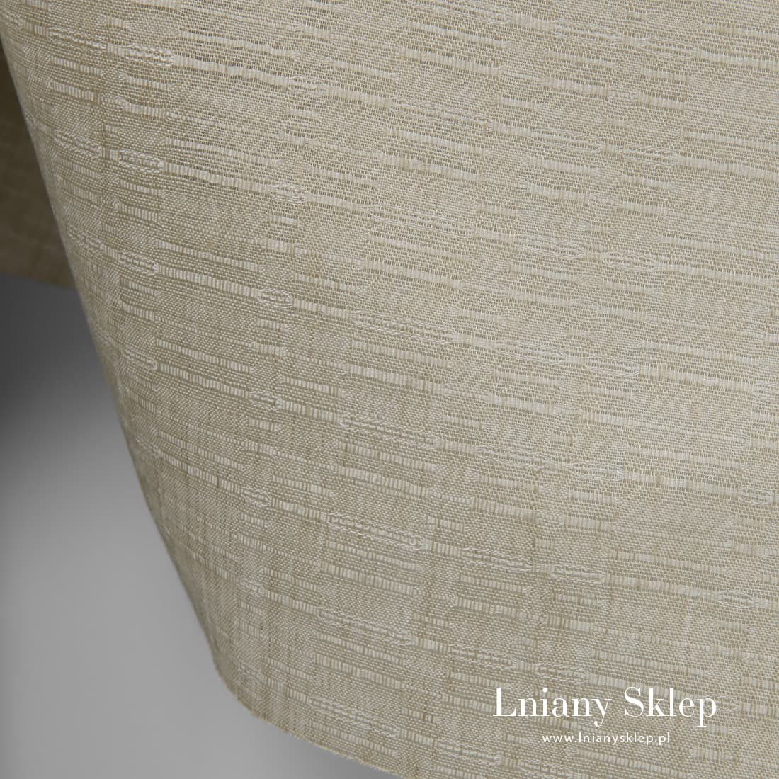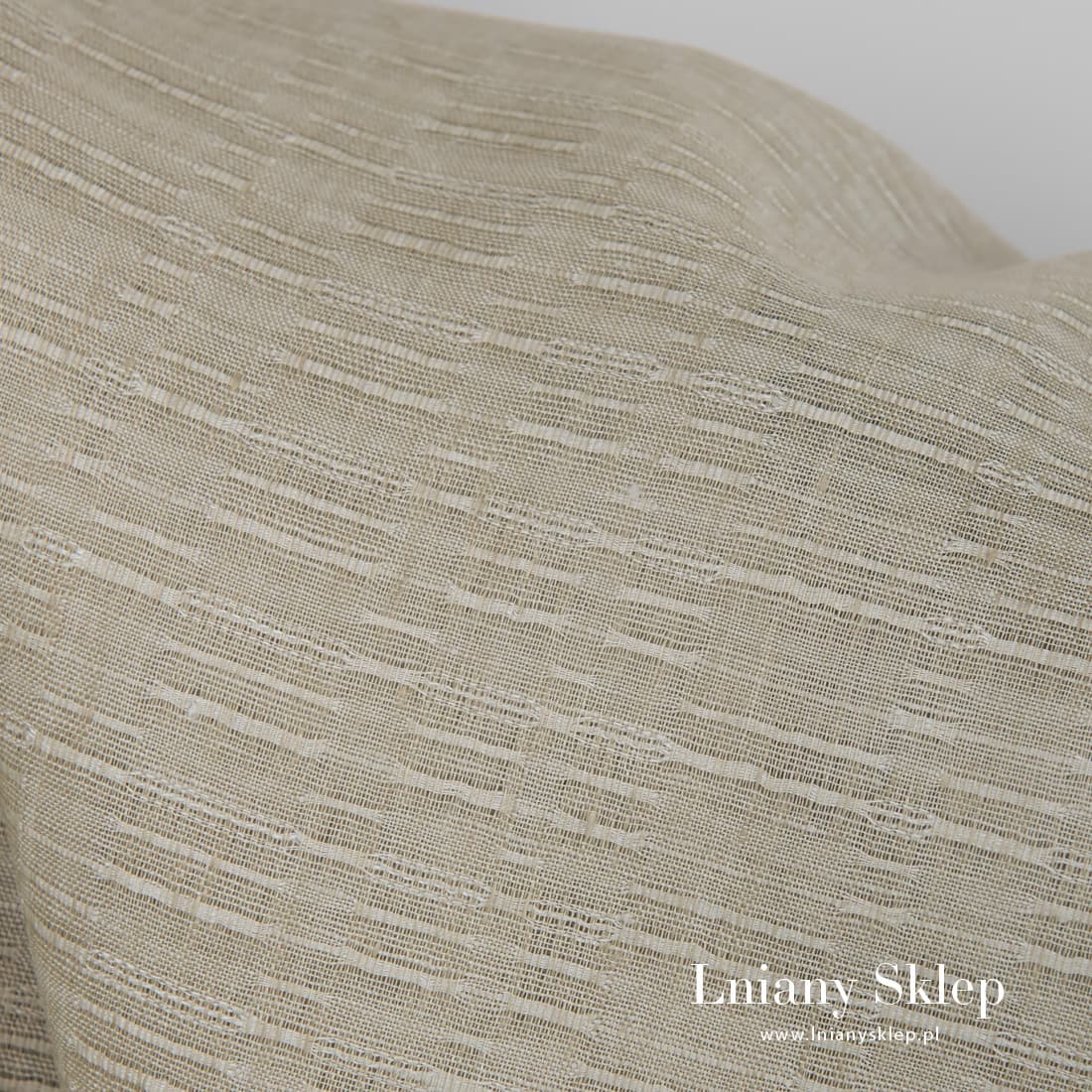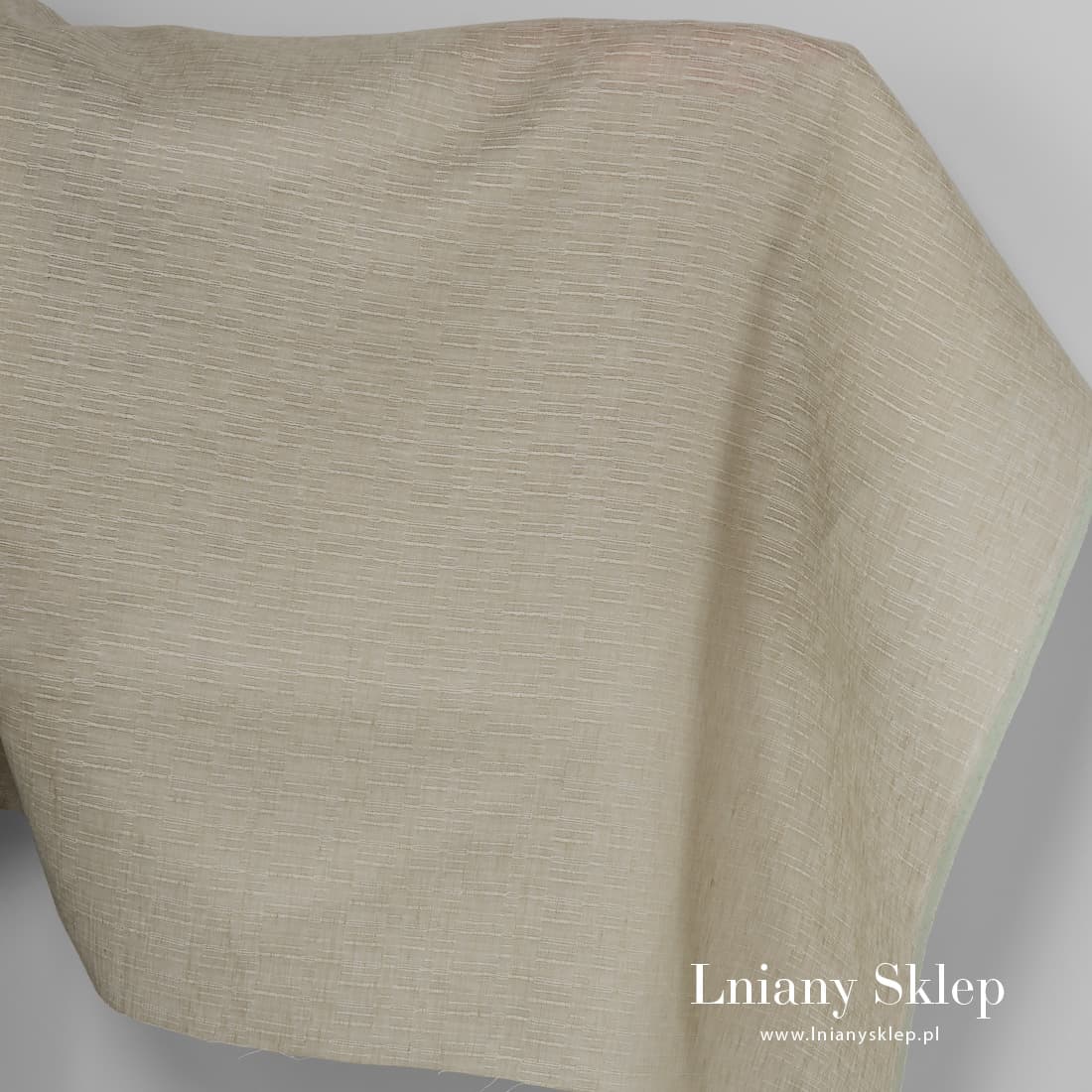 Piaskowa tkanina lniana w nieregularne paski wytkana z przędzy piaskowej o zielonkawym odcieniu i szarej. Paski rozrzucane są nieregularnie i biegną poziomo. Tkanina na szycie tekstyliów domowych.