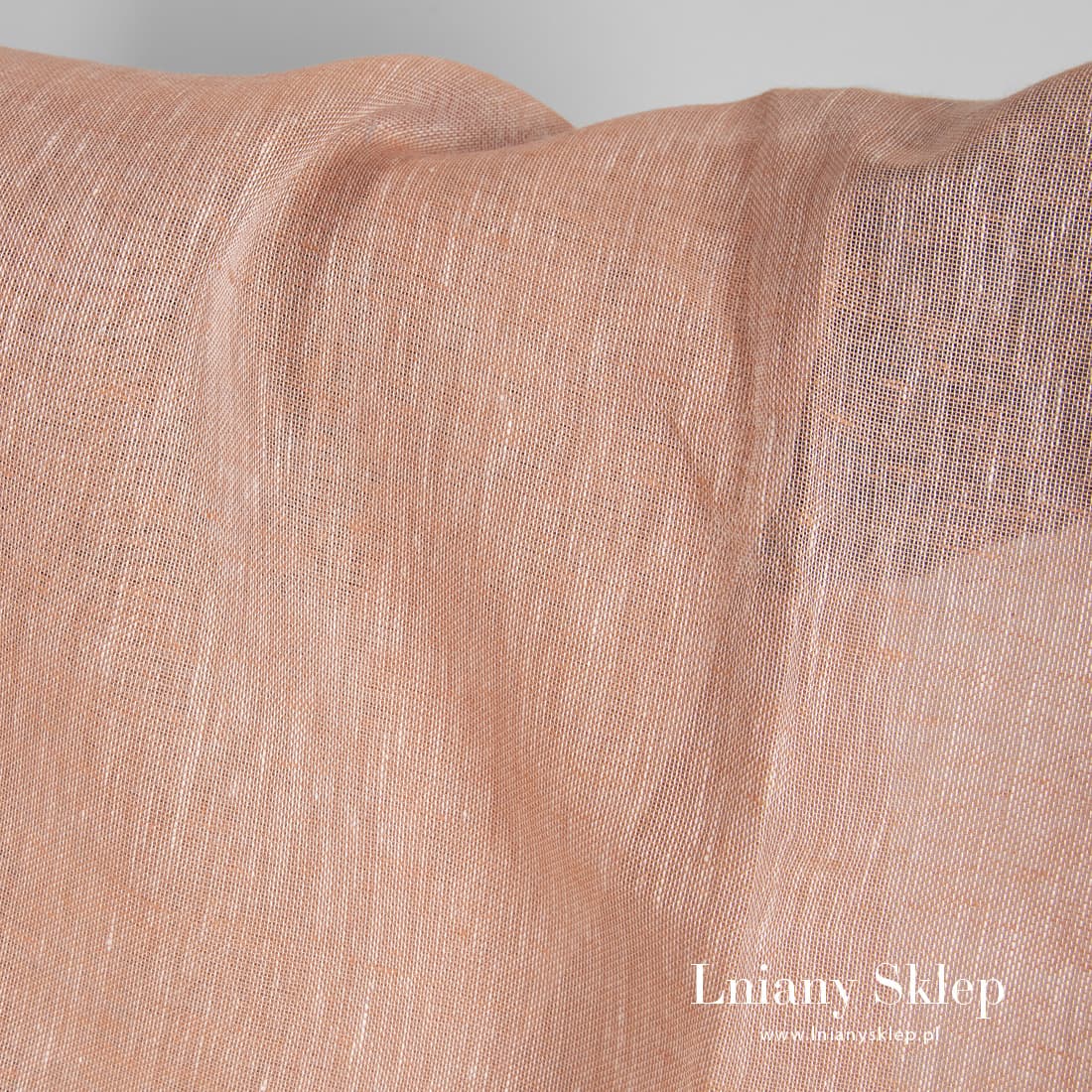 Przeźroczysta brzoskwiniowa tkanina. Mocna, rzadko, melanżowo wytkana melanżowo z przędzy różowej i białej, lekka tkanina 100% lniana na firanki i inne lekkie produkty.