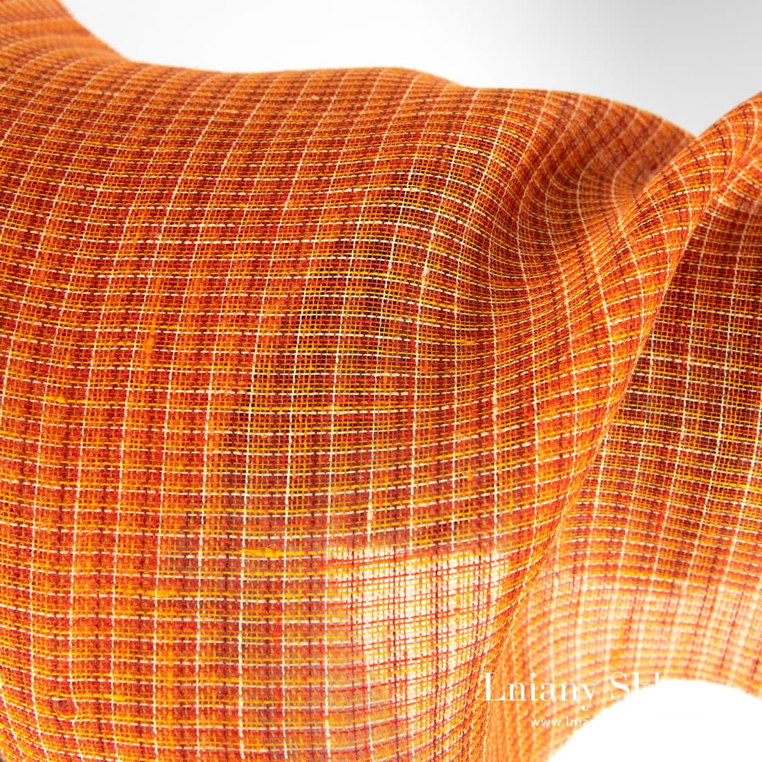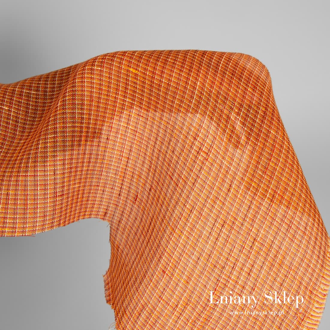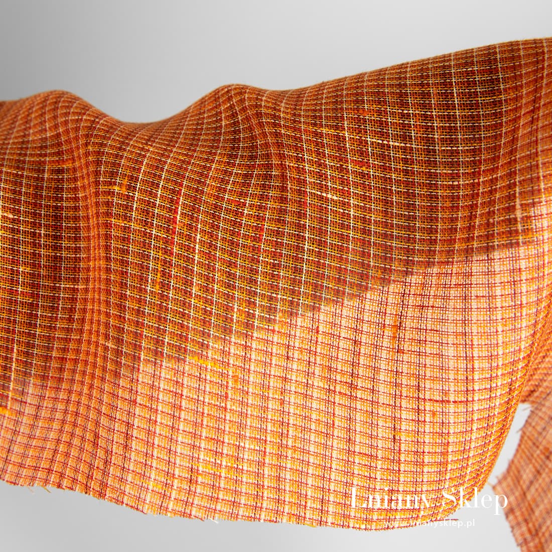 Przeźroczysty pomarańczowy w krateczkę len wytkany z przędz o kilku pomarańczowych odcieniach oraz czerwonej, brązowej i jasnobeżowej. Rzadko tkana, leciutka tkanina na szycie szaliczków, firanek i elementów dekoracyjnych.
