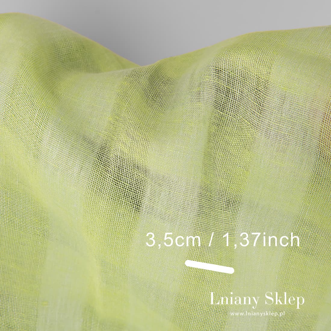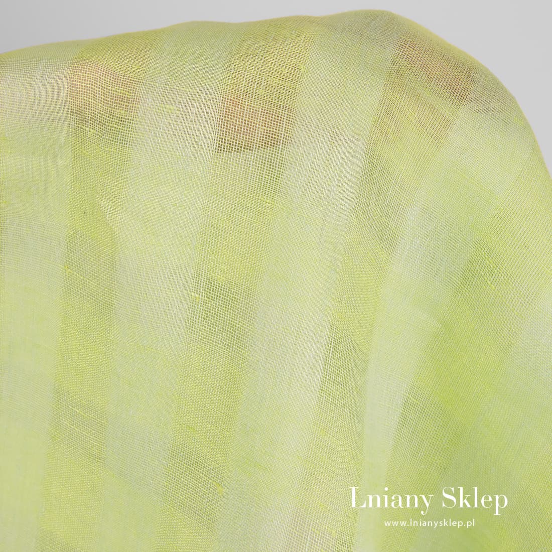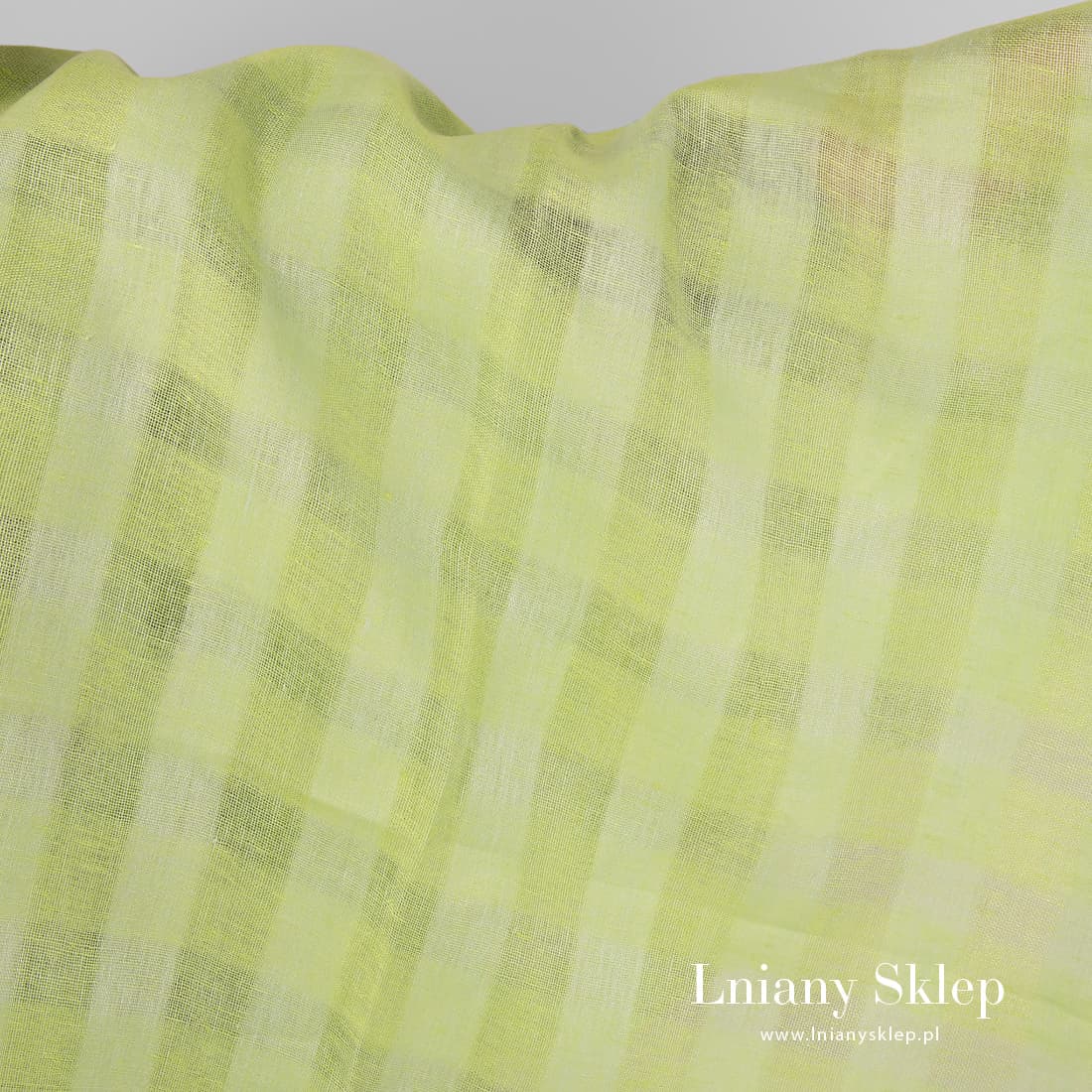 Sałatowy len w przeźroczystą kratkę. Tkanina wytkana w przecinające się pasy o różnej gęstości. Wykorzystane przędze: jasnozielona i jasna miętowa. Len 100% na firanki i szaliczki.