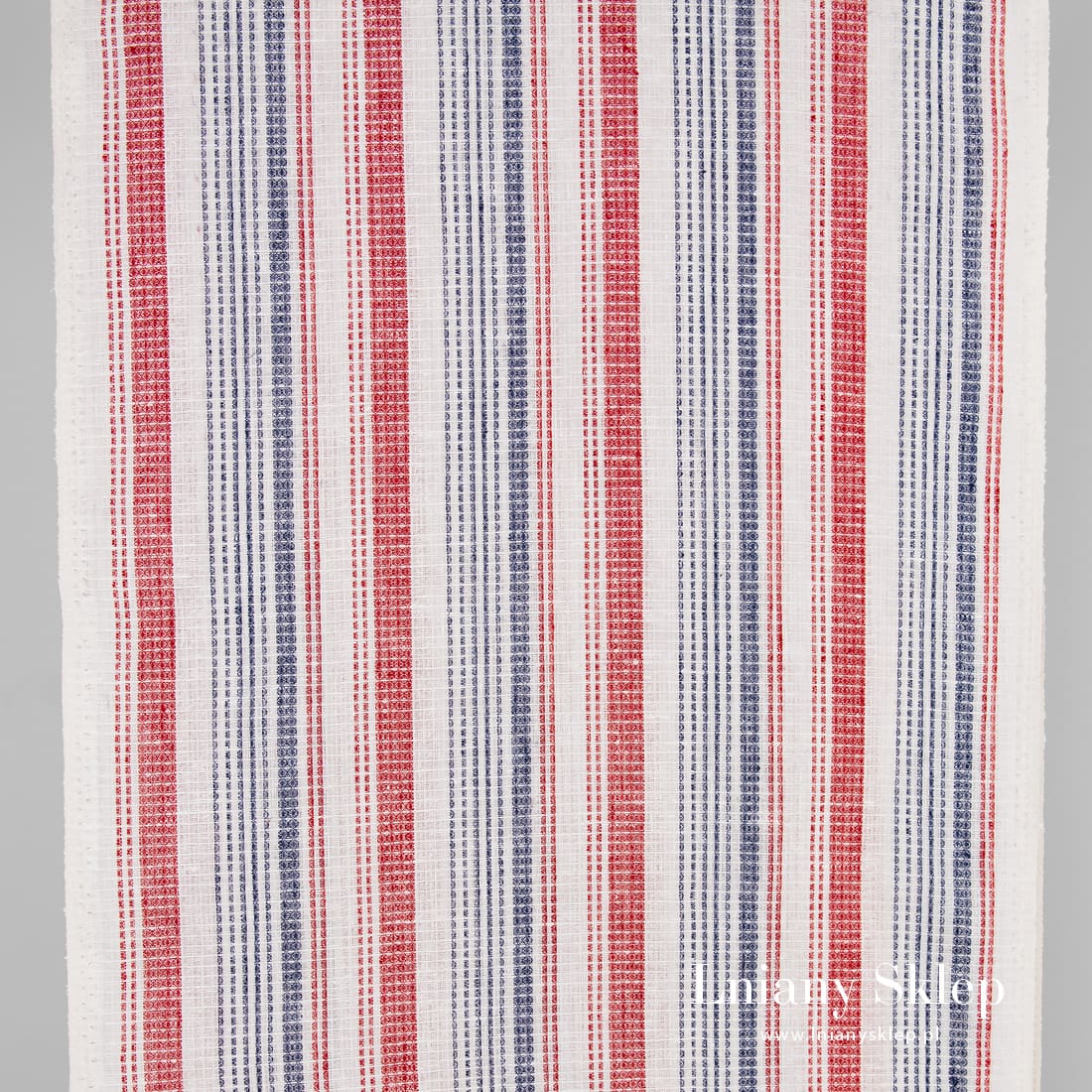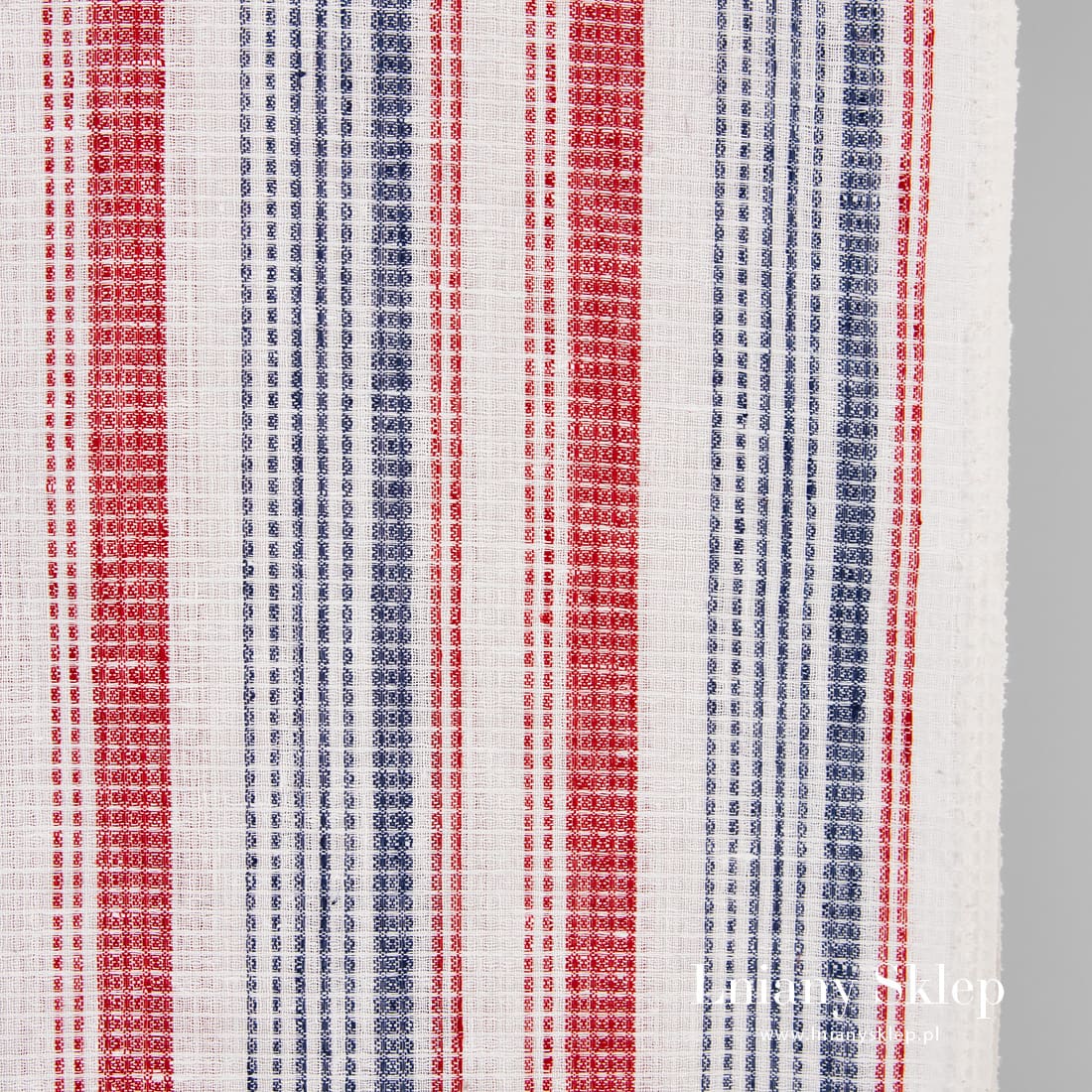 • Tkanina lniana w paski czerwone i granatowe.