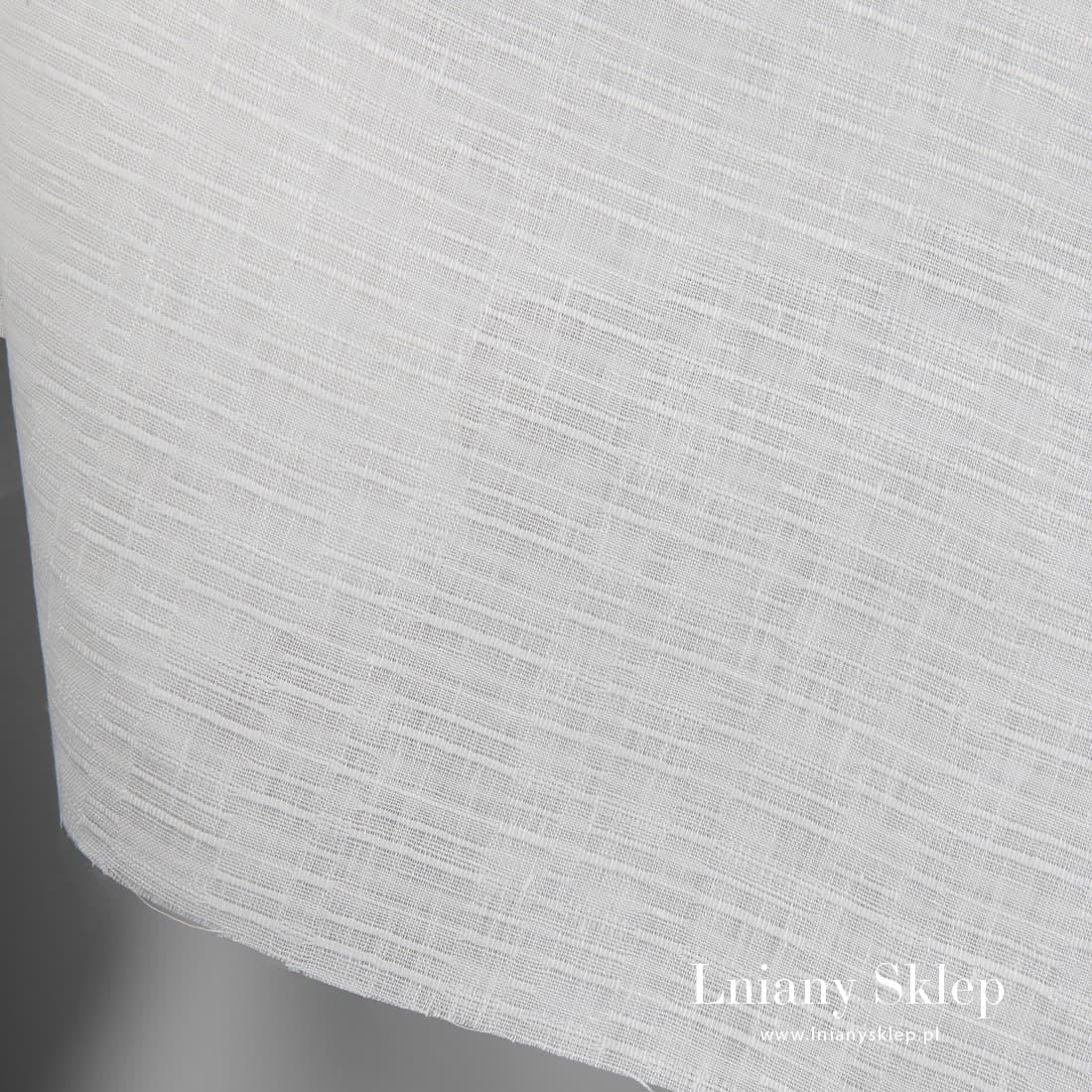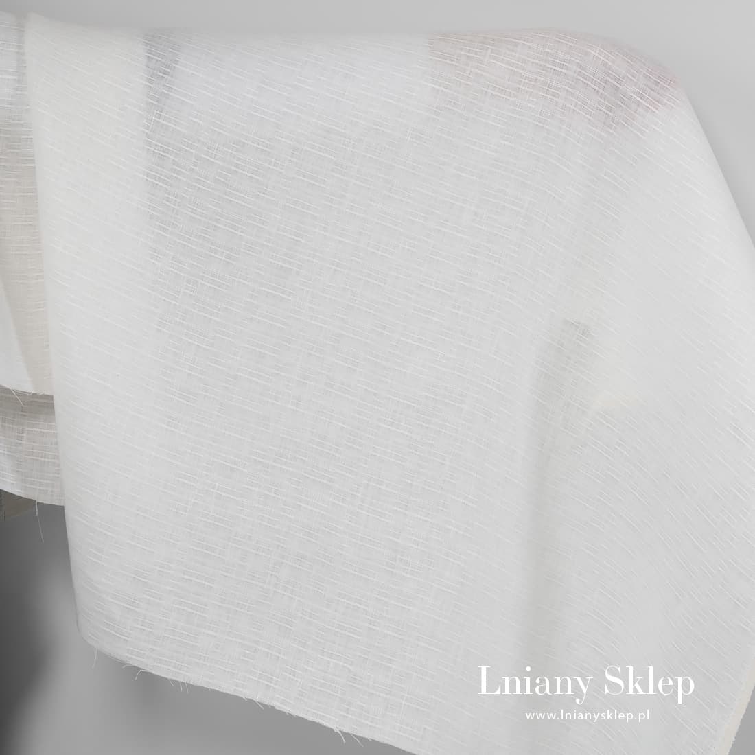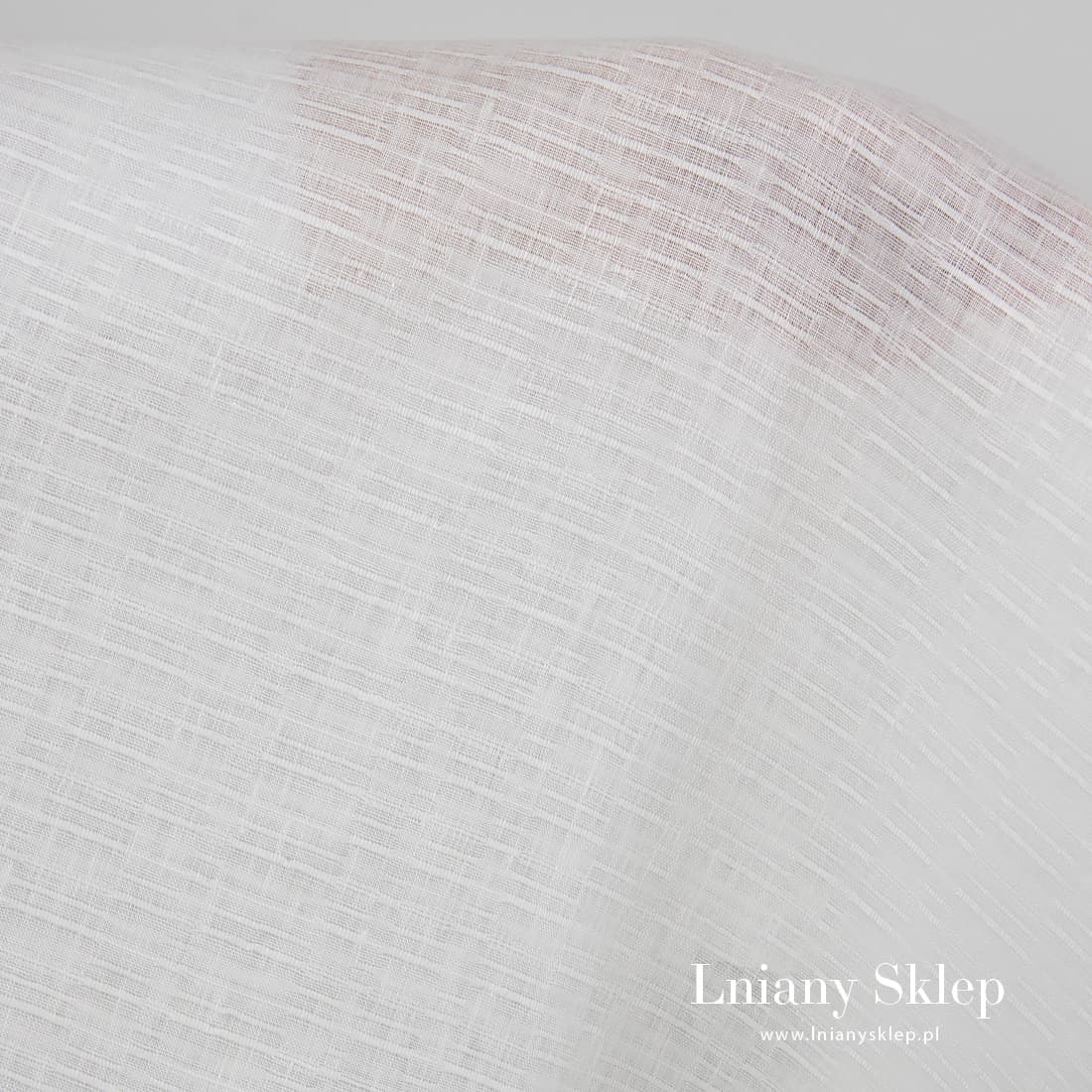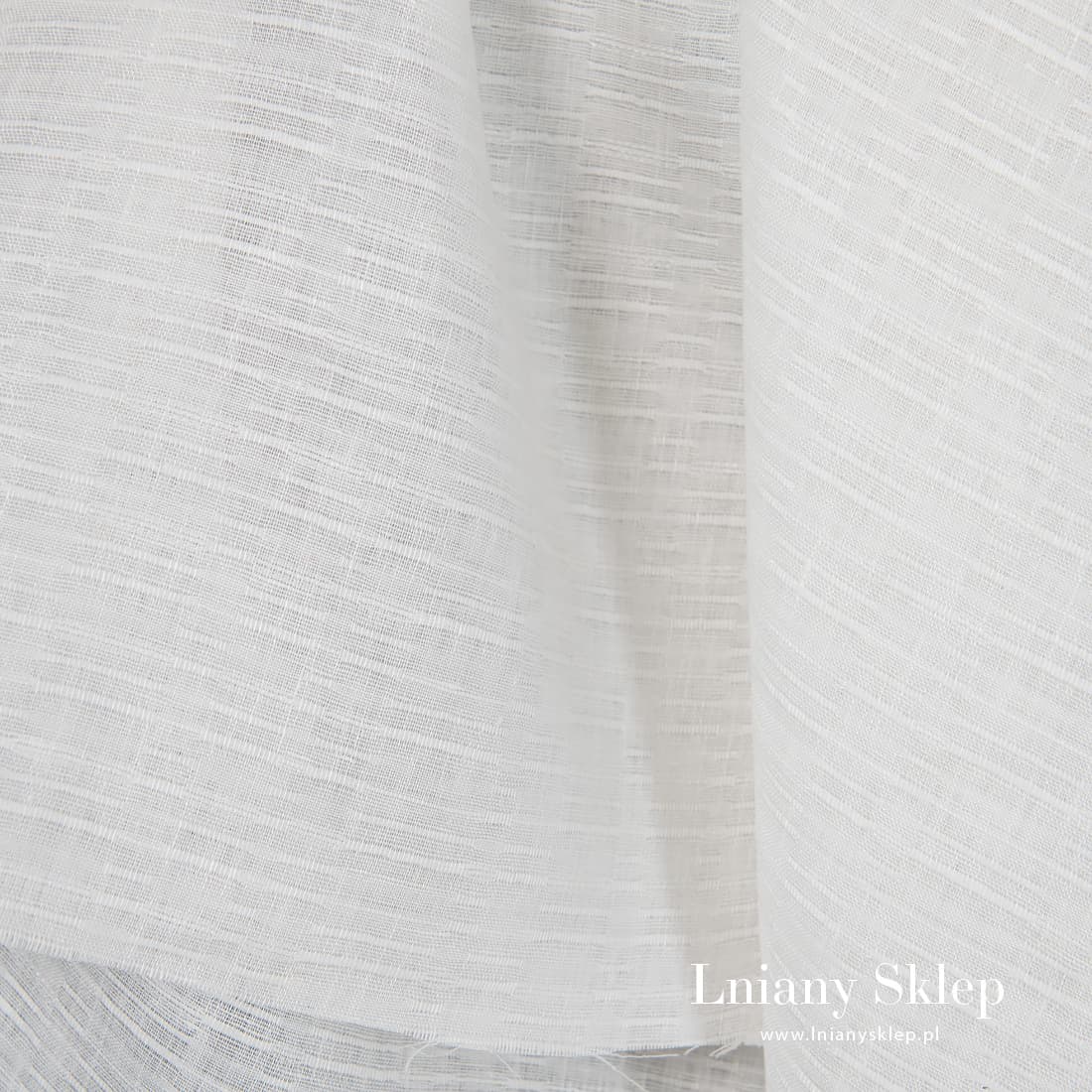 Śnieżnobiała tkanina lniana w nieregularne paski rozrzucane nieregularnie i biegną poziomo. Dość lekka tkanina na szycie tekstyliów domowych.