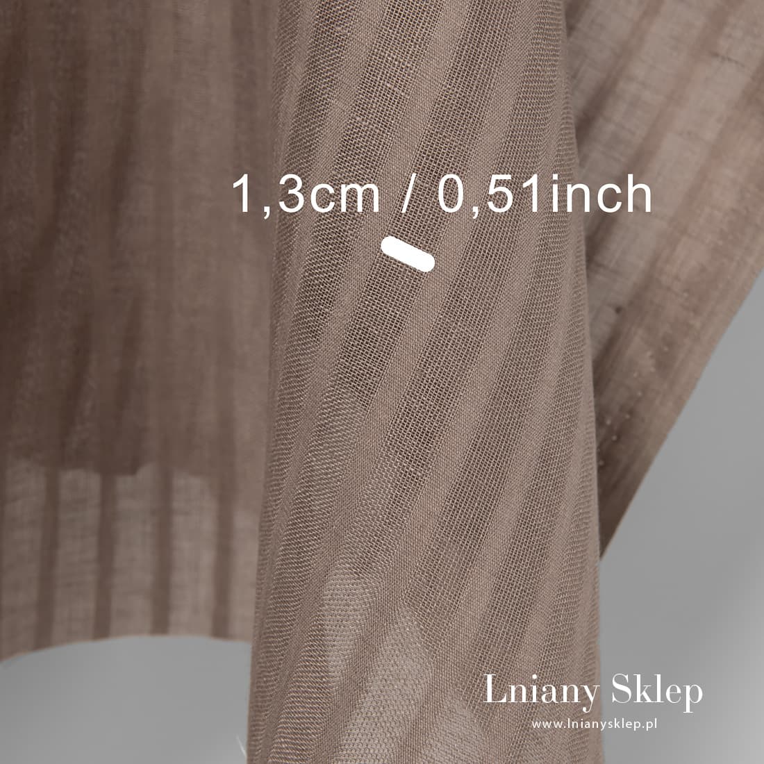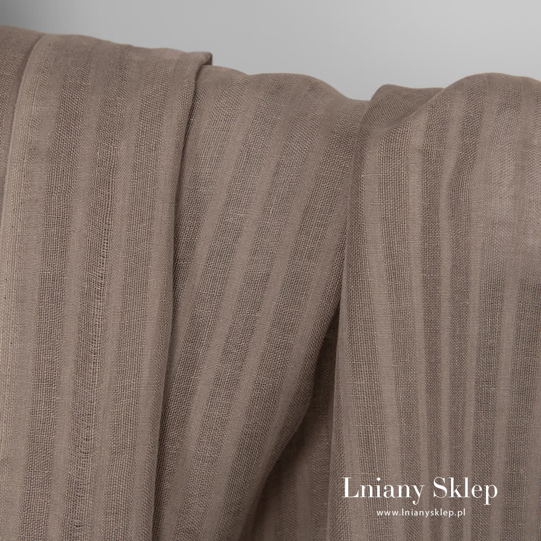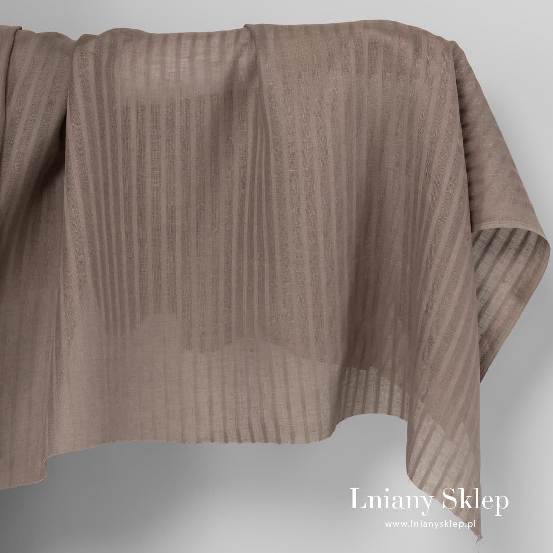 Szara w brąz tkanina w paski wytkane gęściej i rzadziej. Paski biegną pionowo. Lekka tkanina pasuje na szycie firanek, obrusów, szaliczków i in.