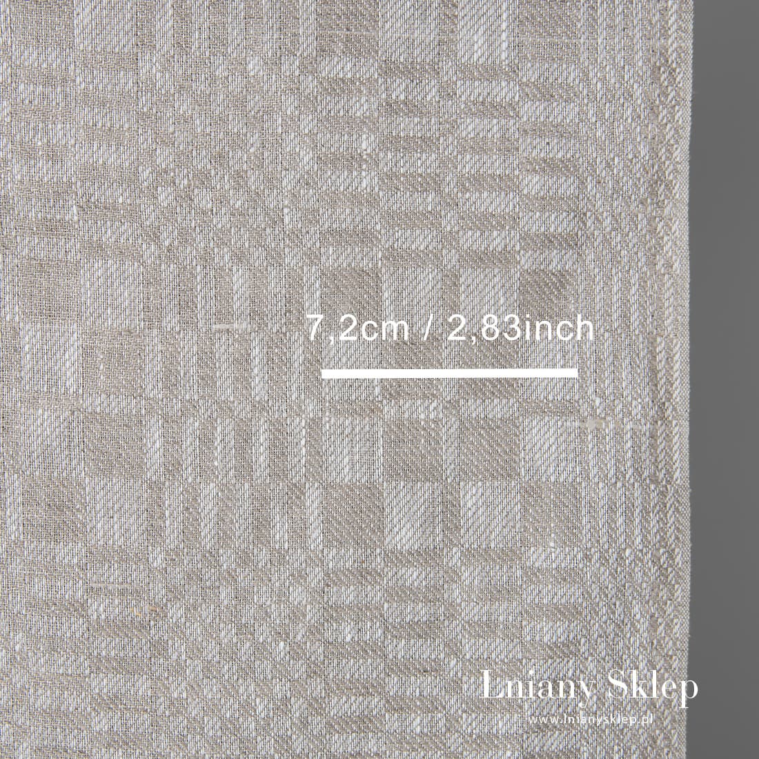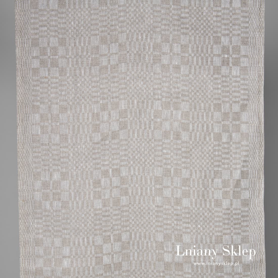 Szara w kratkę tkanina lniana na ścierki i ręczniczki kuchenne wytkana z szarej oraz niebarwionej, naturalnej przędzy lnianej. Gęsta i mocna tkanina lniana.